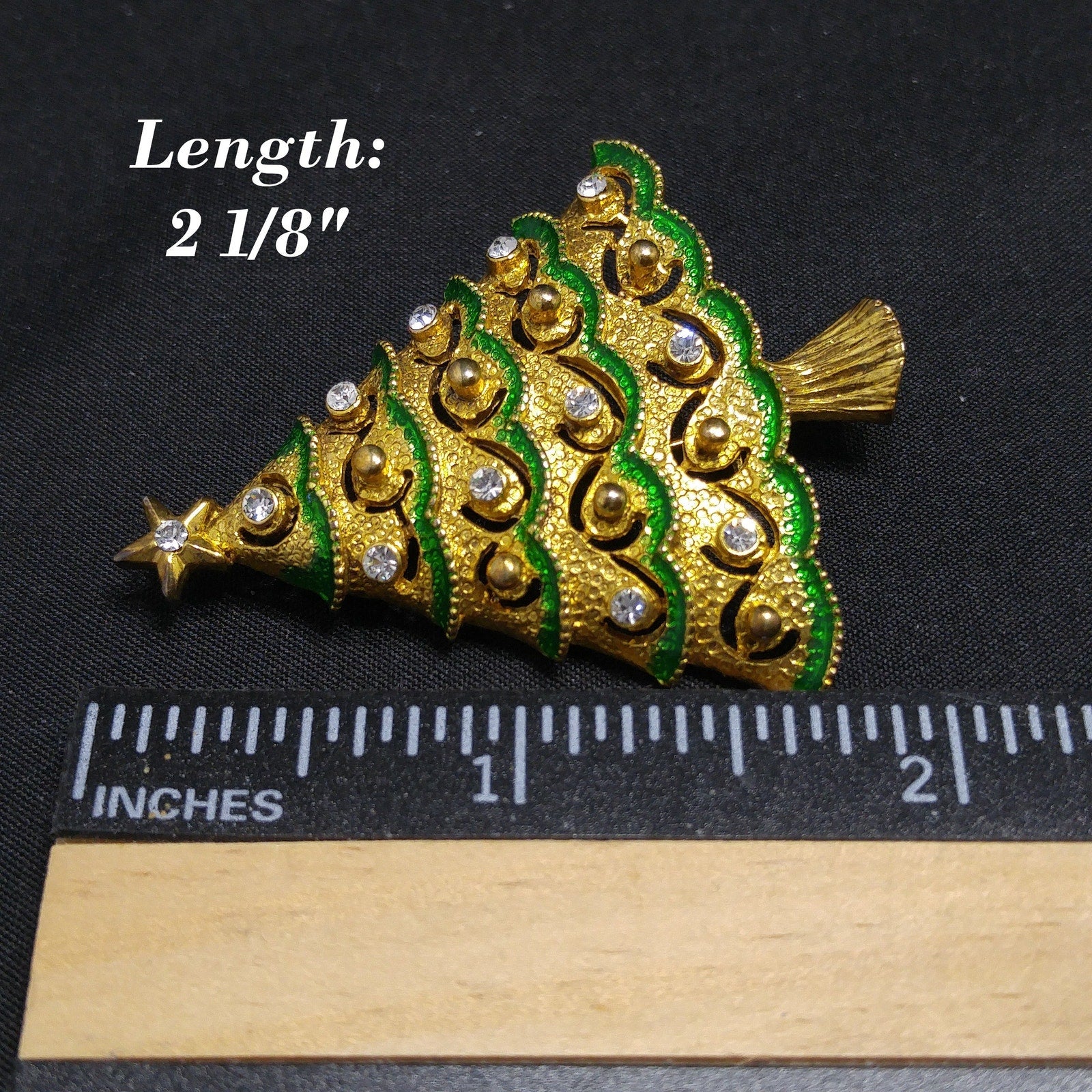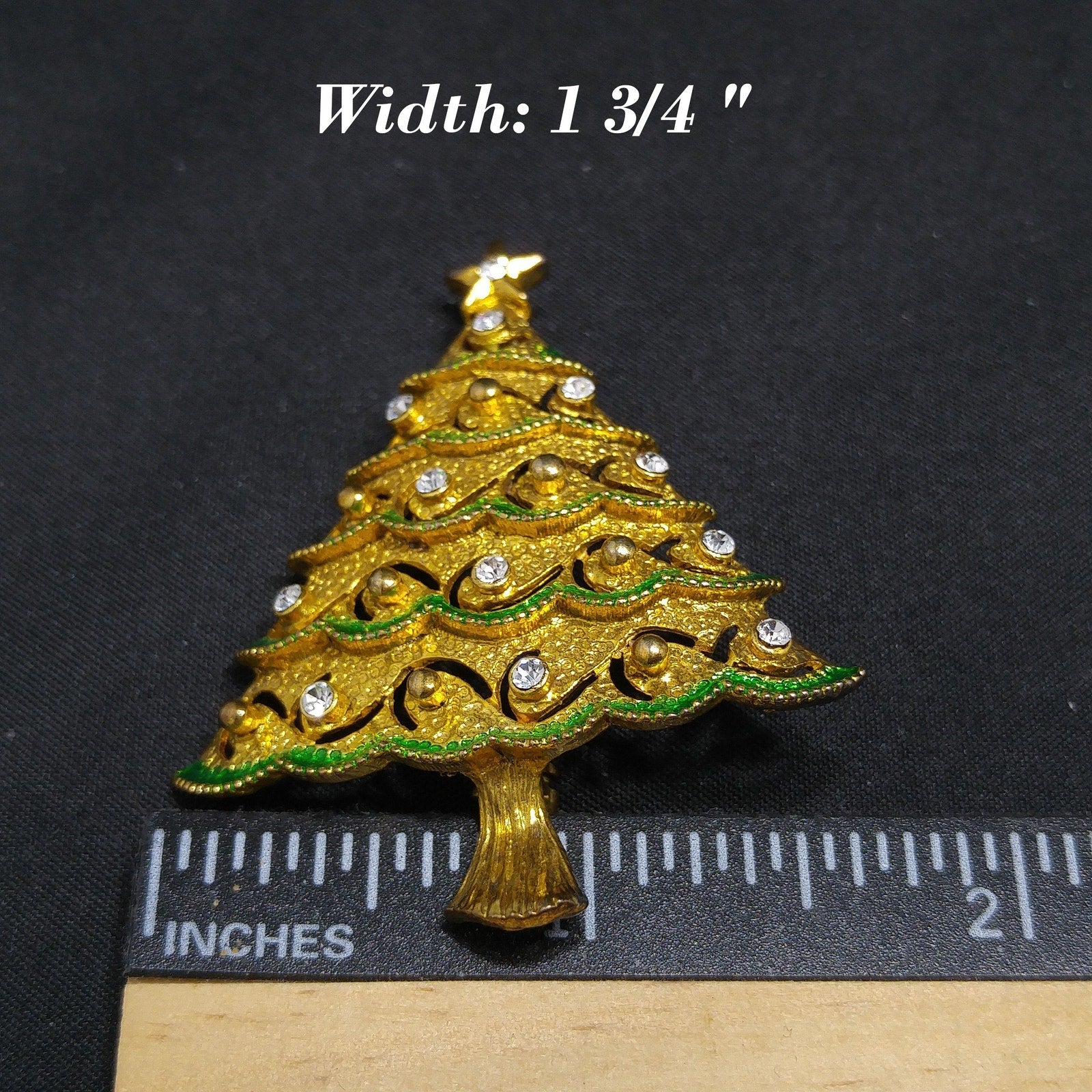 This is a beautiful vintage Eisenberg Ice Christmas tree brooch from the late 20th century. The brooch features a tiered gold-tone tree design with sparkling clear rhinestones and green enamel accents, topped with a star. Eisenberg Ice is renowned for high-quality holiday jewelry, and this brooch is a classic example of their craftsmanship. Perfect for the holiday season, collectors, or as a thoughtful vintage gift.