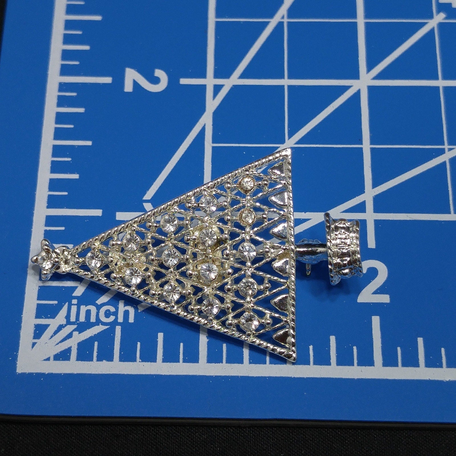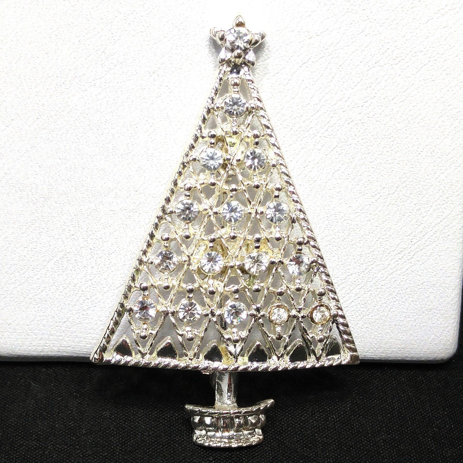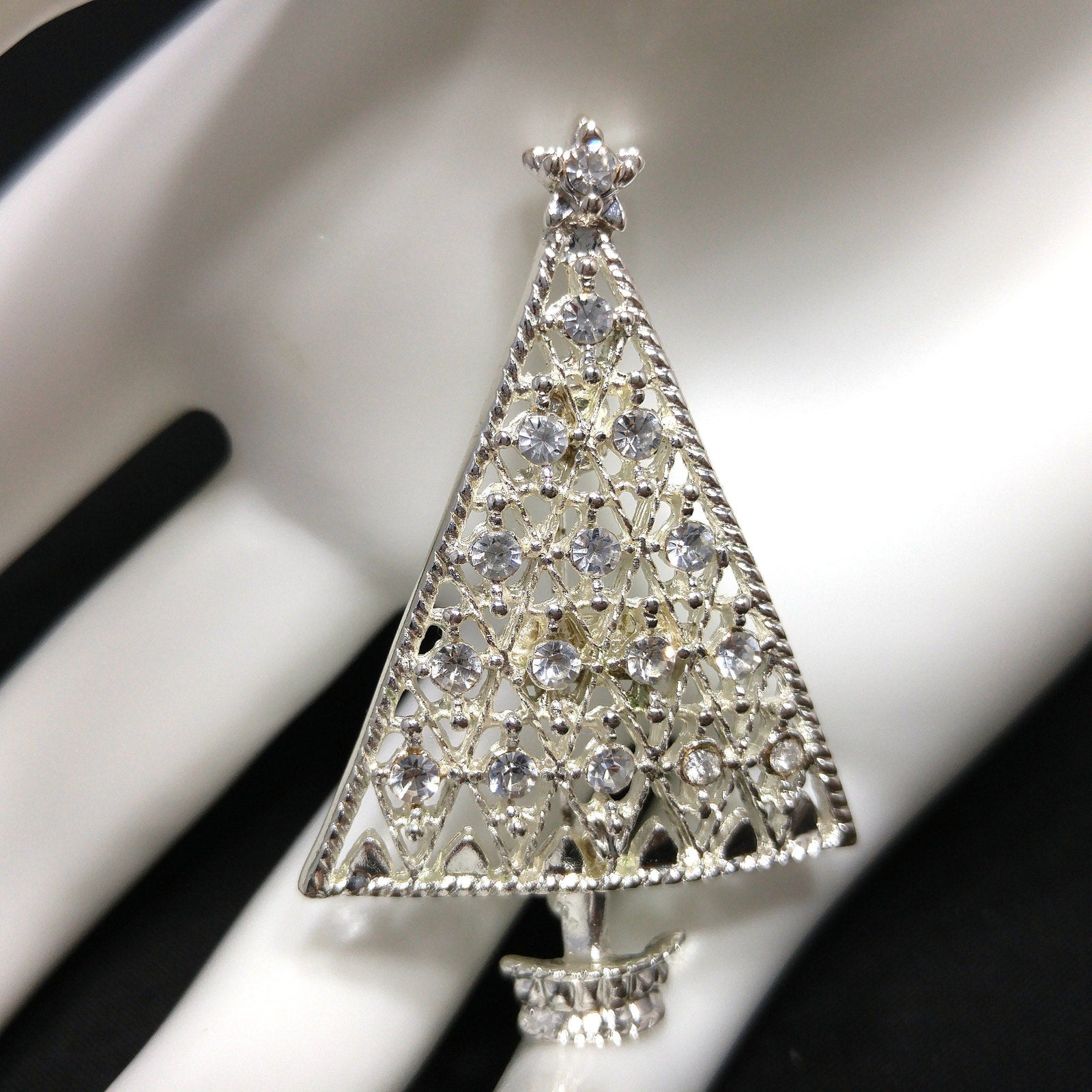 This is a beautiful Eisenberg Ice Christmas Tree brooch in silver tone, accented with sparkling clear rhinestones throughout the tree. Topped with a rhinestone star, this festive design is both elegant and collectible, making it a timeless holiday accessory.