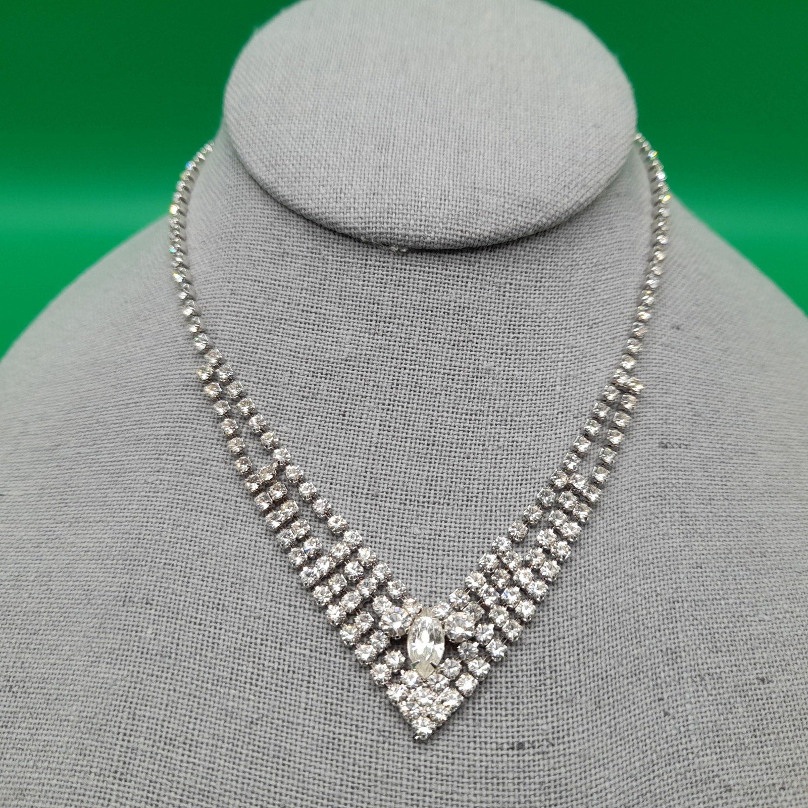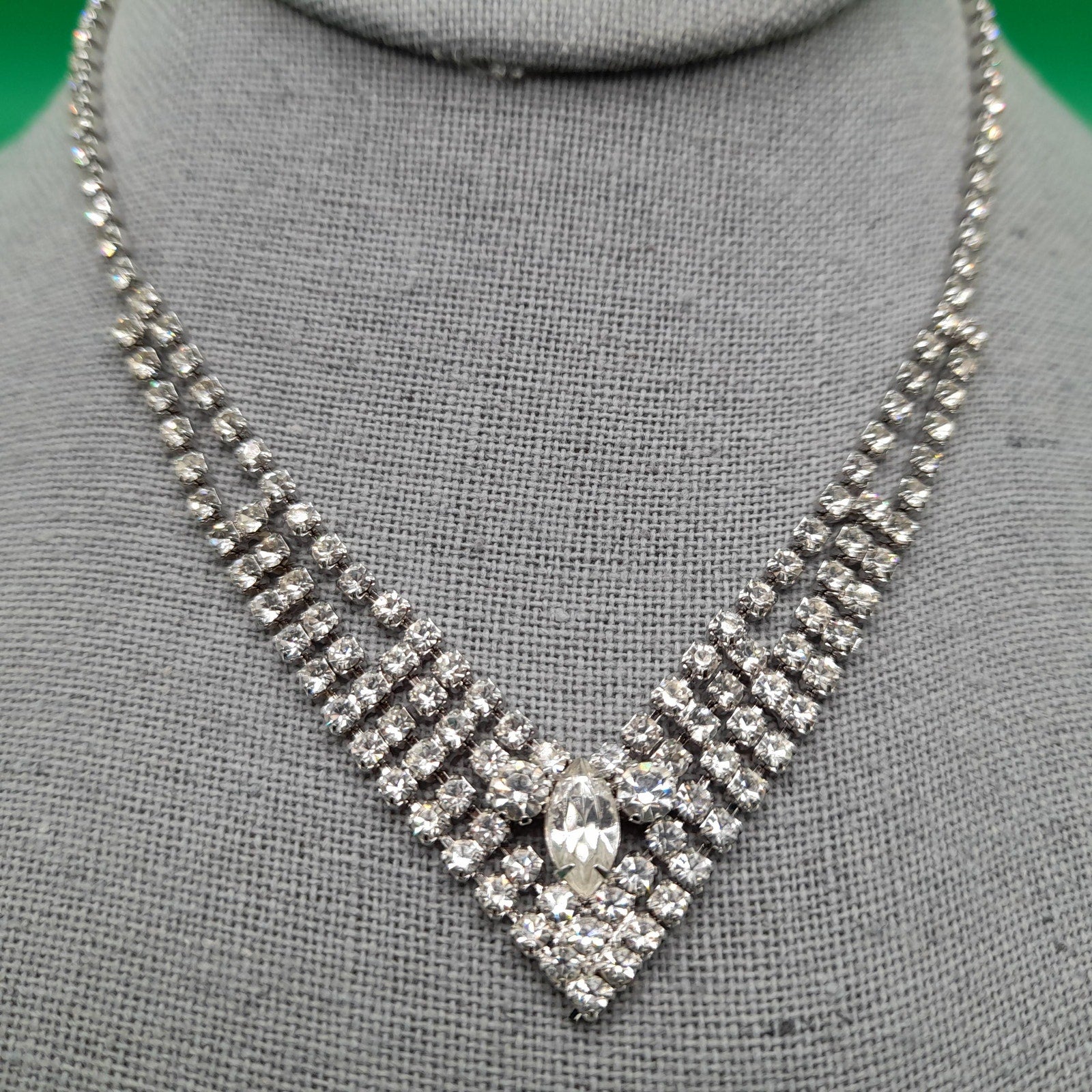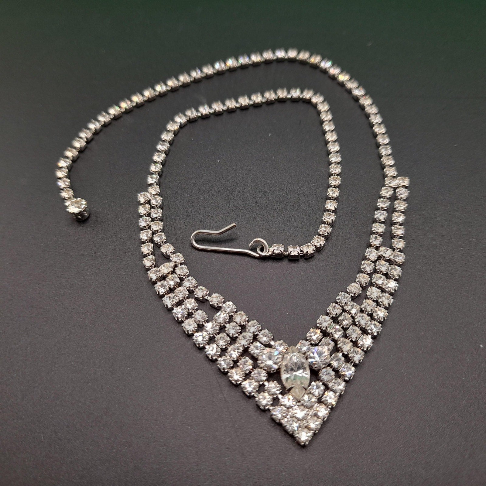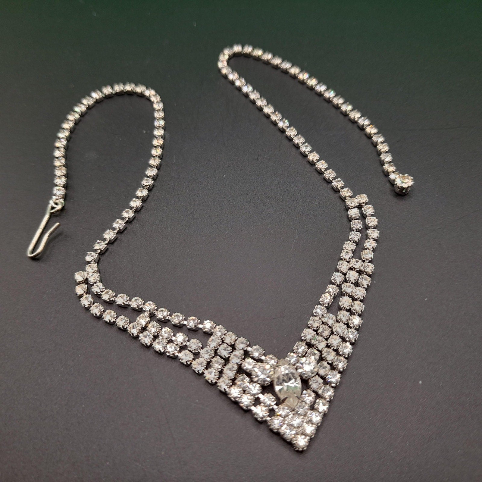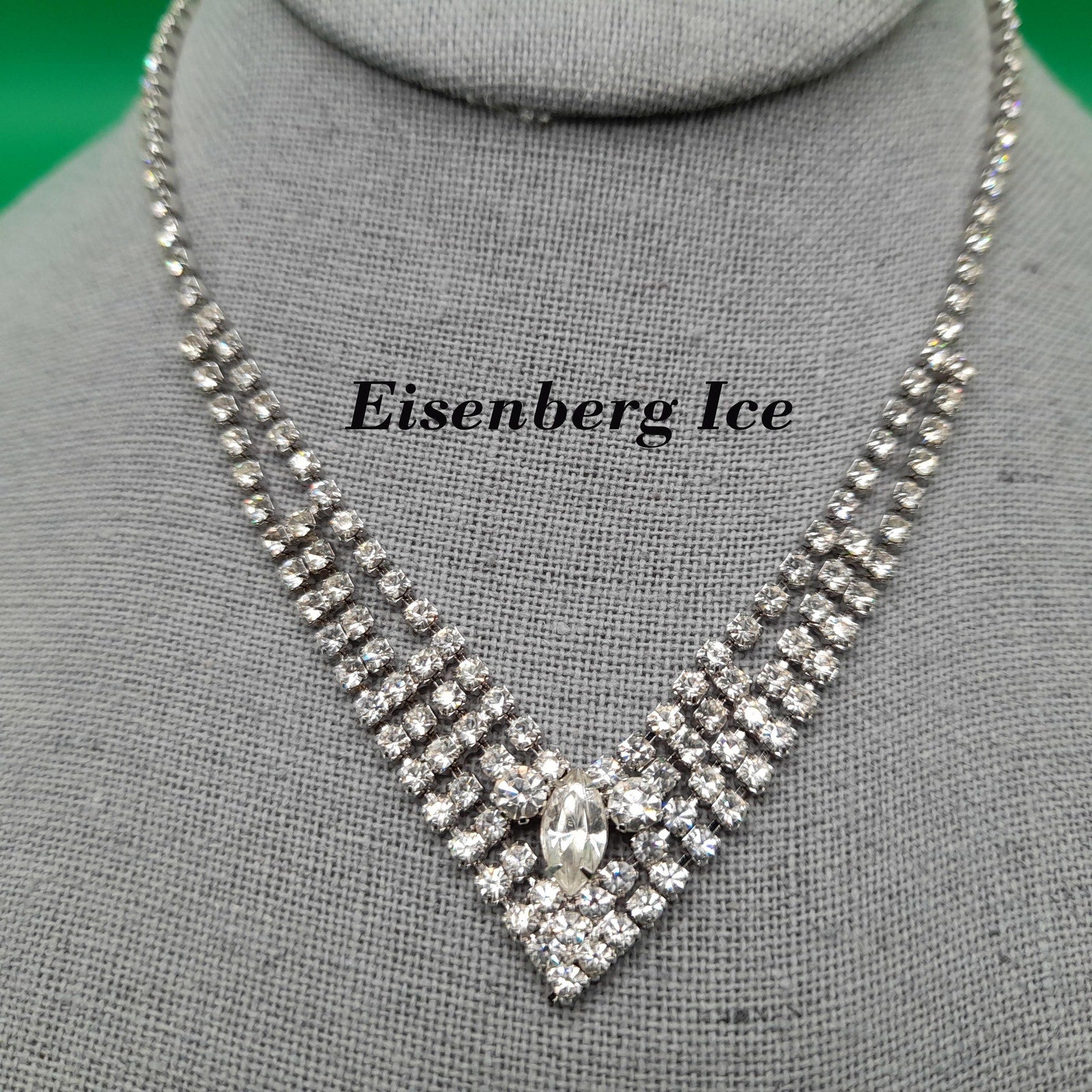 *Description: This is a beautiful Eisenberg Ice clear rhinestone choker necklace with rhodium plating from around the 1960s. This gorgeous necklace would look wonderful at a wedding or any formal event. It has the wide rhinestone front with four layers of rhinestones with a larger rhinestone in the center in a v shape. The necklace is stamped Eisenberg Ice on the back with a raised cartouche. The hook clasp has an extension chain with a larger rhinestone on the end. The necklace is adjustable up to 15 inches. This would be a great addition to your vintage jewelry collection or make a great vintage gift!
