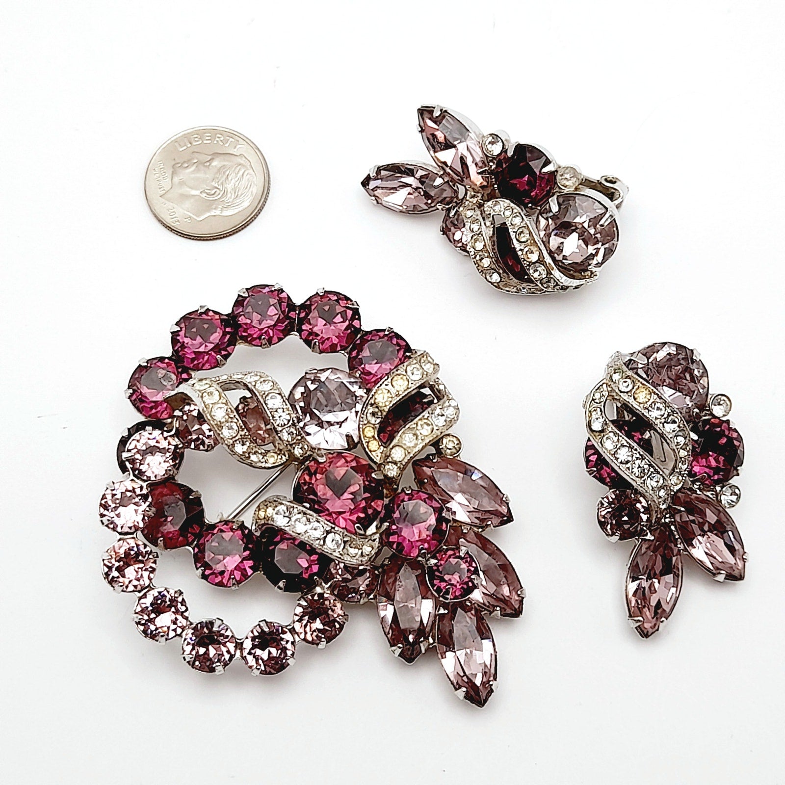 Eisenberg Purple Rhinestone Brooch & Earrings Set Vintage Rhodium Mid Century