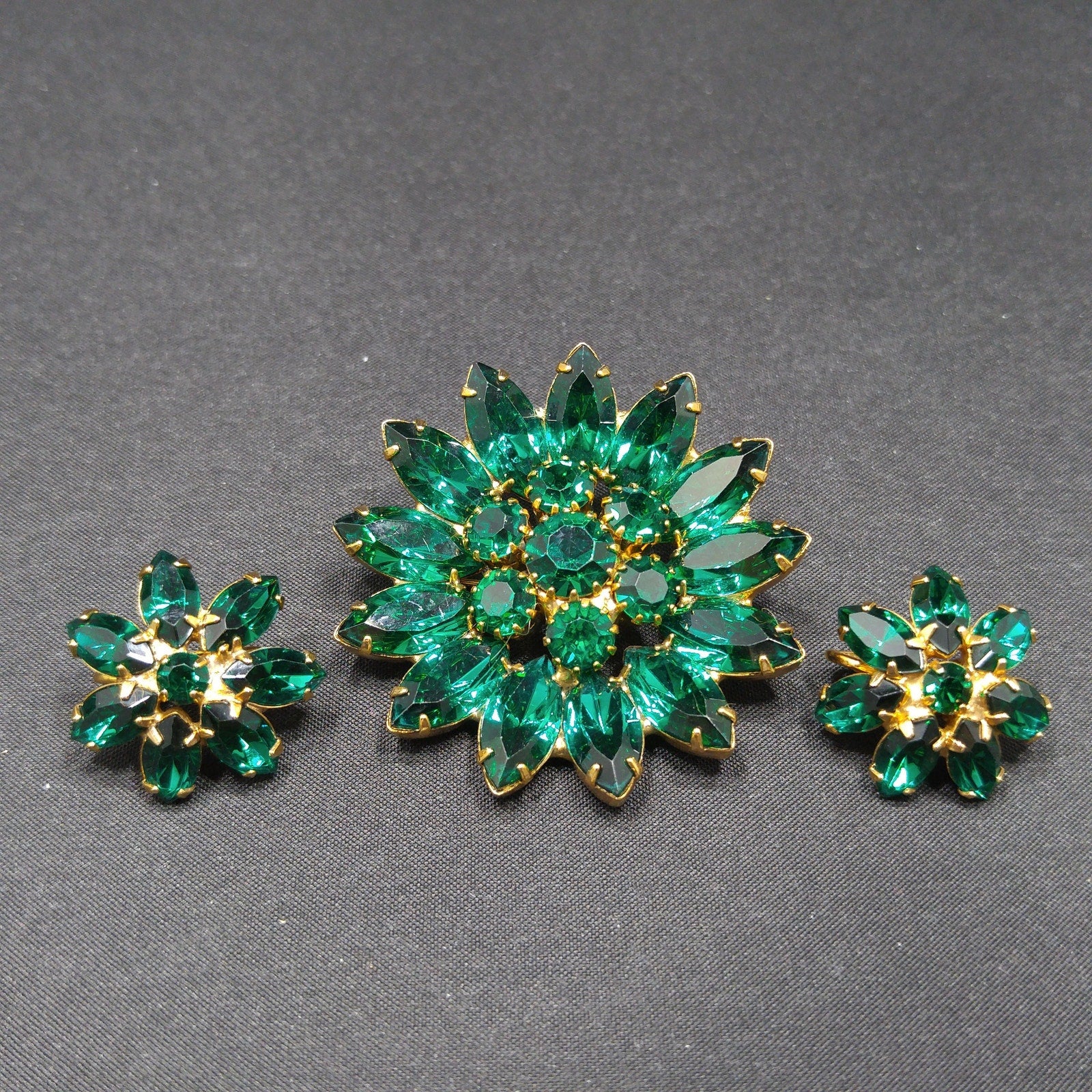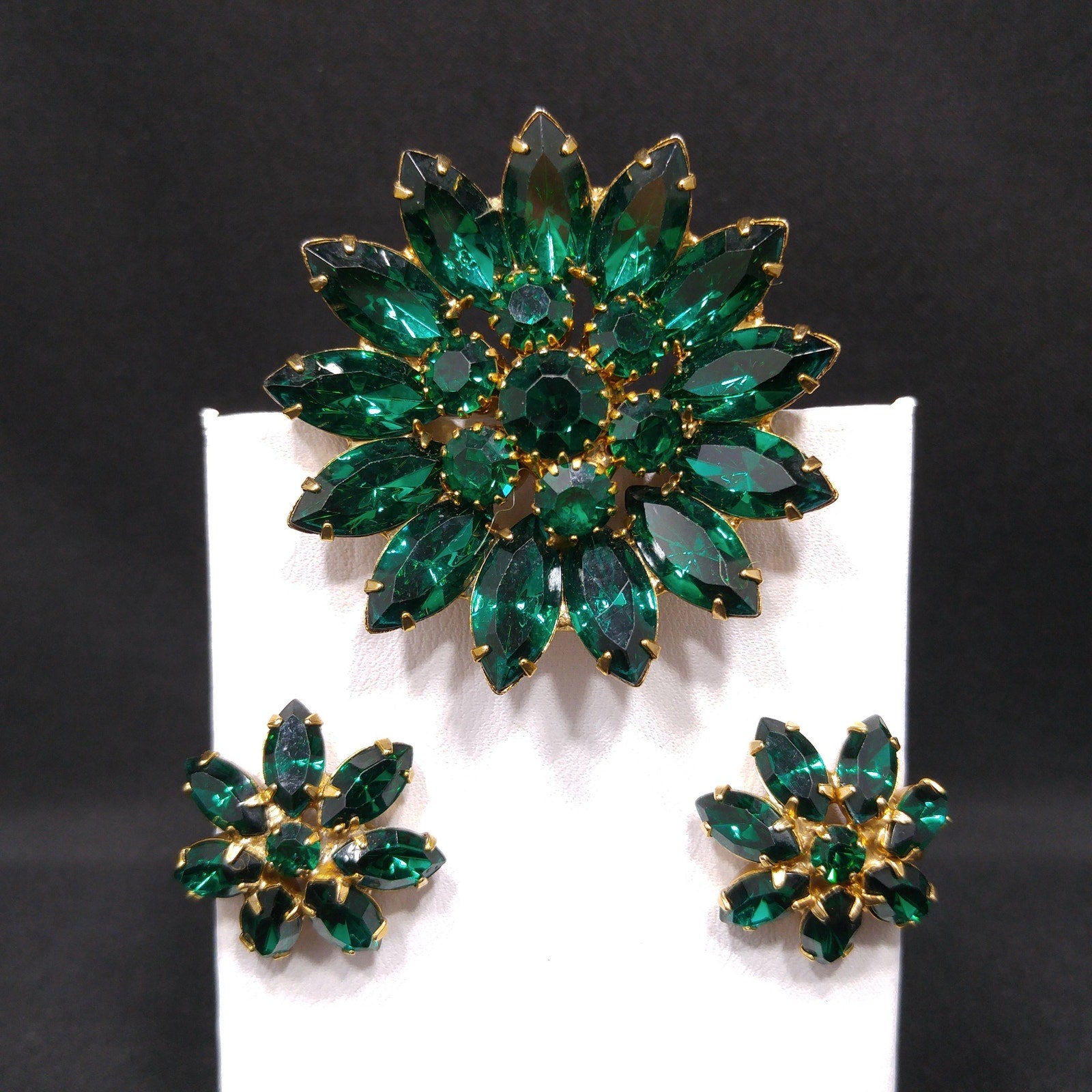 *Description: This is a beautiful emerald green rhinestone floral brooch and matching clip on earrings from the 1960s. The earrings and brooch are gold plated and both in emerald green flower designs. The brooch is a little under two inches and the earrings are a little under one inch. They would not be heavy on your clothing or ears and would make a great addition to your favorite outfit or a wonderful gift. This would be a great addition to your vintage jewelry collection or make a great vintage gift!