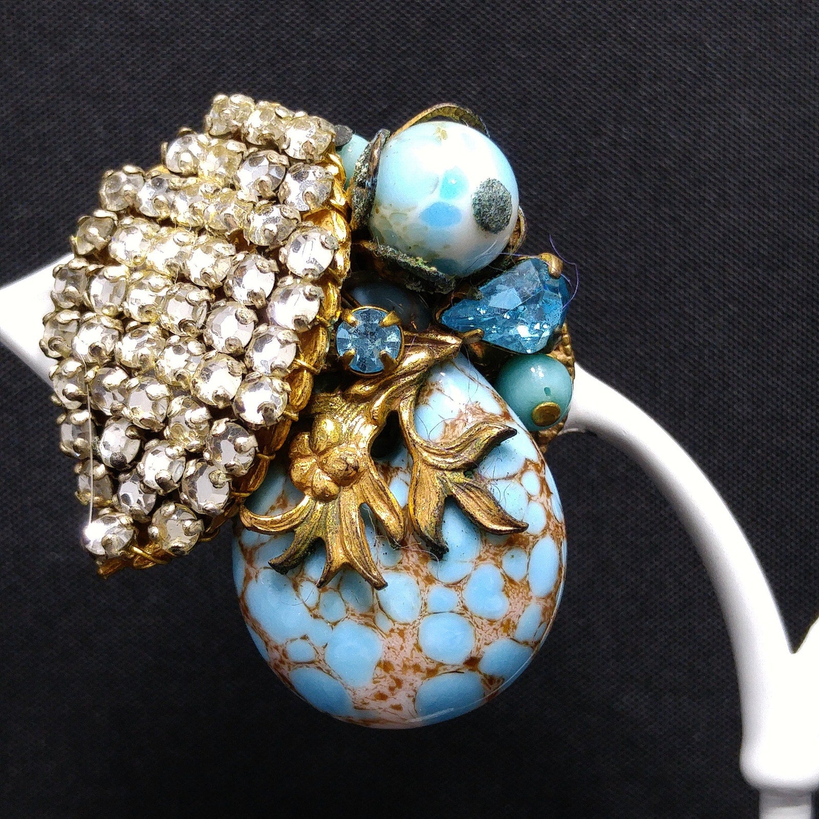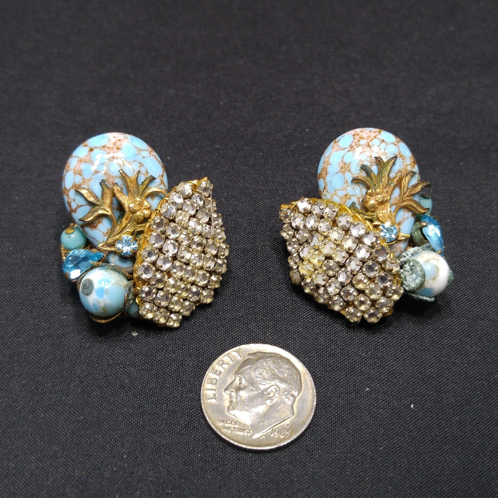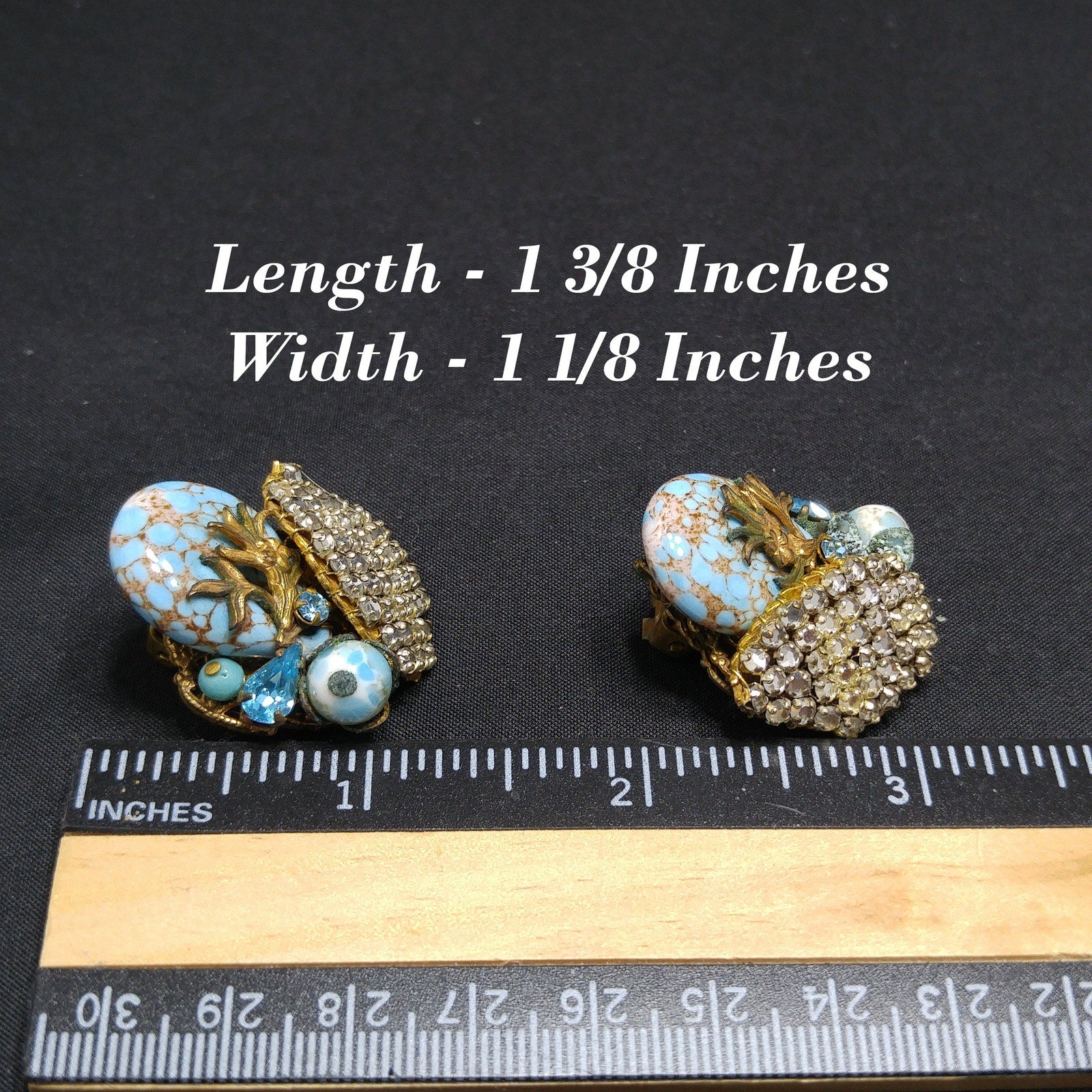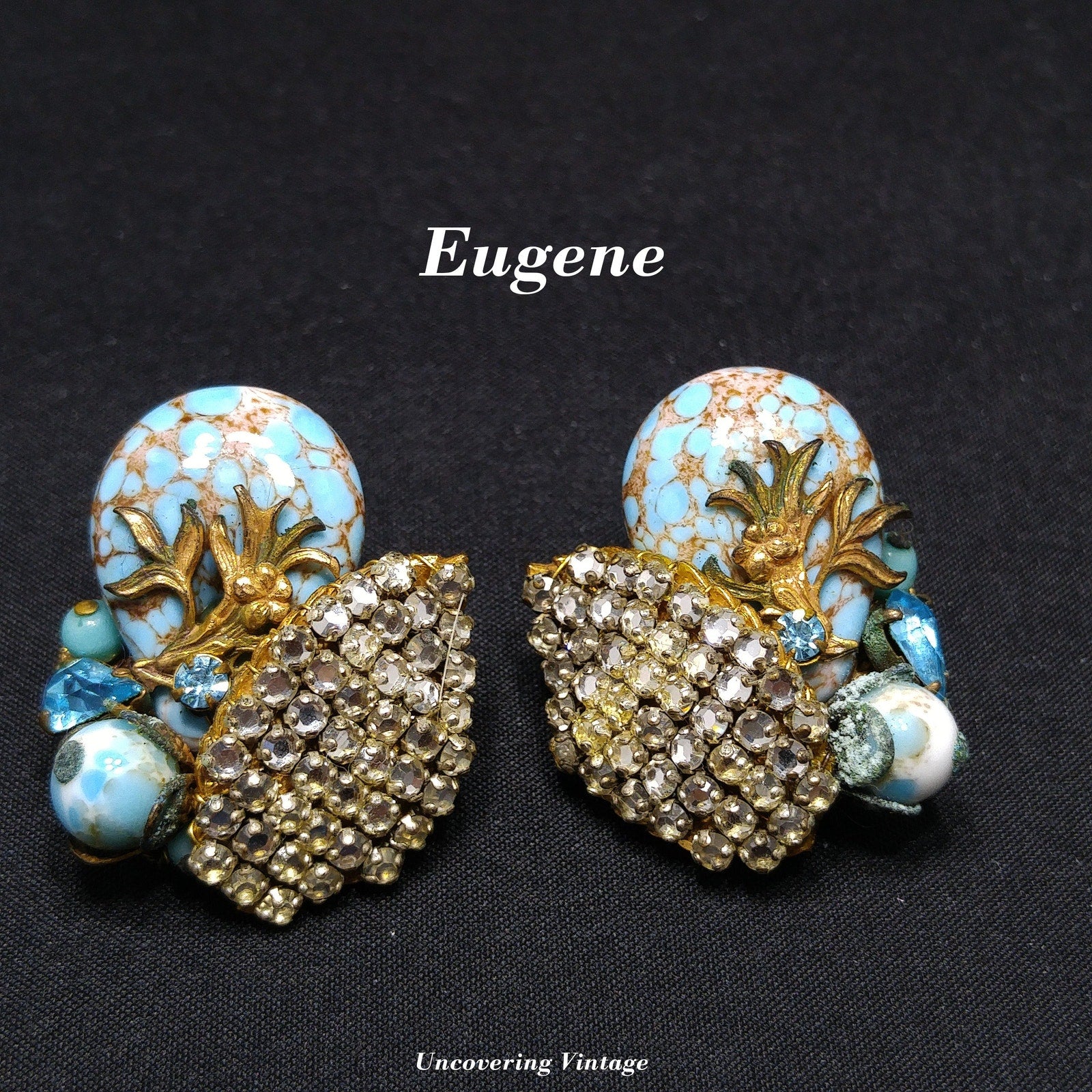 *Description: This is a unique pair of Eugene hand-made designer earrings from the 1950s. Eugene, according to his nephew, worked for Miriam Haskell and you definitely see the Miriam Haskell elements within the earrings. Each earring is designed on a filigree back and design elements are hand wired on the base. The earrings include clear rhinestones, foil Murano style glass, a pear shaped crystal in turquoise, and turquoise beads. Both earrings clasps are stamped Eugene. This would be a great addition to your vintage jewelry collection or make a great vintage gift!