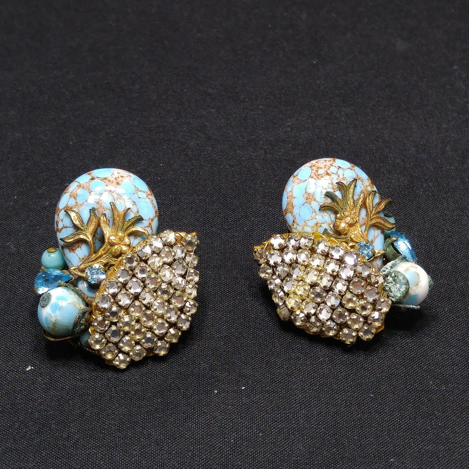 Eugene Rhinestone Art Glass Clip Earrings, Designed for Miriam Haskell, 1950s Vintage Jewelry