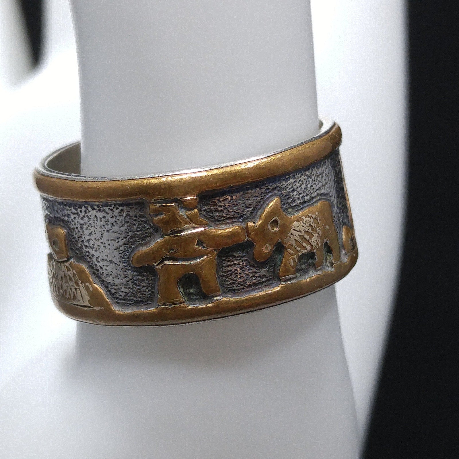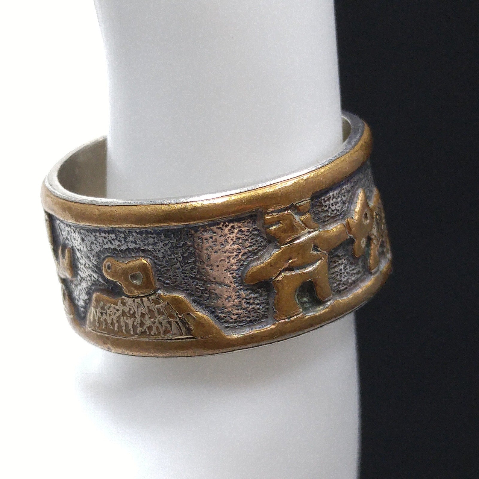 *Description: This is a storyteller ring by Navajo artists Floyd Becenti, Jr. and Lloyd Becenti at US size 8 1/2 from the late 1980s to 1990s. The ring is sterling and gold filled with the early hallmark B ¢ t on the inside, along with markings for sterling and gold filled. This would be a great addition to your vintage jewelry collection or make a great vintage gift!