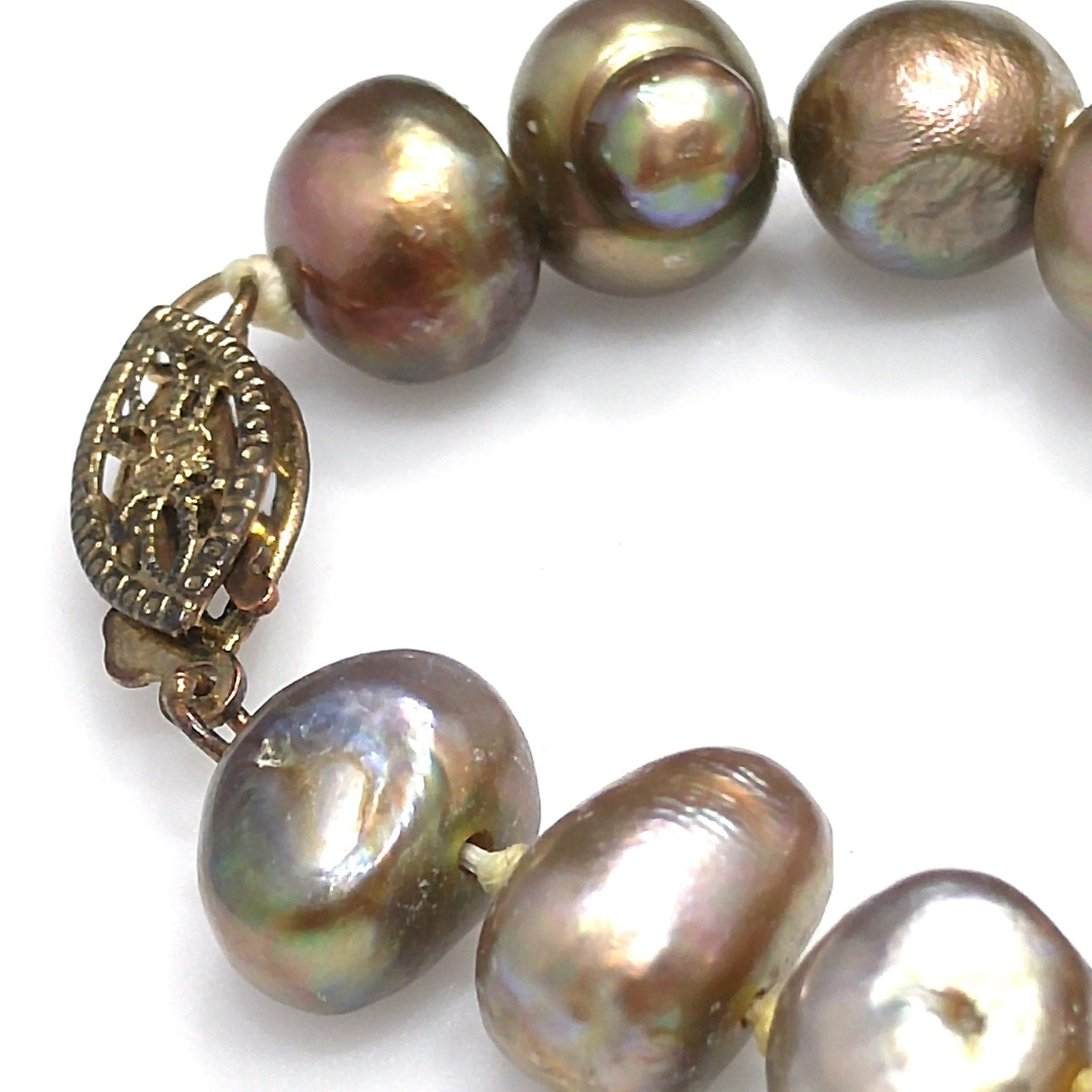 *Description: This is a beautiful fresh water pearl necklace, hand knotted, with a filigree clasp. The vintage clasp is filigree which you hook and push to close. The pearls are approximately 7mm and very non-uniform in shape. In the natural light there is an iridescent color at times to the pearls. This would be a great addition to your vintage jewelry collection or make a great vintage gift!