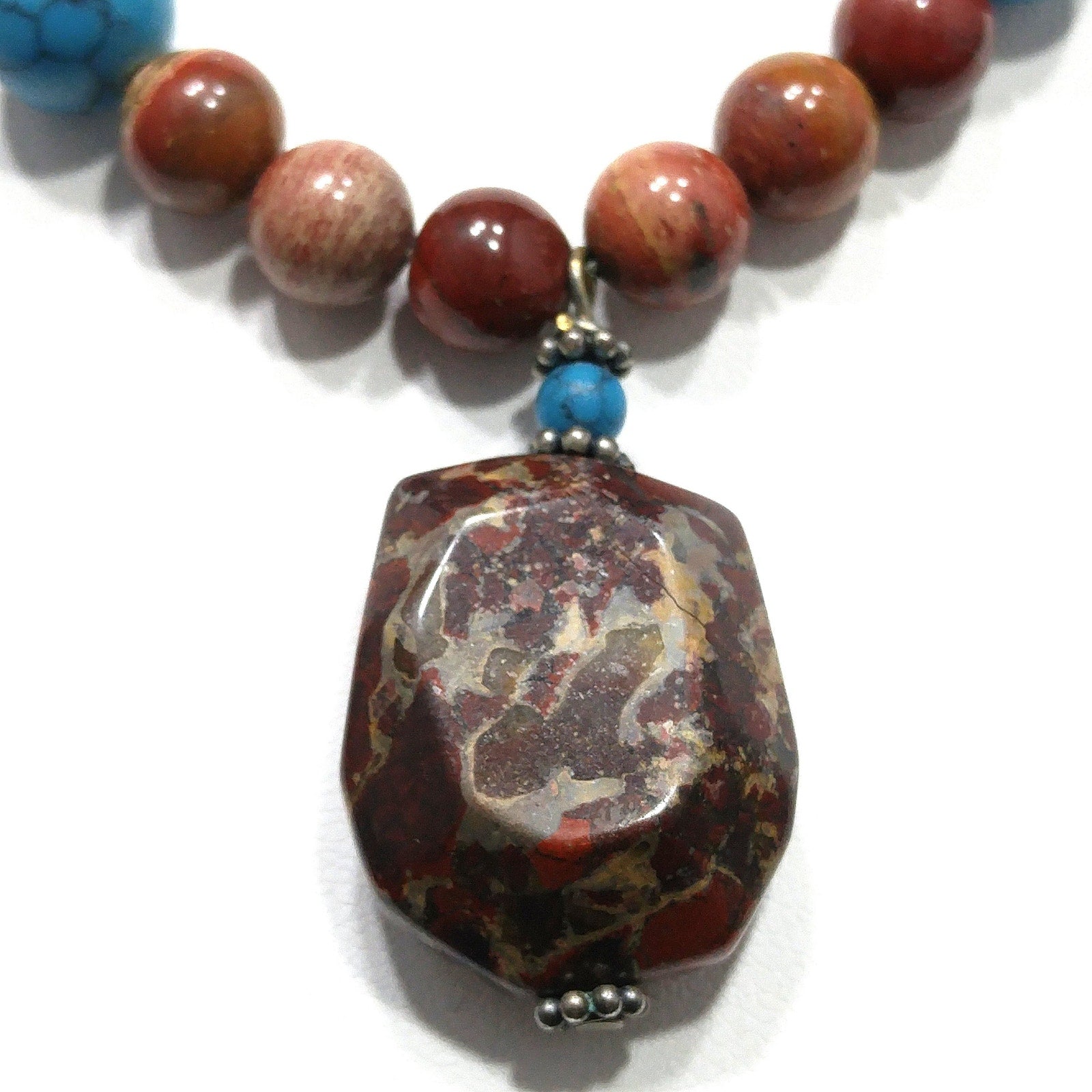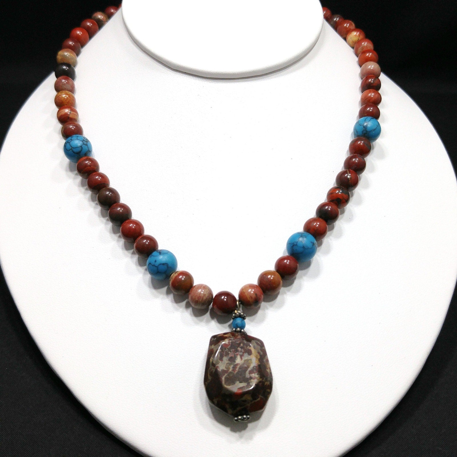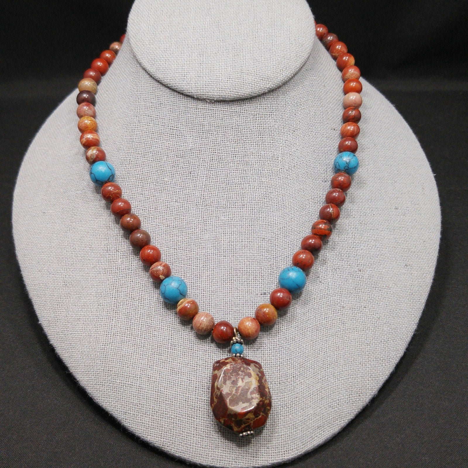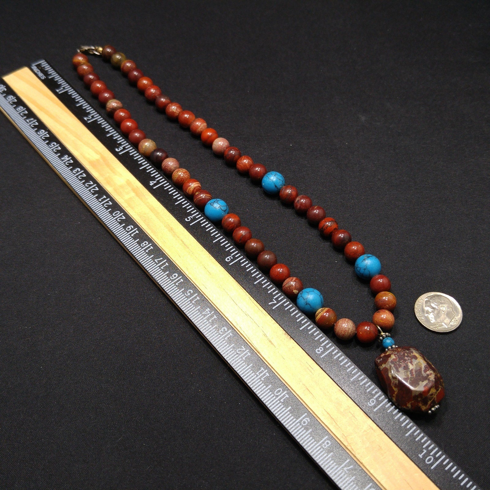 *Description: This is a beautiful gemstone beaded necklace with a red gemstone pendant from the 1980s. I tested the beads with the Presidium Gem tester and the red beads fell into the Spinel area and are probably red jasper; the blue beads fell into the Quartz area and I believe them to be Howlite. I believe the pendant to be Red Jasper due to the inclusions and markings. There is a natural inclusion on the front of the pendant. Please see photos to review prior to purchase. The silver tone clasp is lobster. There are a variety of gemstones among the beads which are 10mm and 12mm. This is a wonderful bohemian necklace. This would be a great addition to your vintage jewelry collection or make a great vintage gift!