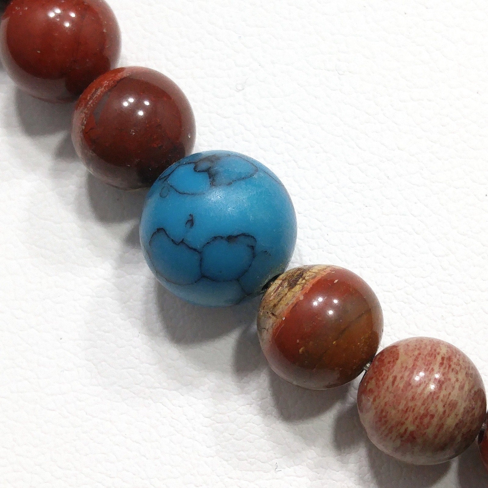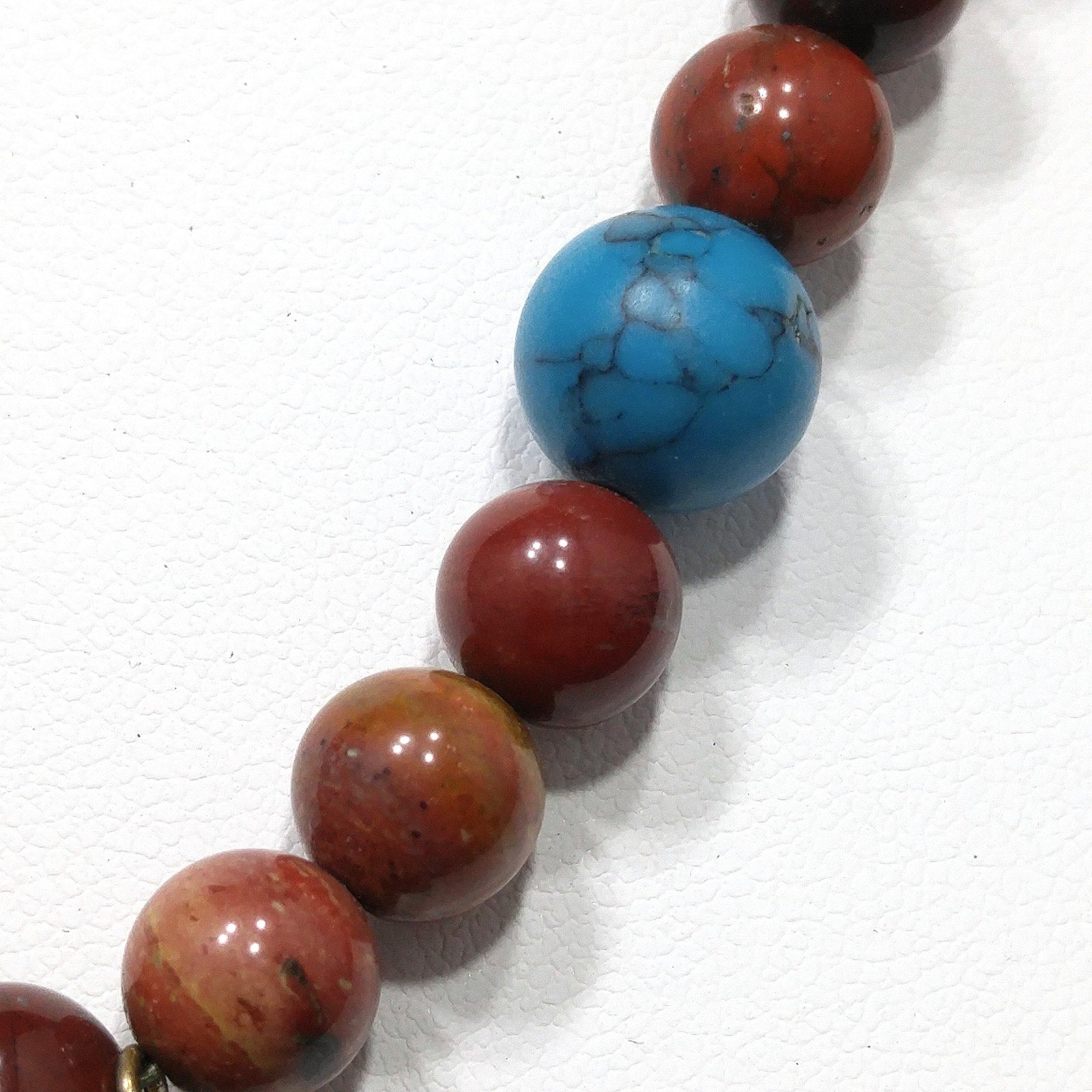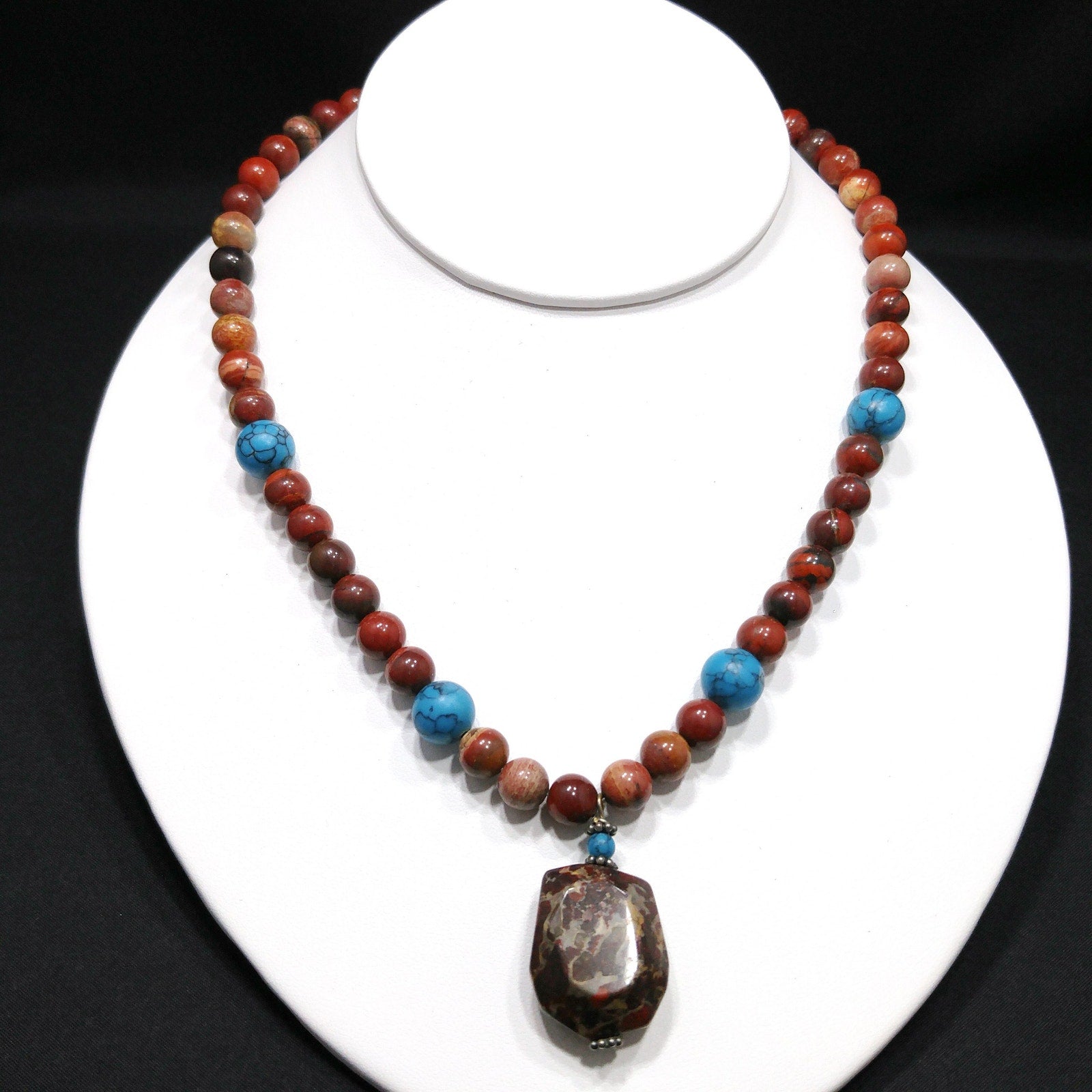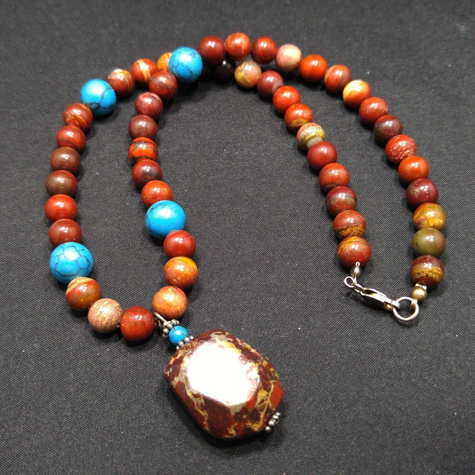 *Description: This is a beautiful gemstone beaded necklace with a red gemstone pendant from the 1980s. I tested the beads with the Presidium Gem tester and the red beads fell into the Spinel area and are probably red jasper; the blue beads fell into the Quartz area and I believe them to be Howlite. I believe the pendant to be Red Jasper due to the inclusions and markings. There is a natural inclusion on the front of the pendant. Please see photos to review prior to purchase. The silver tone clasp is lobster. There are a variety of gemstones among the beads which are 10mm and 12mm. This is a wonderful bohemian necklace. This would be a great addition to your vintage jewelry collection or make a great vintage gift!