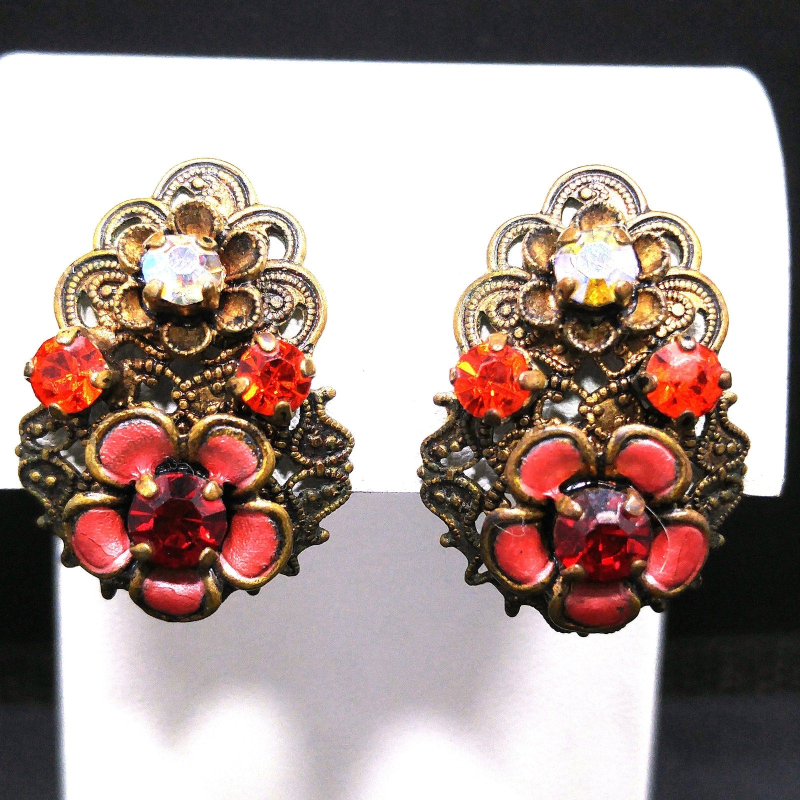 *Description: This is a beautiful pair of Germany filigree clip on earrings from the 1940s. The earrings have an enamel light red flower with a darker red glass rhinestone center. They also have orange rhinestone accents and a gorgeous fire polished clear rhinestone which looks like aurora borealis but is actually the fire polished technique for this time period. This would be a great addition to your vintage jewelry collection or make a great vintage gift!
