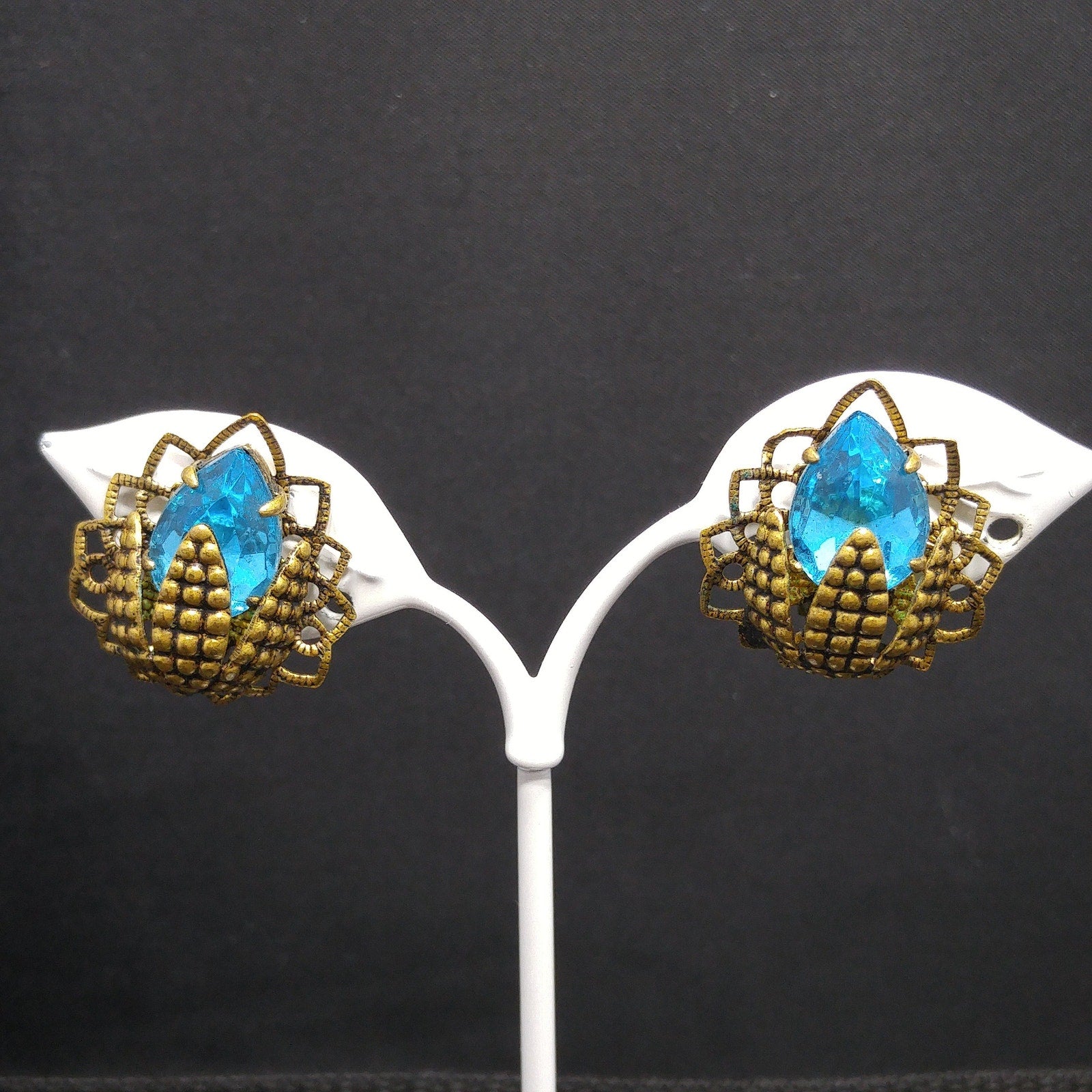 This is a beautiful pair of Germany filigree clip on earrings from the 1940s. The earrings have a blossoming flower with a turquoise large rhinestone center. The rhinestone is prong set and full of sparkle. This is a very unique pair of Germany earrings and very beautiful. This would be a great addition to your vintage jewelry collection or make a great vintage gift!
