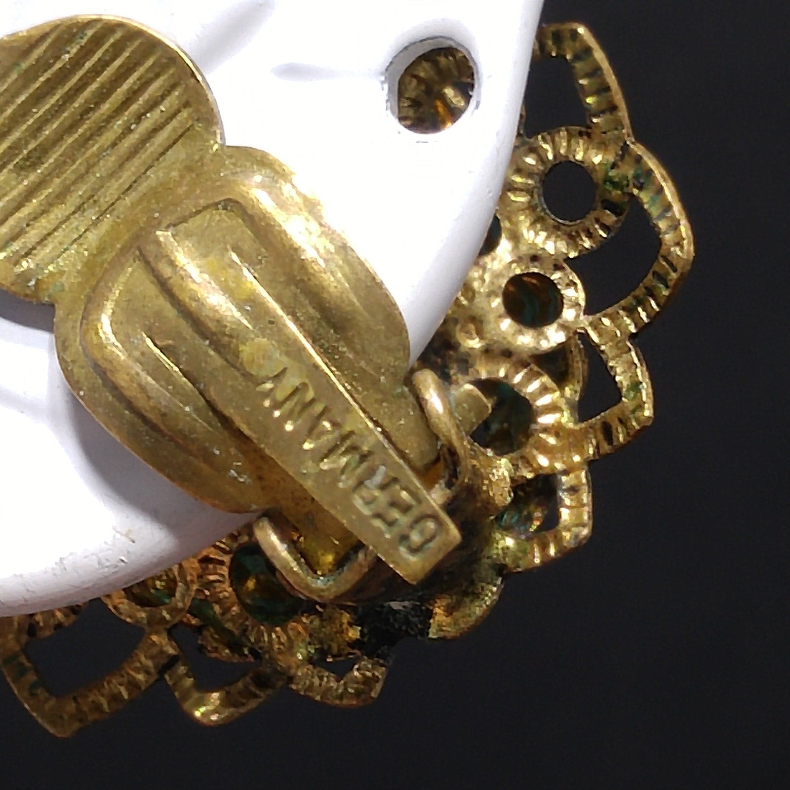 Germany Turquoise Filigree Clip Earrings, Large Rhinestone, 1940s Vintage Jewelry