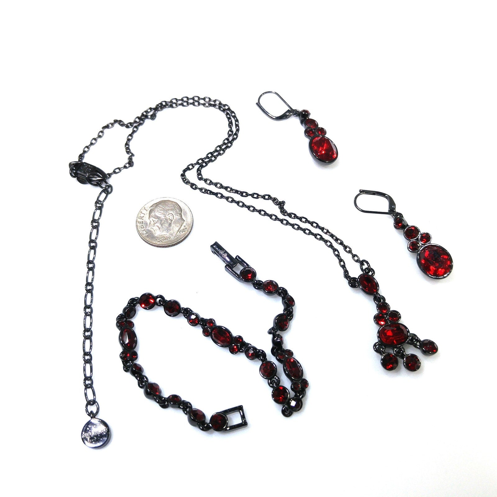This vintage Givenchy jewelry set features a matching necklace, bracelet, and pierced drop earrings from the 1990s. Each piece is adorned with garnet-red rhinestones set in a striking dark gray metal for a dramatic contrast.