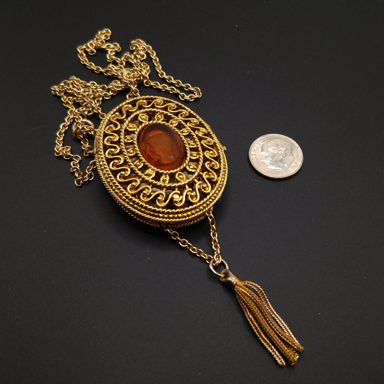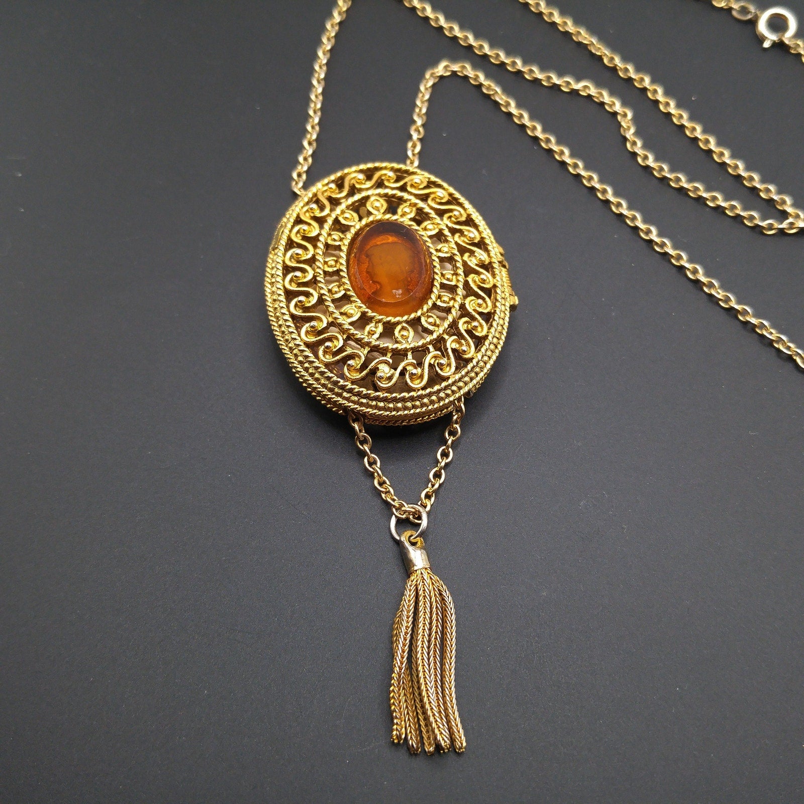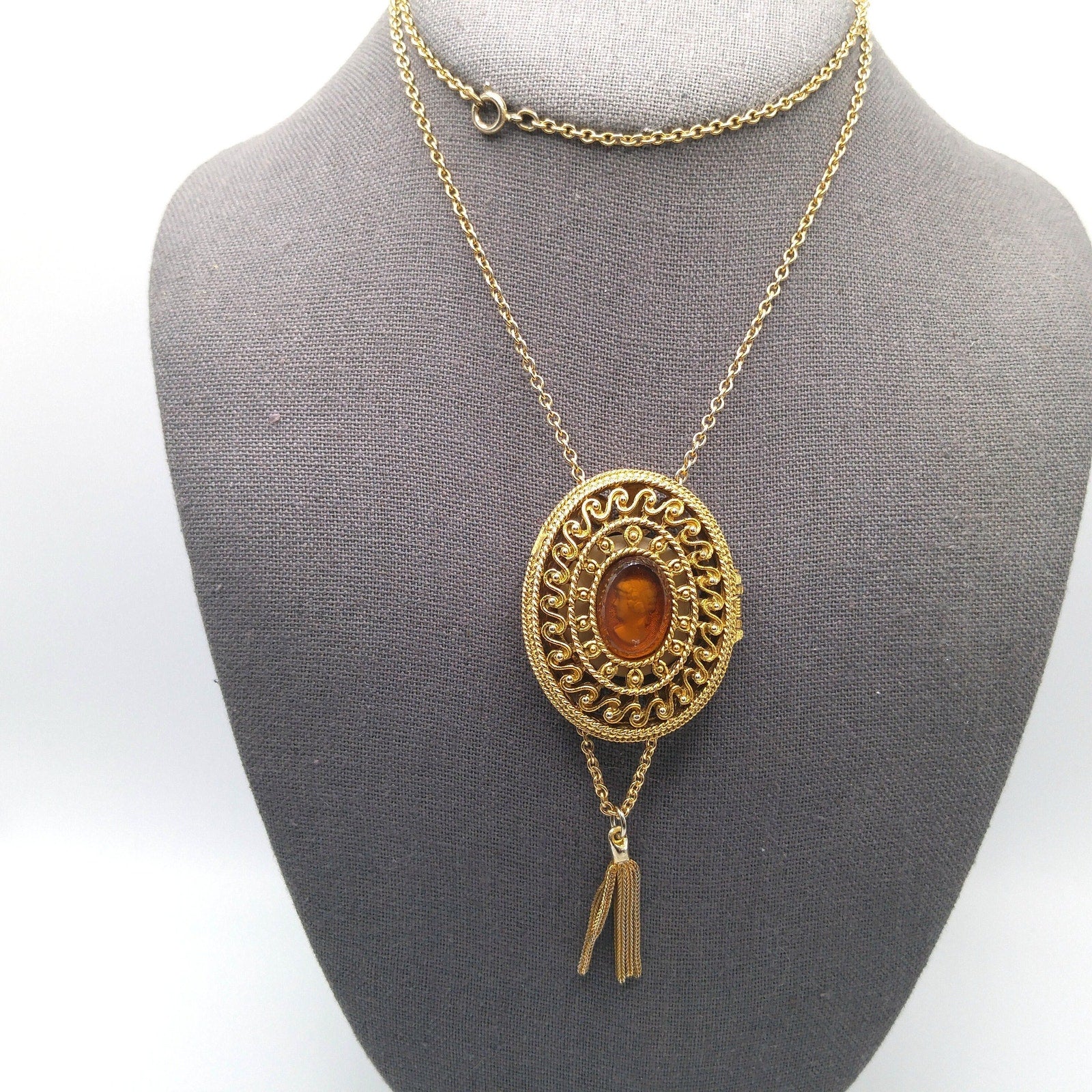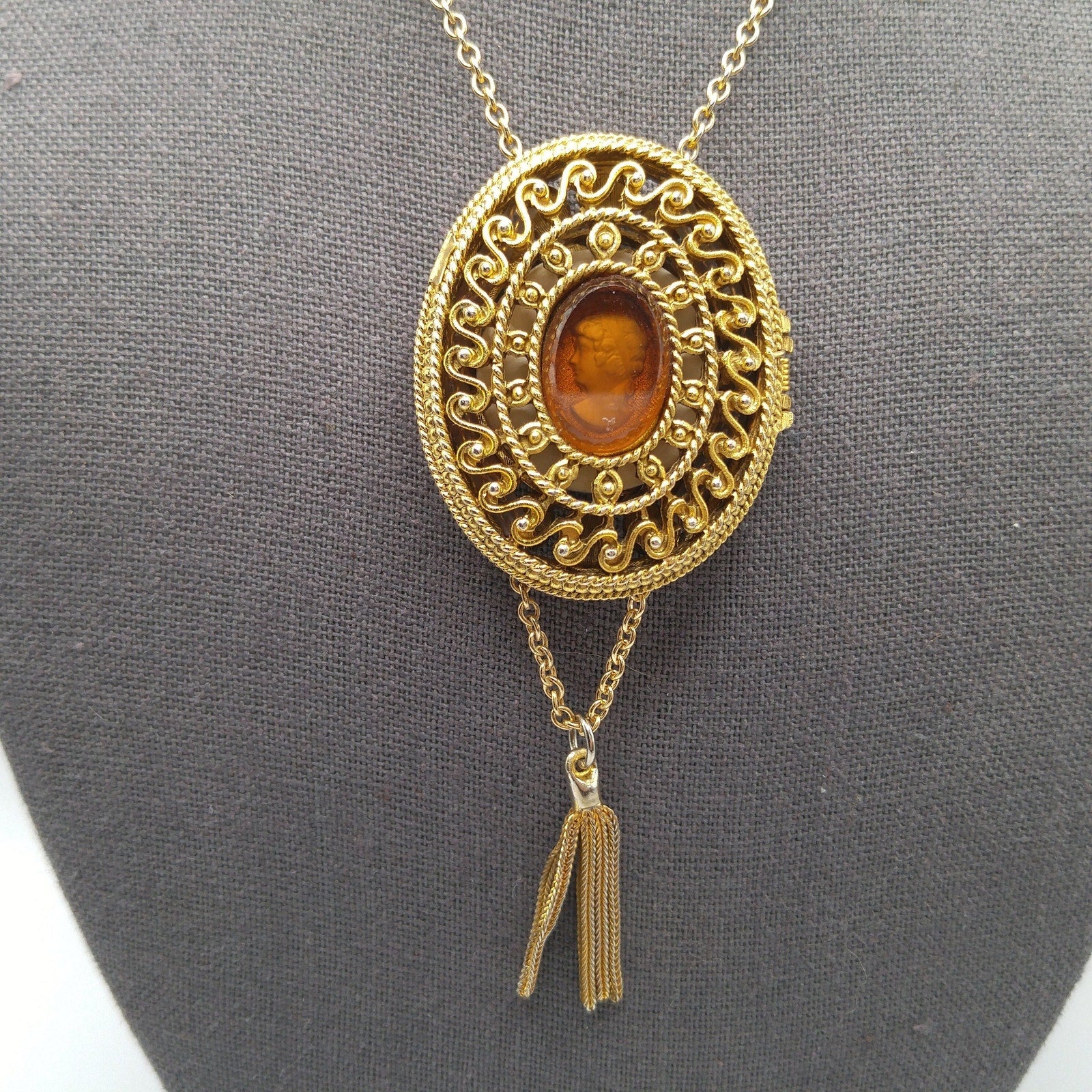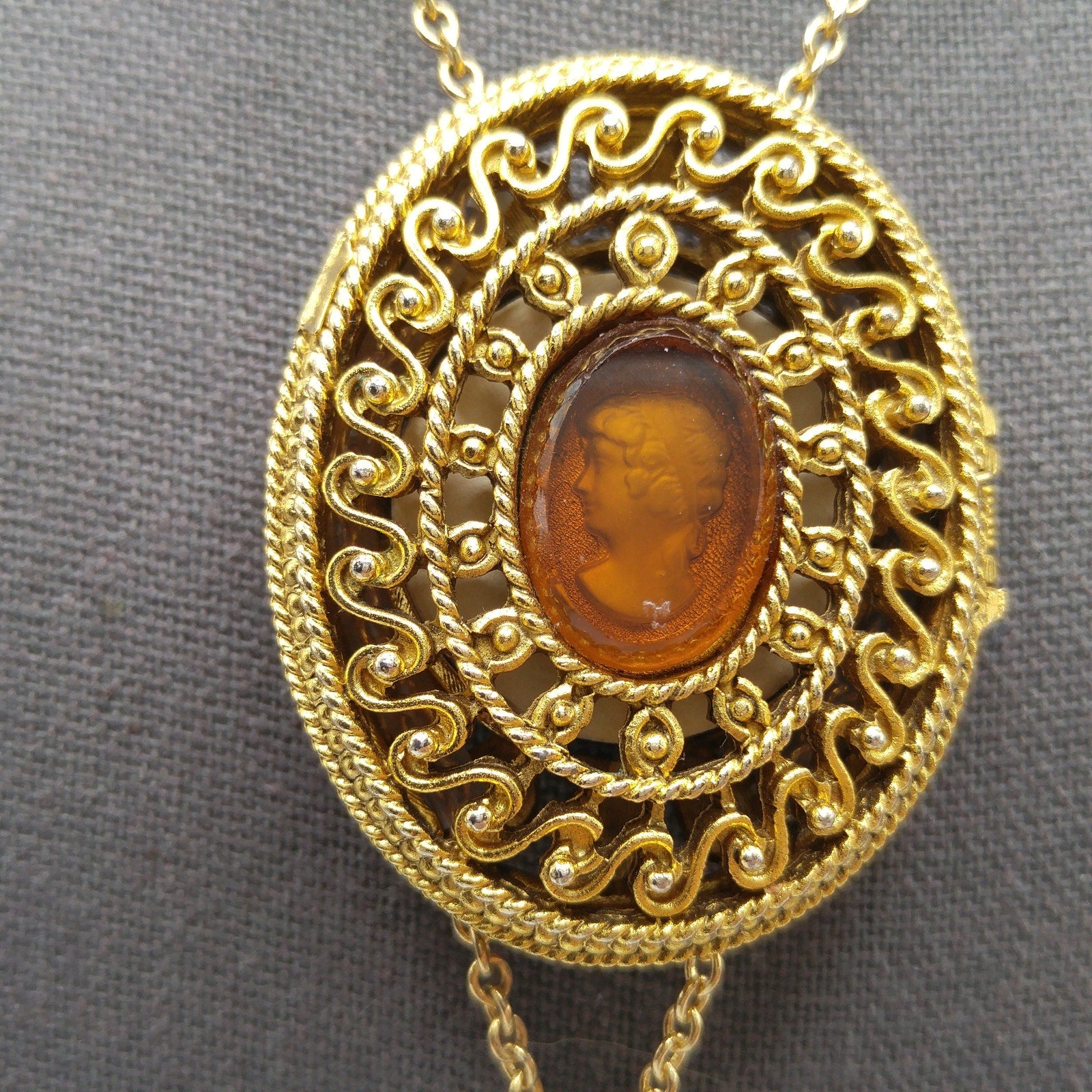 *Description: This is a great vintage locket with solid perfume inside and a light topaz glass cameo on the front of a filigree oval pendant from the 1960s. One the back, you can see the solid perfume through the filigree. The 30 inch chain goes through the oval pendant and comes out the bottom with a snake chain tassel on the end. The chain is movable inside the pendant and may be adjusted as desired. The perfume is still inside with little aroma. This would be a great addition to your vintage jewelry collection or make a great vintage gift!
