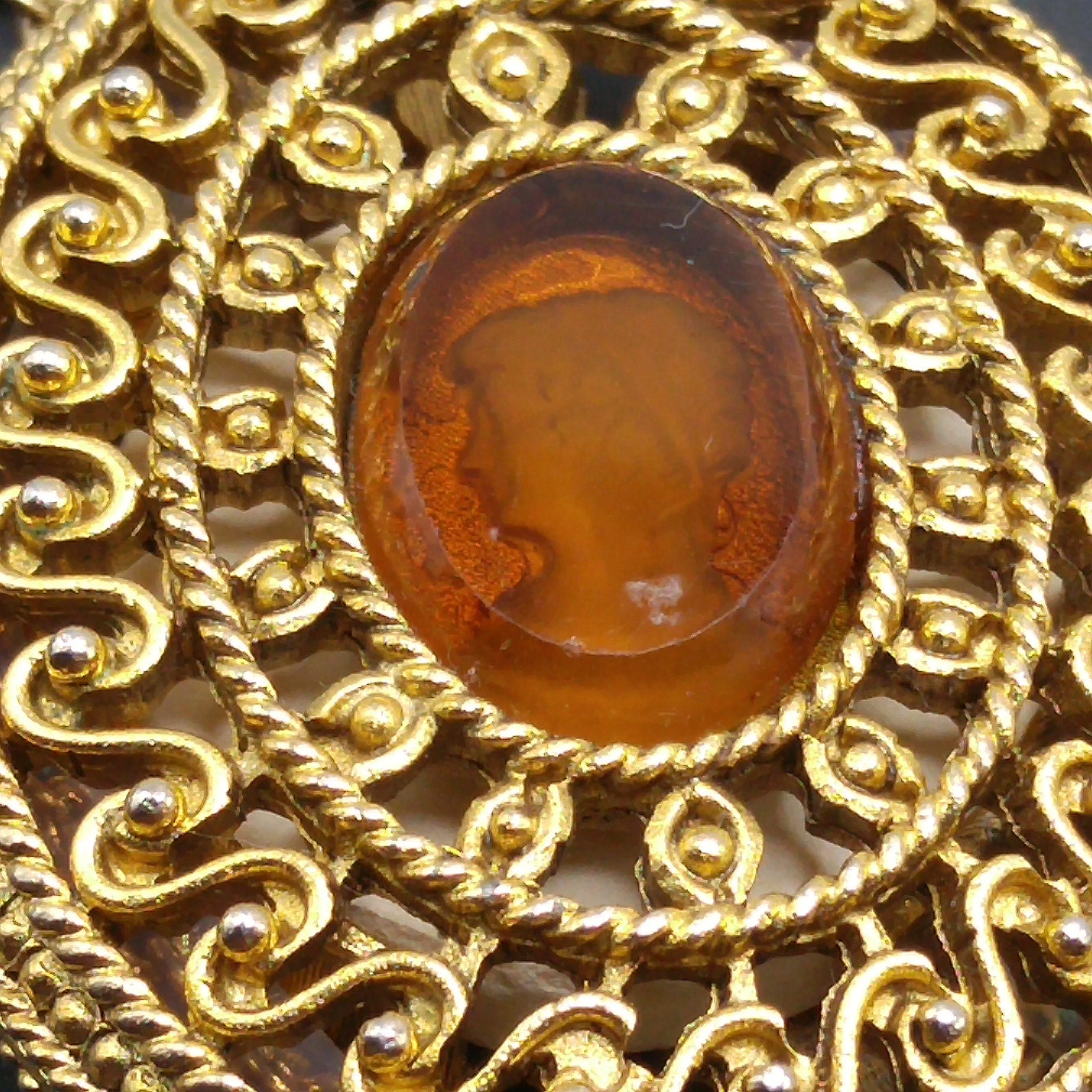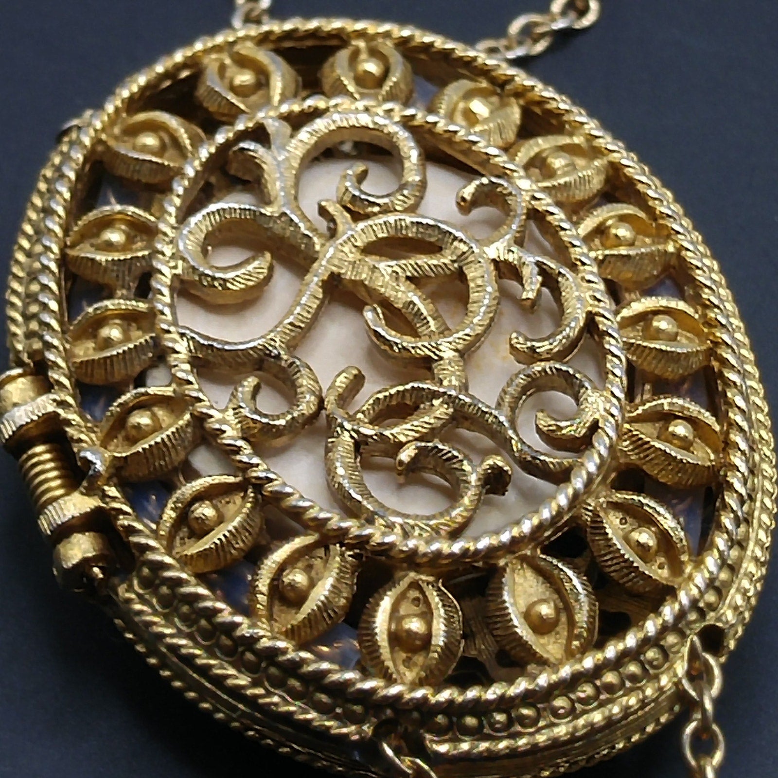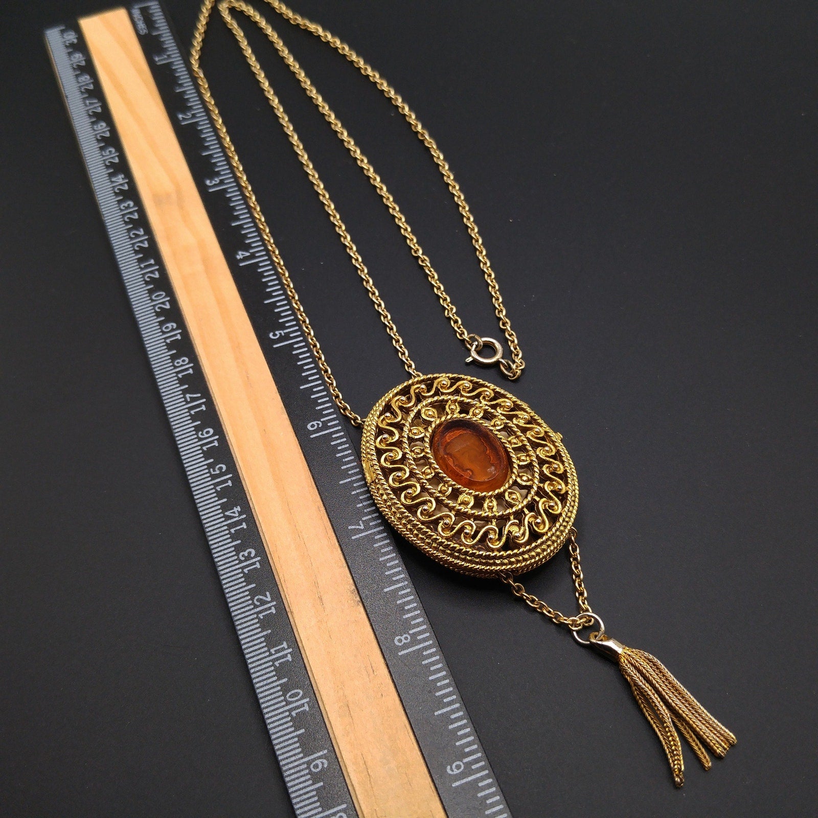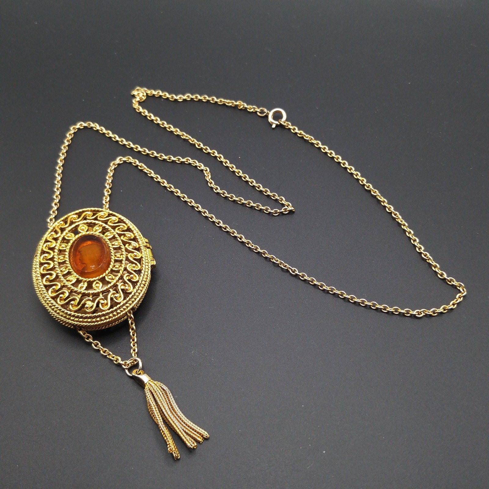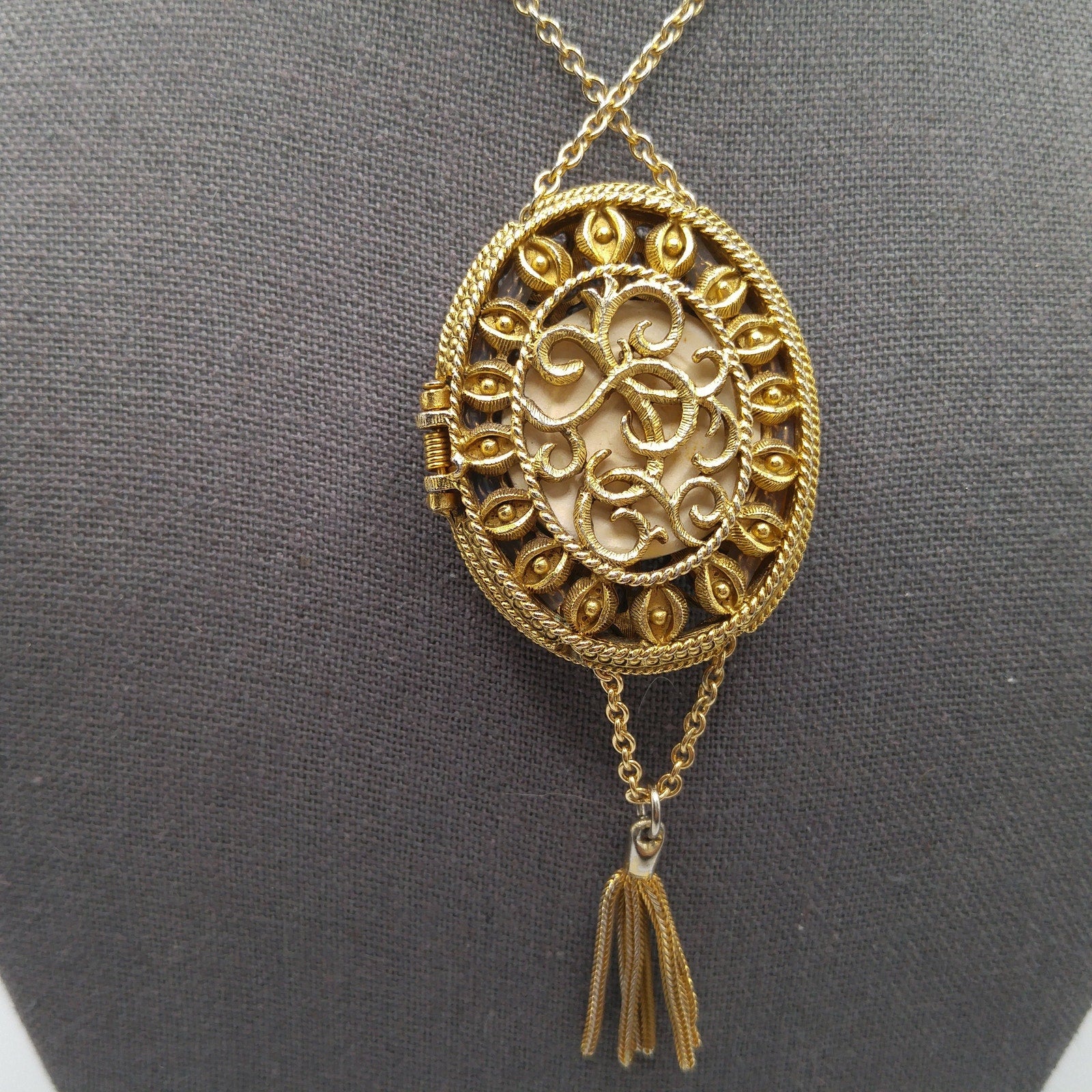 *Description: This is a great vintage locket with solid perfume inside and a light topaz glass cameo on the front of a filigree oval pendant from the 1960s. One the back, you can see the solid perfume through the filigree. The 30 inch chain goes through the oval pendant and comes out the bottom with a snake chain tassel on the end. The chain is movable inside the pendant and may be adjusted as desired. The perfume is still inside with little aroma. This would be a great addition to your vintage jewelry collection or make a great vintage gift!
