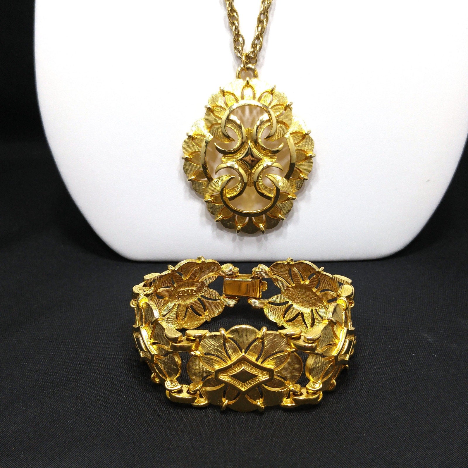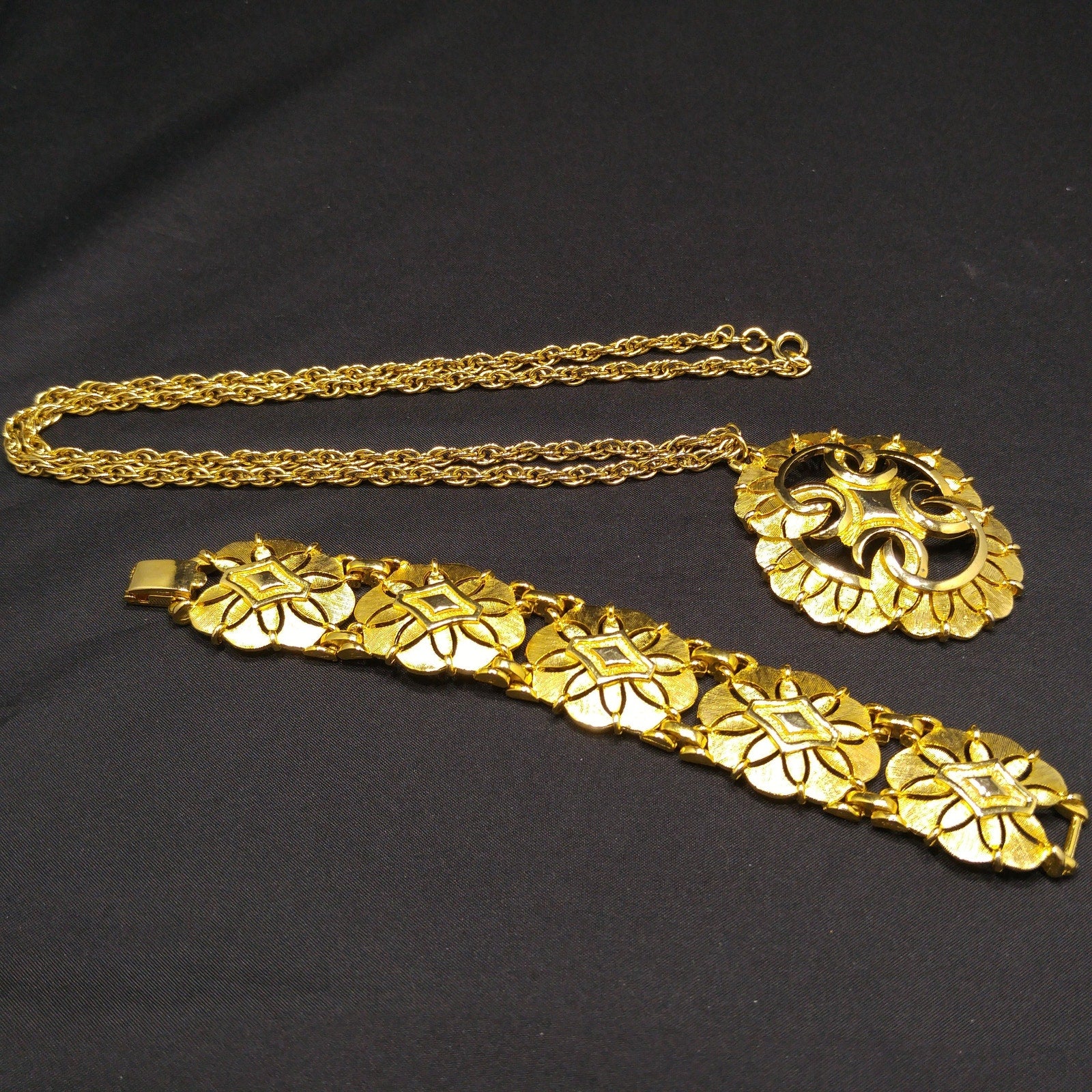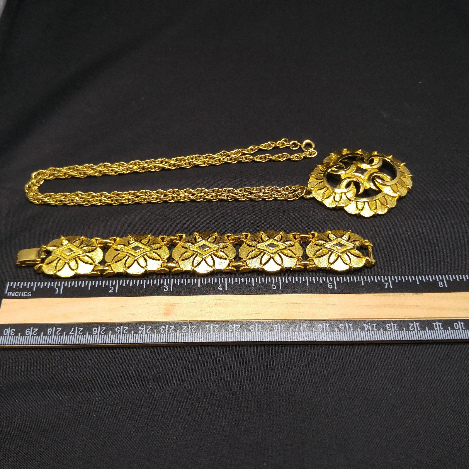 *Description: This is a beautiful designer pendant necklace with a medallion theme and matching linked bracelet from the 1960s. Several designers, such as Boucher, used numbers in their hallmarks. This necklace is stamped on the back of the pendant with the numbers *51013 and on the bracelet, the number *41066 is stamped on the back. No other designer marks are included. The necklace is a medallion style pendant on a gold tone chain. The bracelet is a matching medallion linked gold plated bracelet with a fold over alligator clasp. Each piece is stamped with a five digit number which I believe is the design mark. This is a beautiful jewelry set and would be a great addition to your vintage jewelry collection or make a great vintage gift!