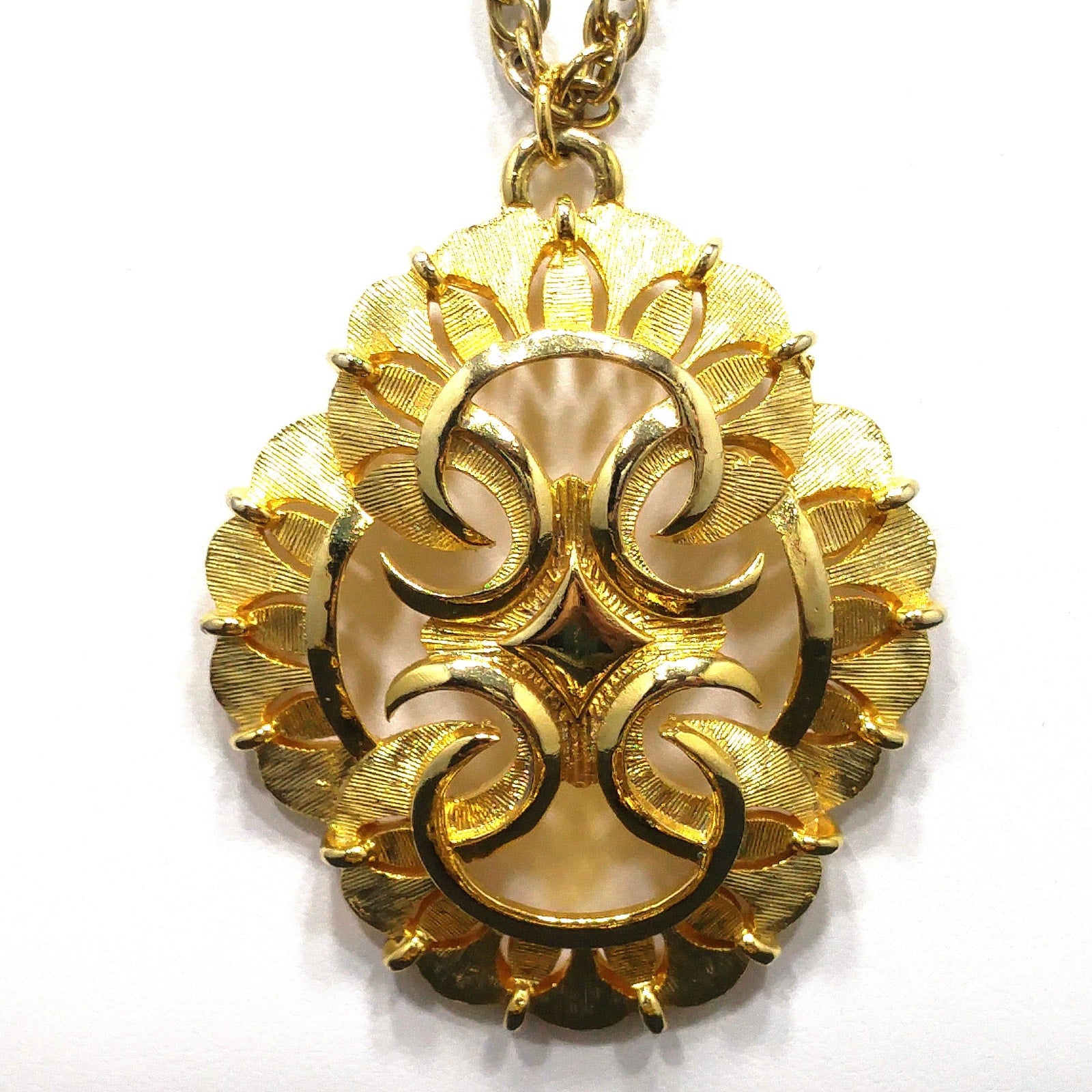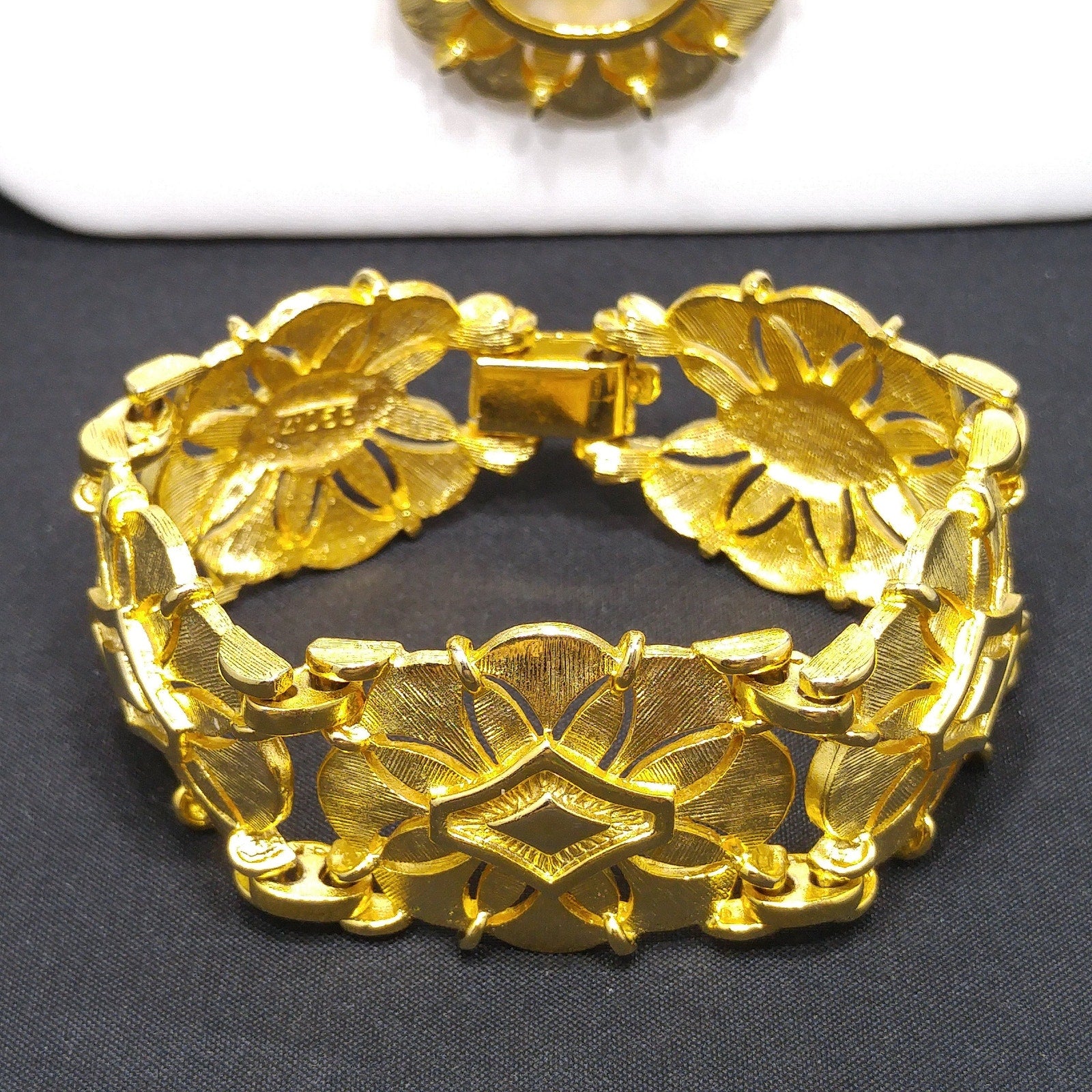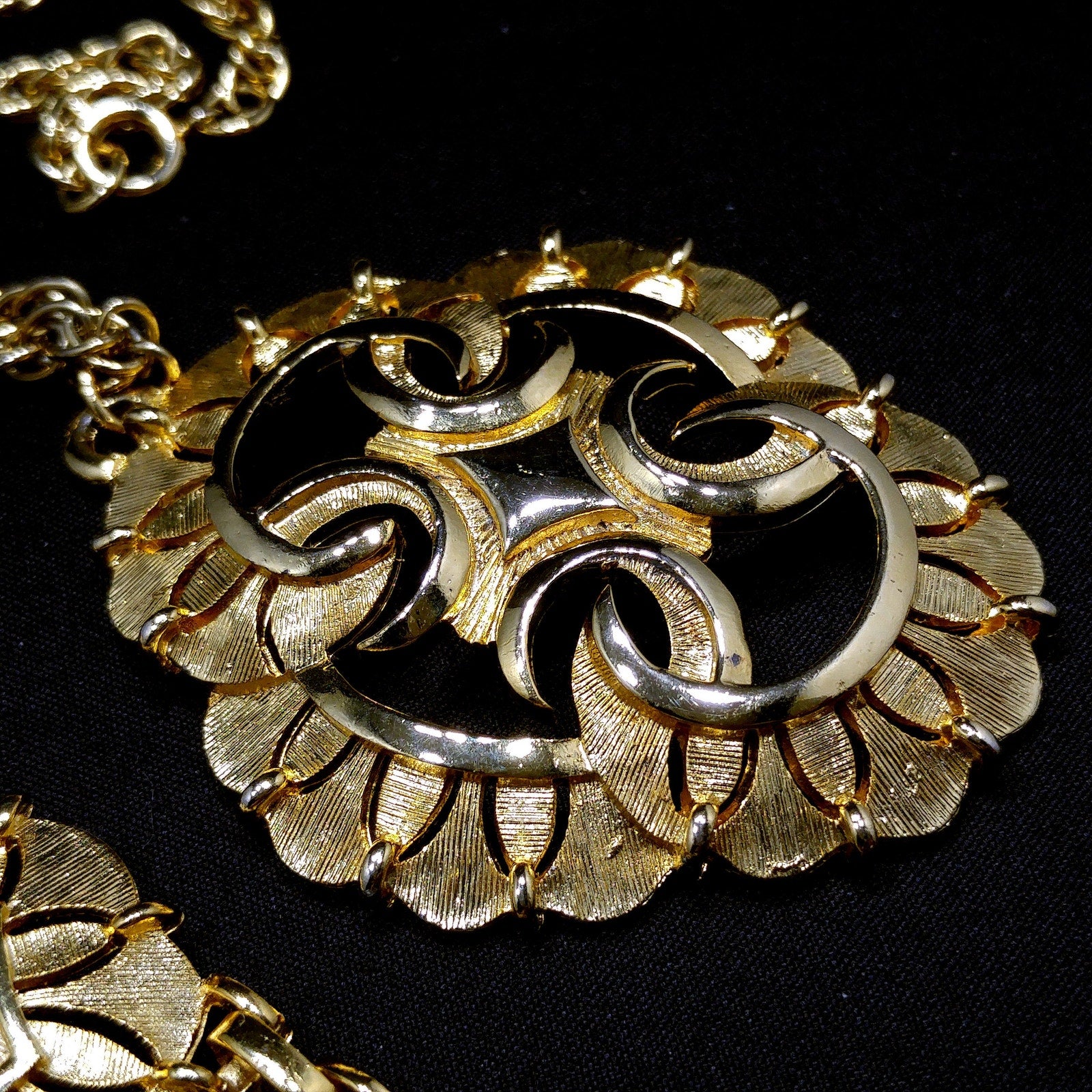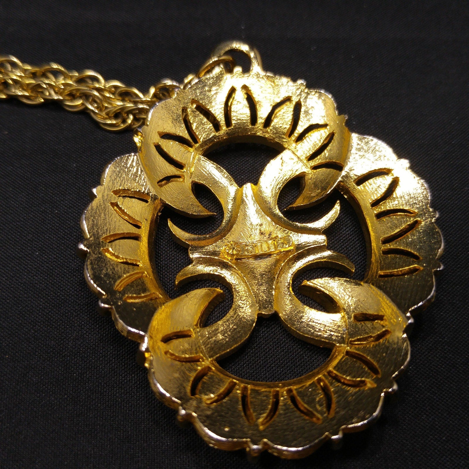 *Description: This is a beautiful designer pendant necklace with a medallion theme and matching linked bracelet from the 1960s. Several designers, such as Boucher, used numbers in their hallmarks. This necklace is stamped on the back of the pendant with the numbers *51013 and on the bracelet, the number *41066 is stamped on the back. No other designer marks are included. The necklace is a medallion style pendant on a gold tone chain. The bracelet is a matching medallion linked gold plated bracelet with a fold over alligator clasp. Each piece is stamped with a five digit number which I believe is the design mark. This is a beautiful jewelry set and would be a great addition to your vintage jewelry collection or make a great vintage gift!