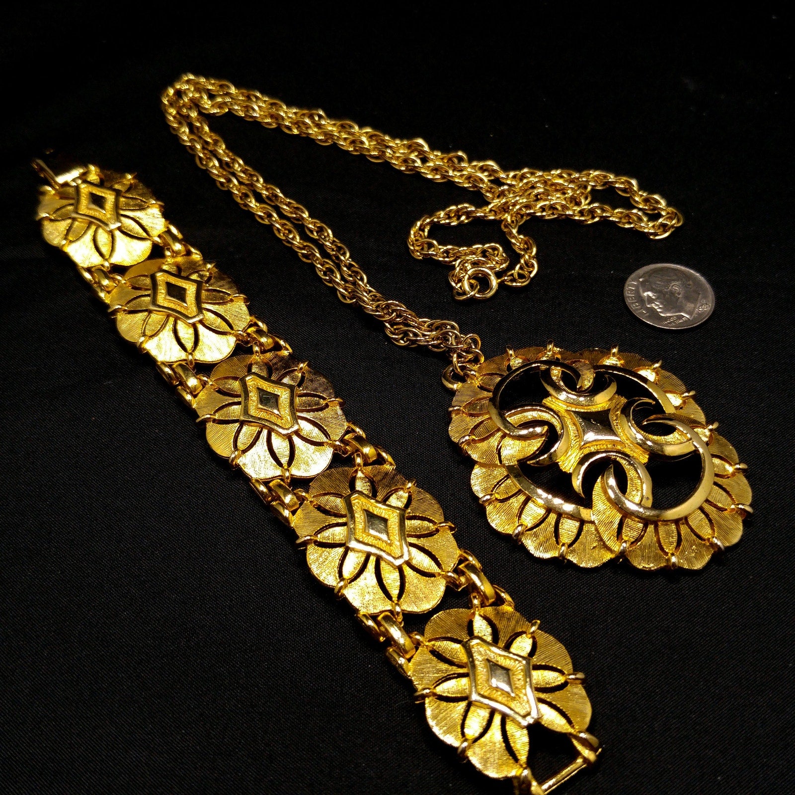 Gold Plated Necklace & Bracelet, Medallion Design, 1960s Vintage Jewelry