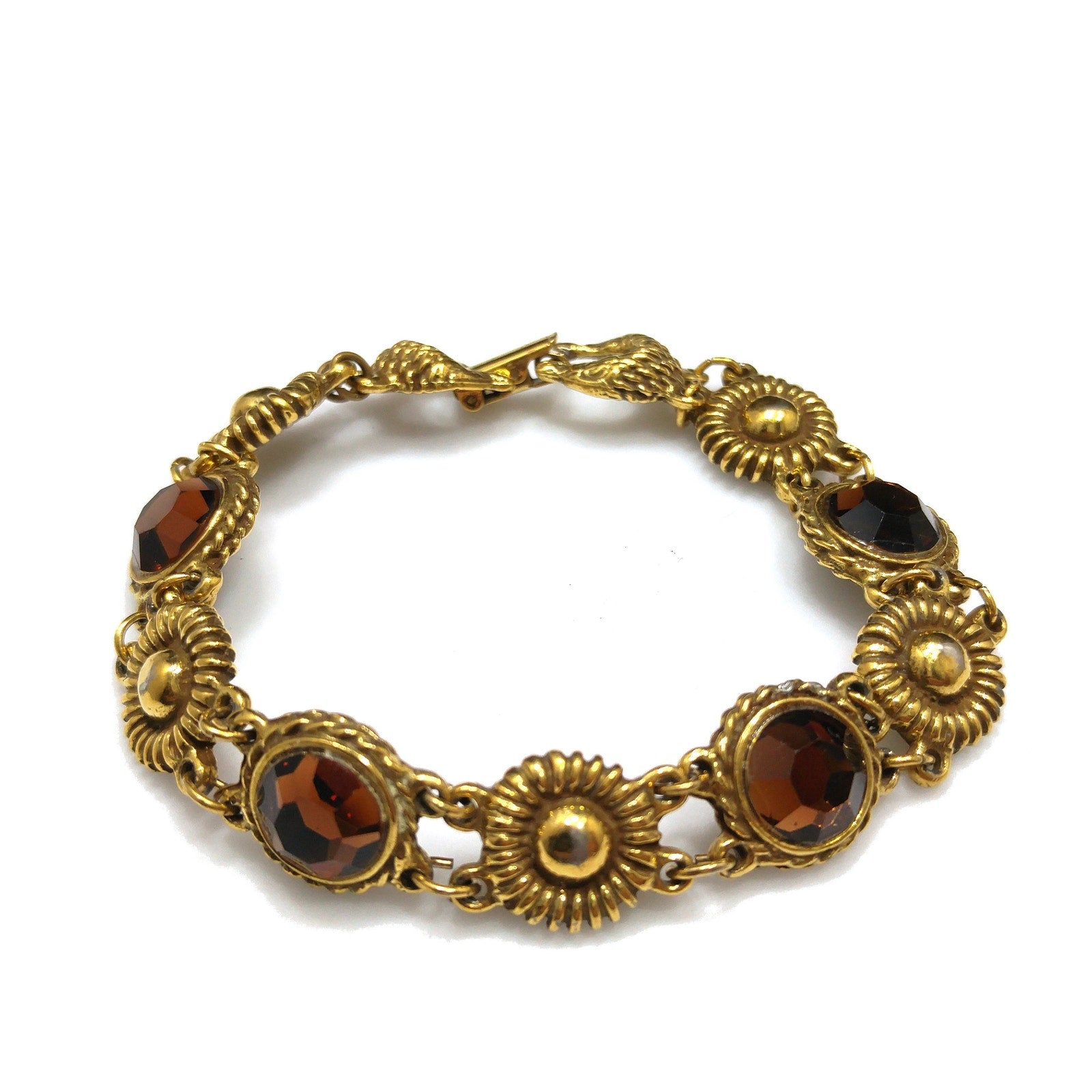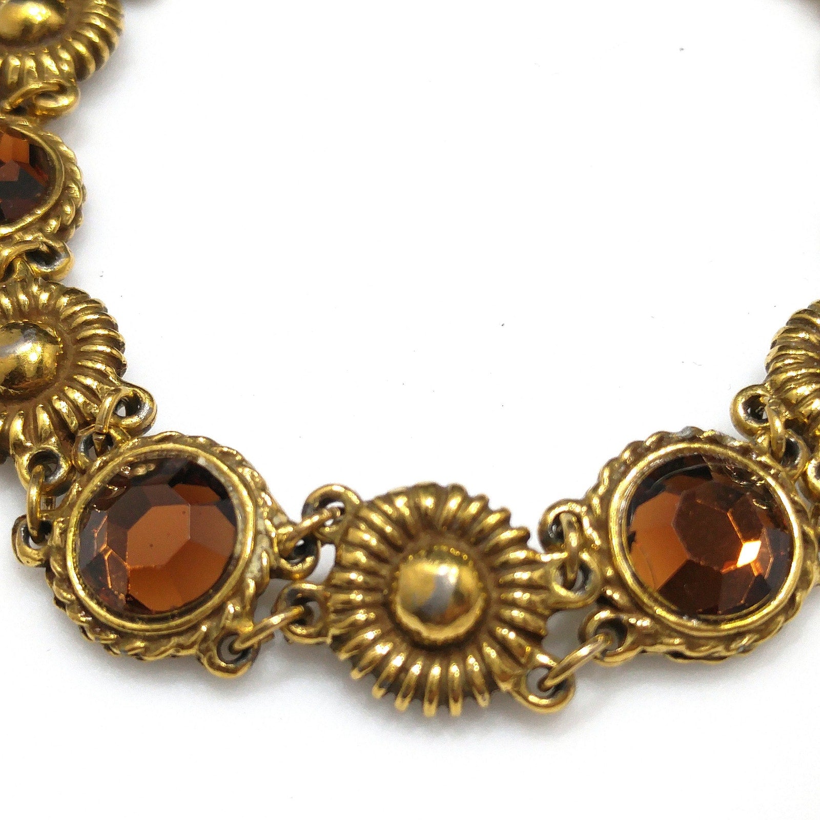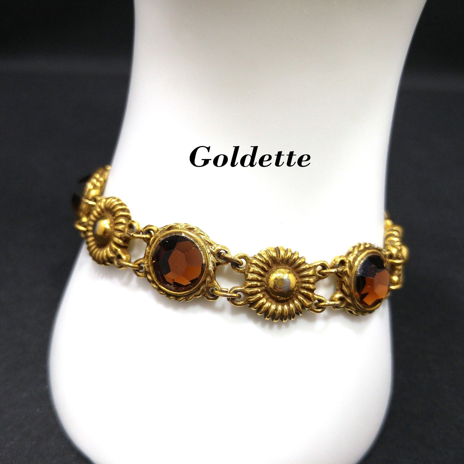 *Description: This is a great Goldette of New York topaz rhinestone link bracelet from the 1960s. The round faceted topaz colored rhinestones are acrylic and are separated by gold links in a floral design. There are five gold floral links and four rhinestone topaz links. The clasp is an alligator clasp which fits securely and is stamped GOLDETTE NY on the back. This would be a great addition to your vintage jewelry collection or make a great vintage gift!