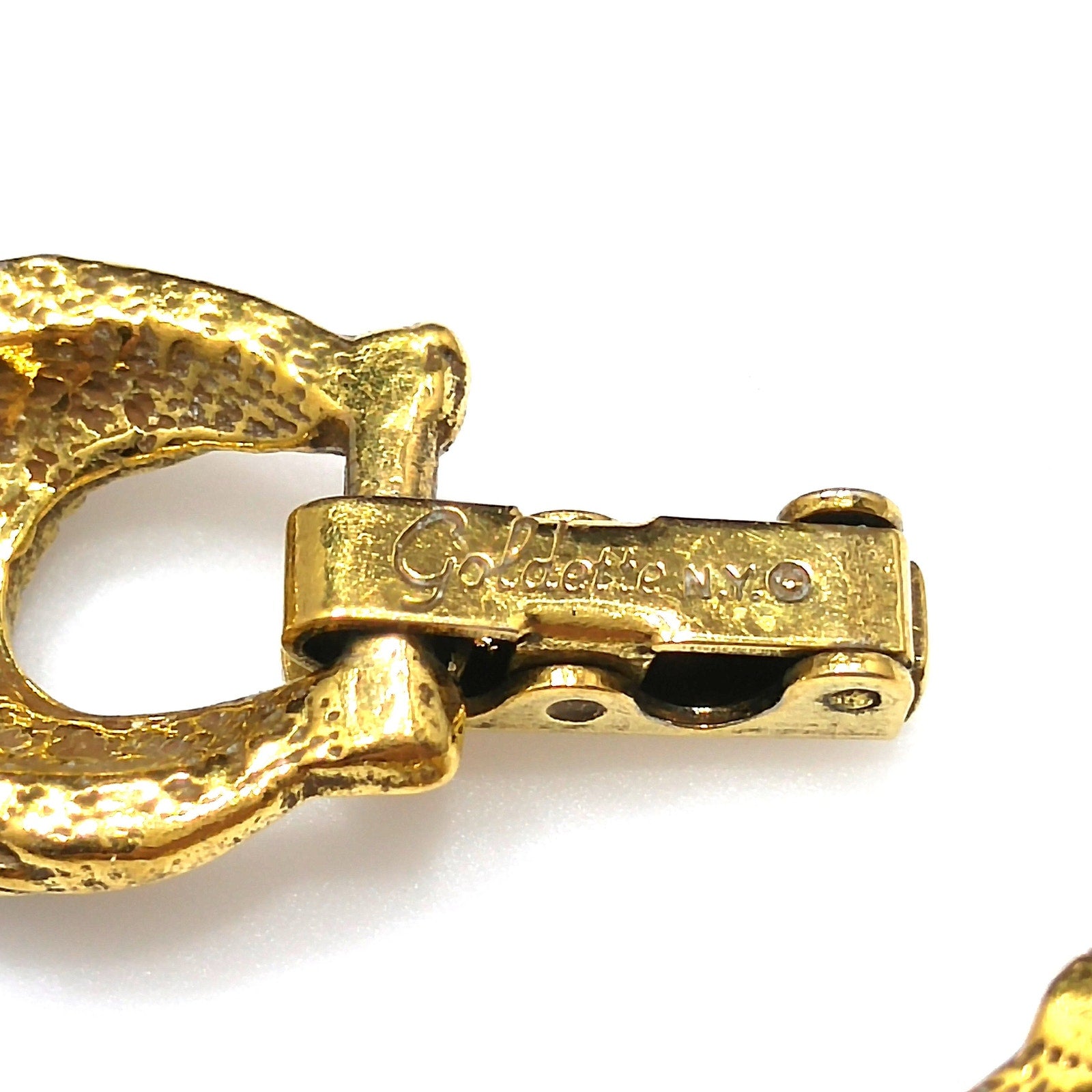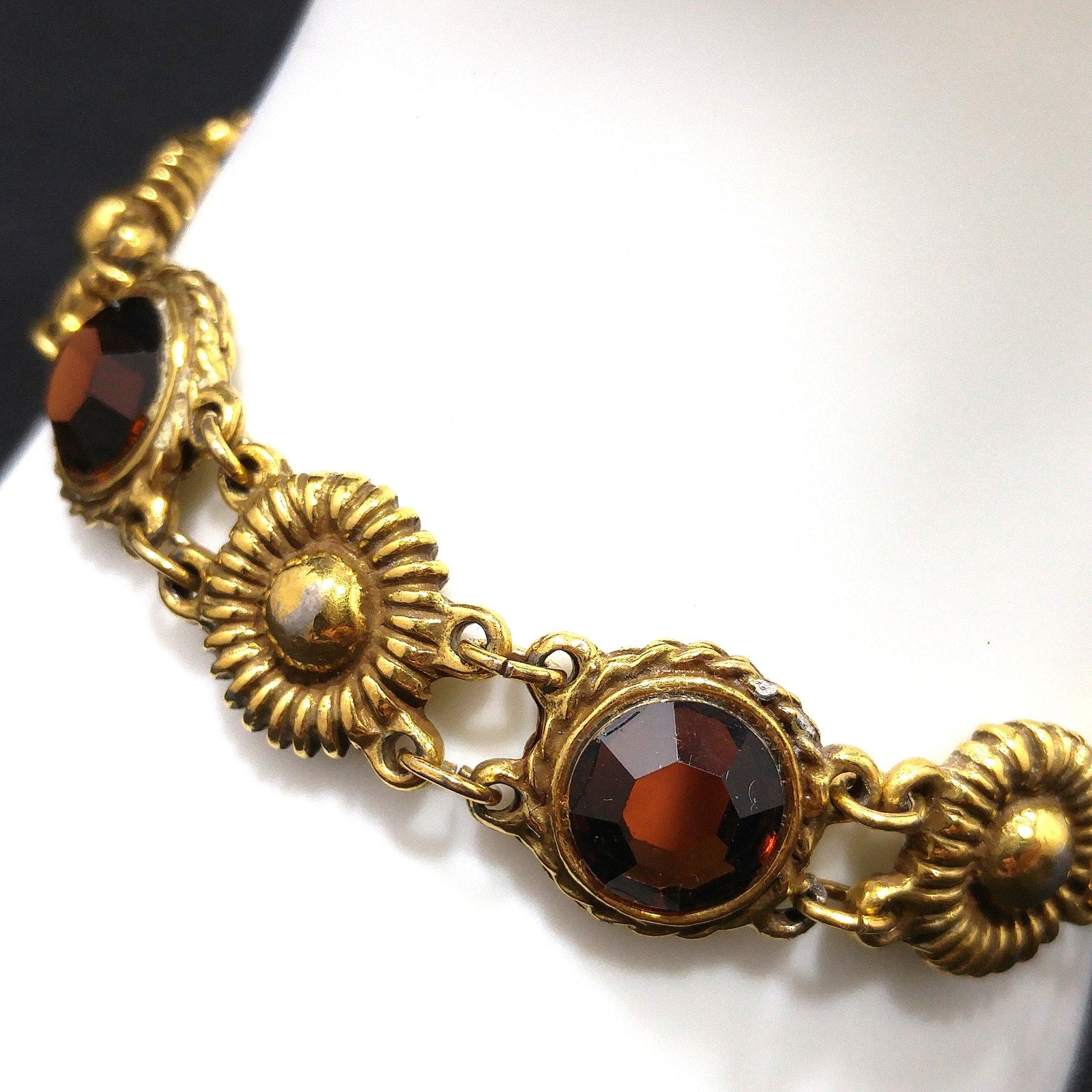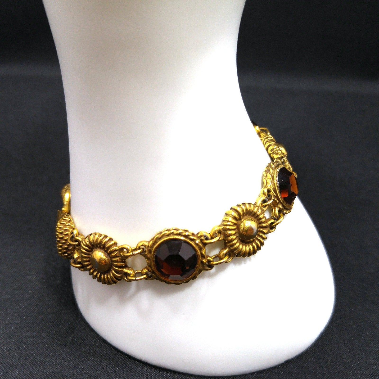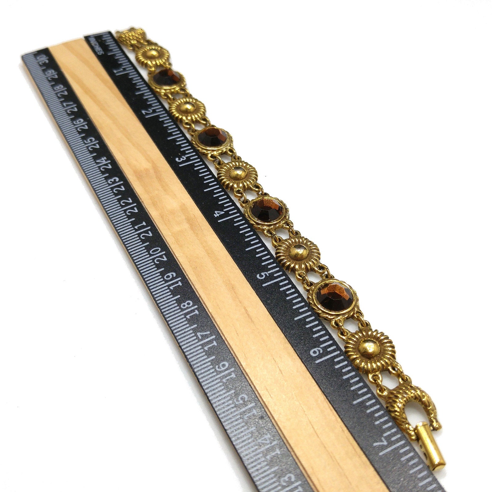 *Description: This is a great Goldette of New York topaz rhinestone link bracelet from the 1960s. The round faceted topaz colored rhinestones are acrylic and are separated by gold links in a floral design. There are five gold floral links and four rhinestone topaz links. The clasp is an alligator clasp which fits securely and is stamped GOLDETTE NY on the back. This would be a great addition to your vintage jewelry collection or make a great vintage gift!