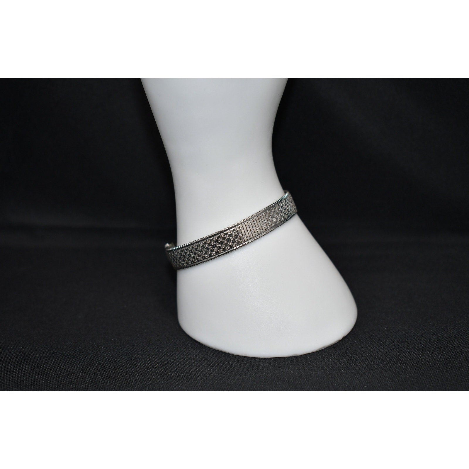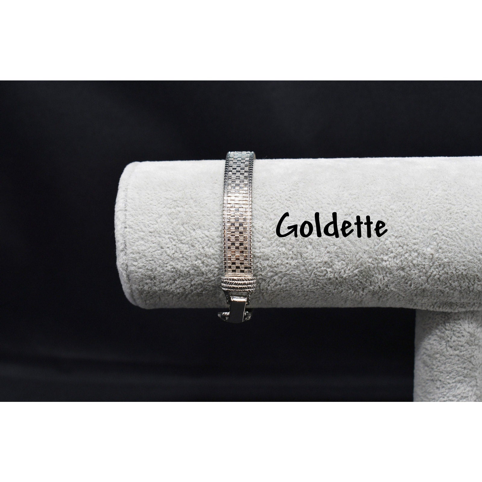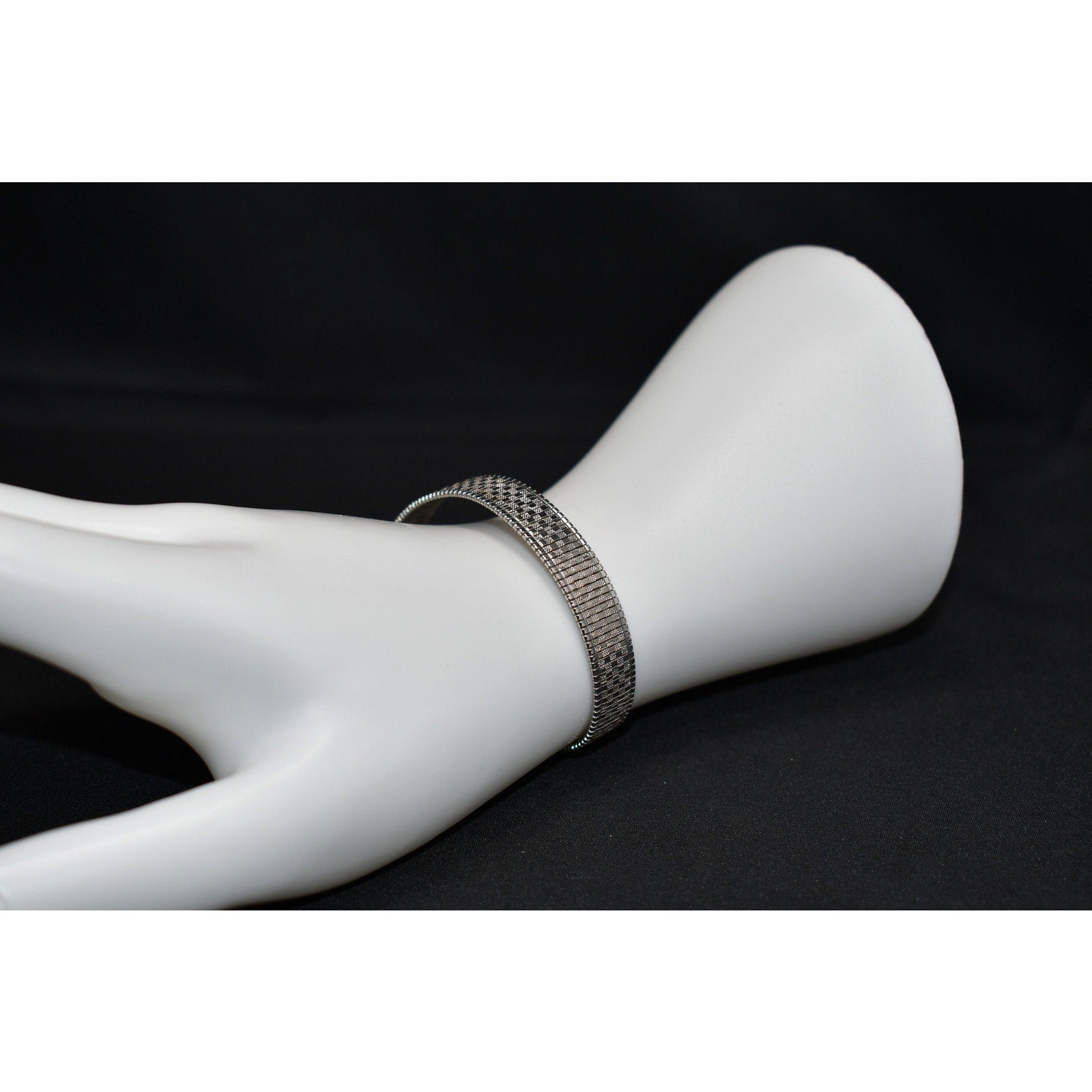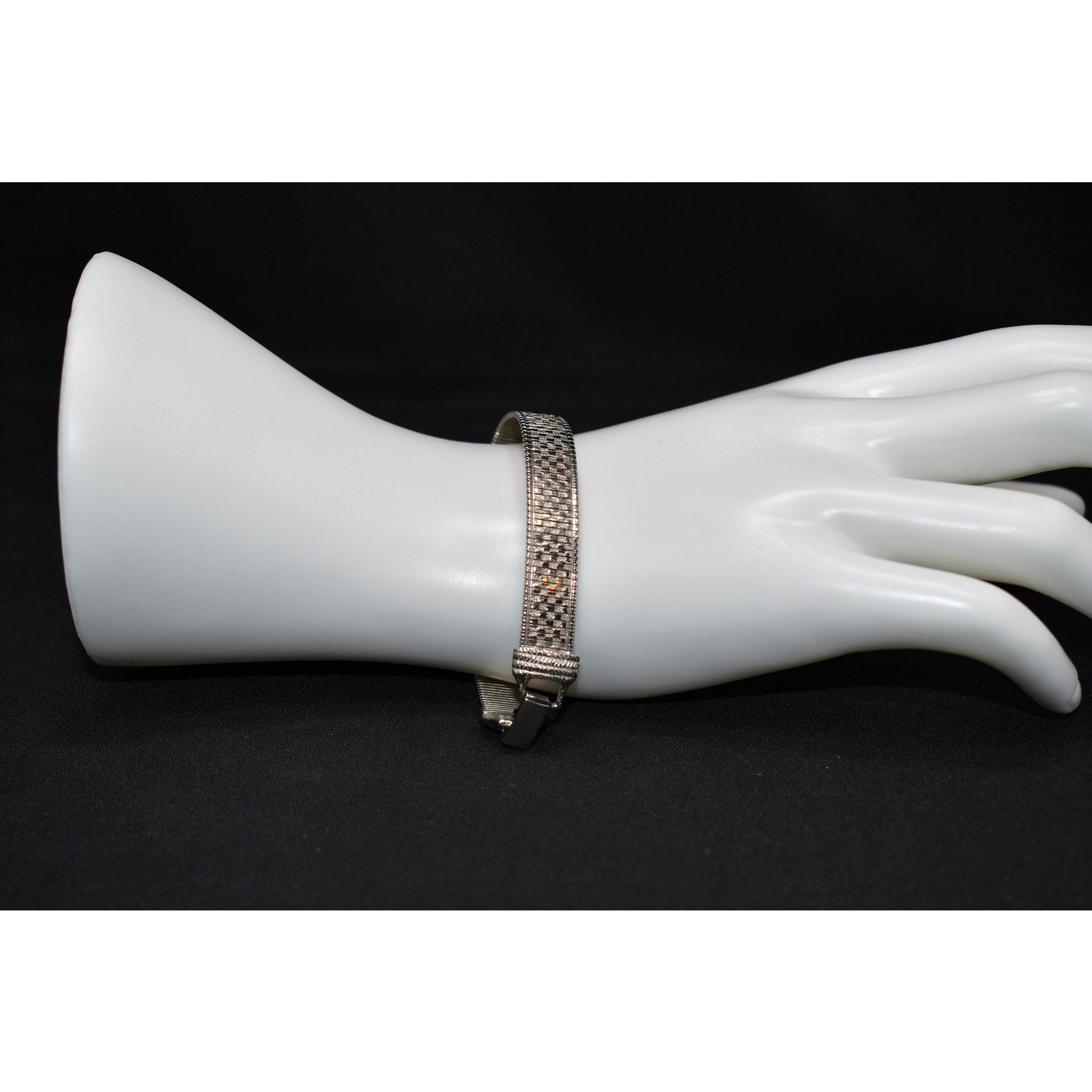 *Description: This is a beautiful mid-century flexible silver tone bracelet by Goldette from the 1950s or before. The bracelet is designed in two shades of silver tone metal which makes the design look like tiny squares on a smooth surface. This would be a great bracelet to give as a gift or add to your vintage jewelry collection.
