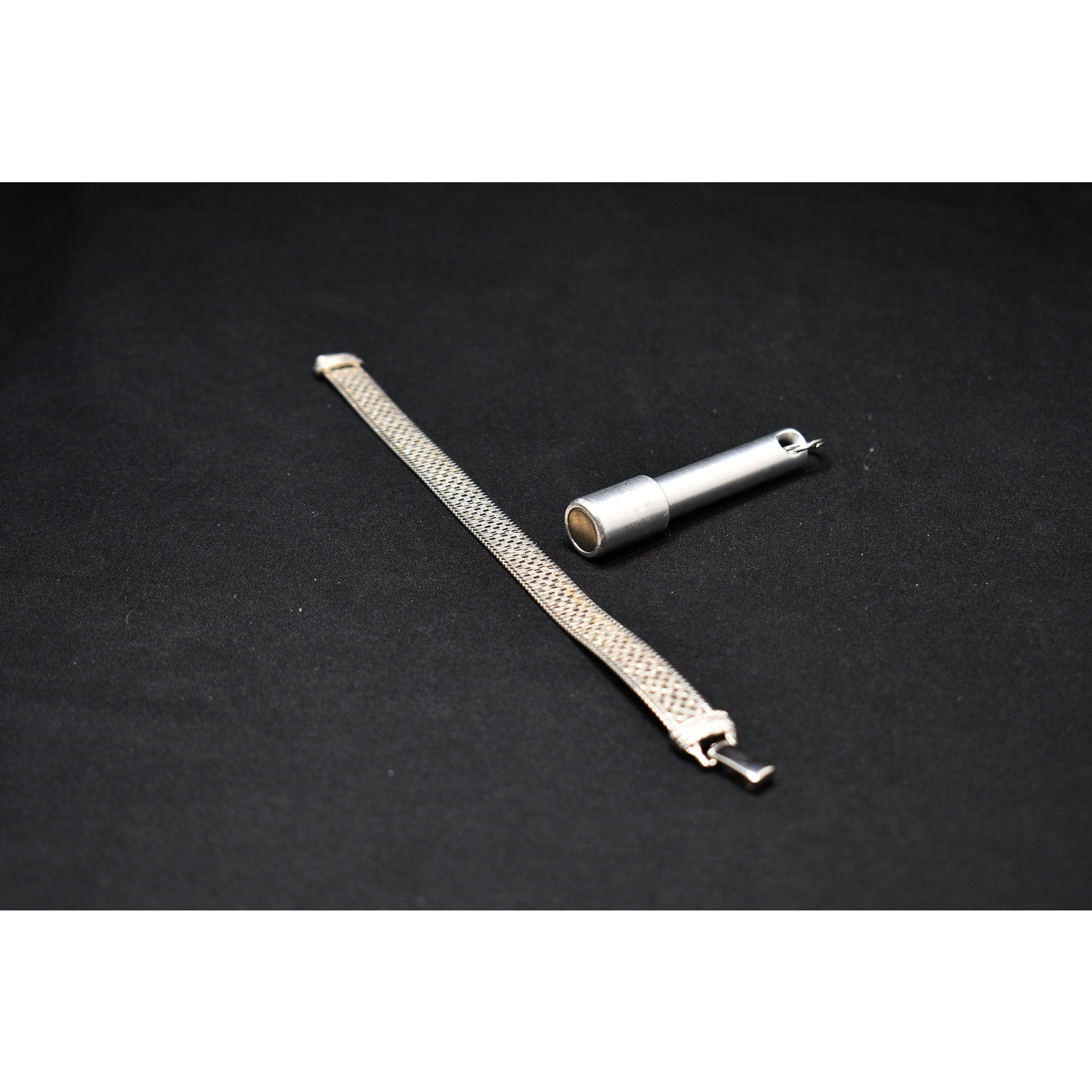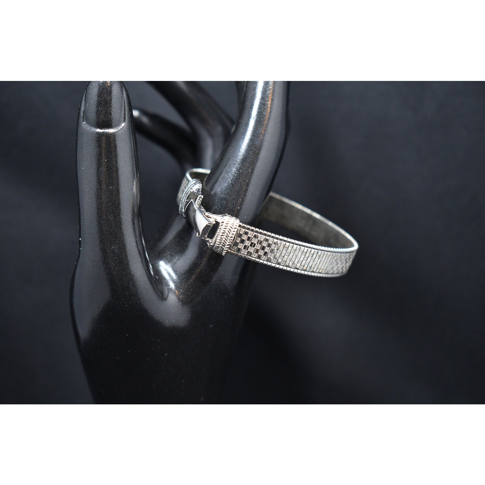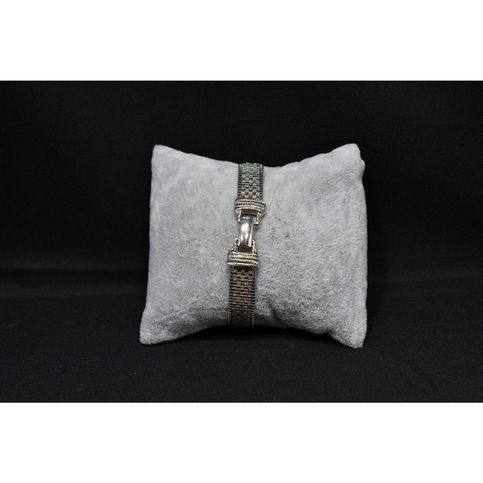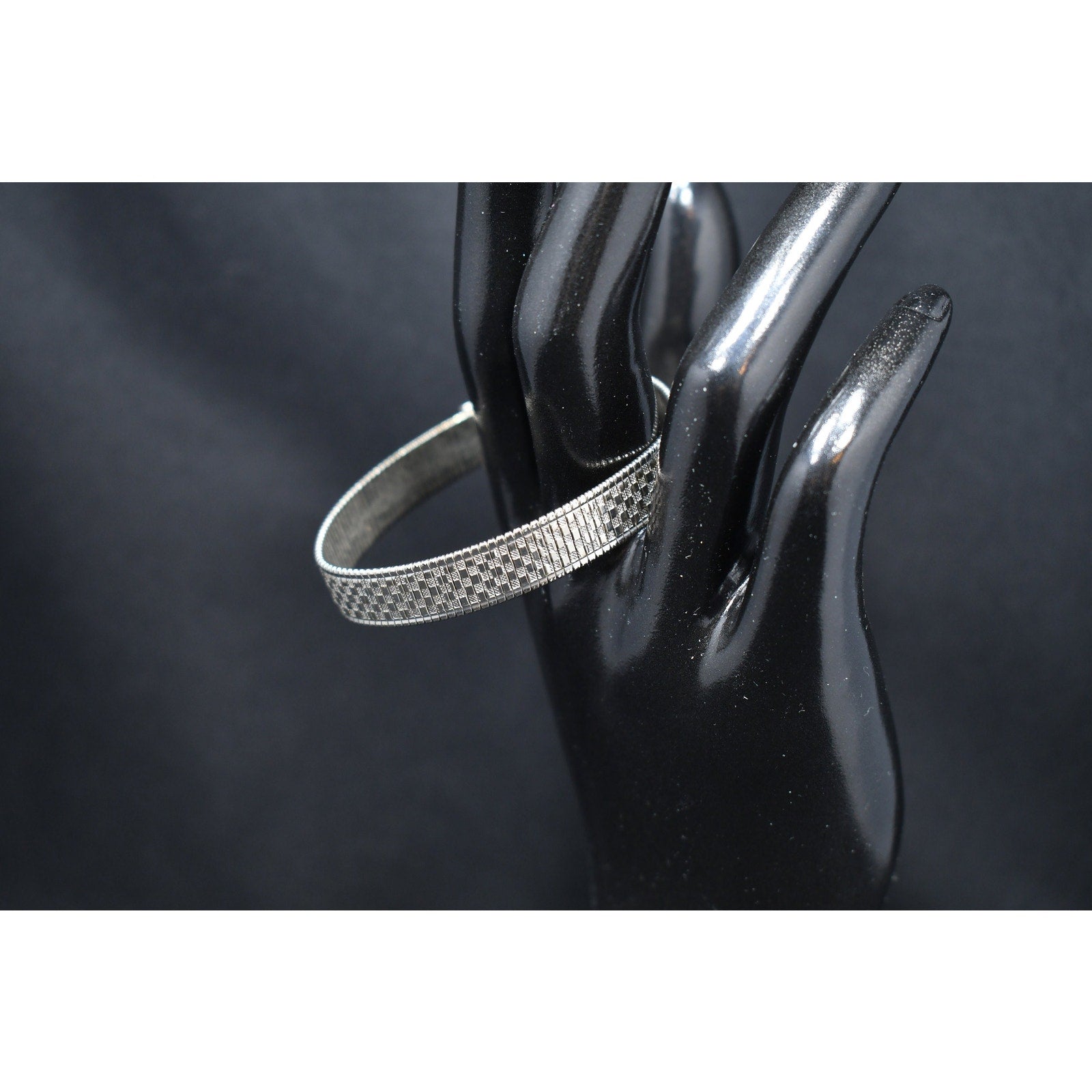 *Description: This is a beautiful mid-century flexible silver tone bracelet by Goldette from the 1950s or before. The bracelet is designed in two shades of silver tone metal which makes the design look like tiny squares on a smooth surface. This would be a great bracelet to give as a gift or add to your vintage jewelry collection.