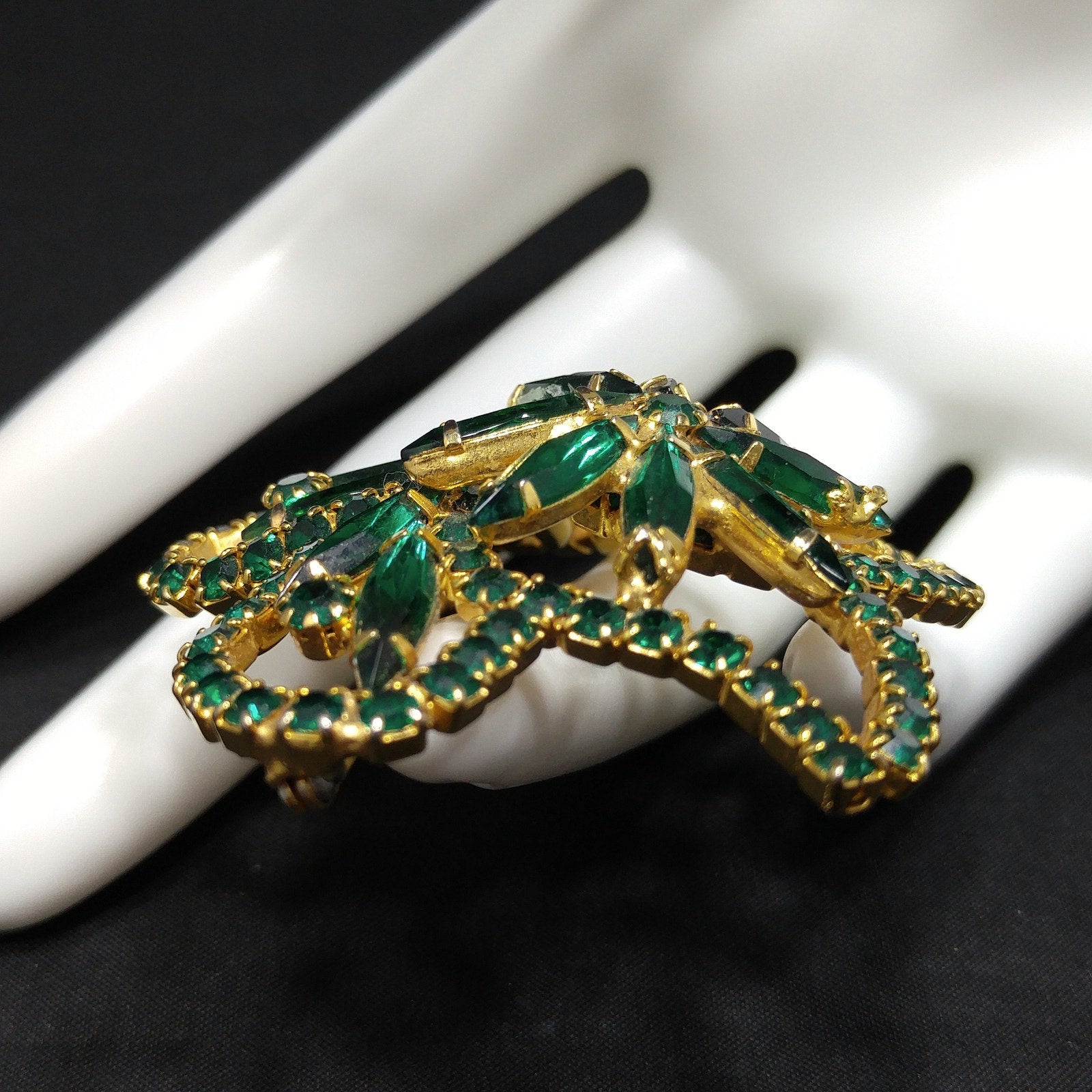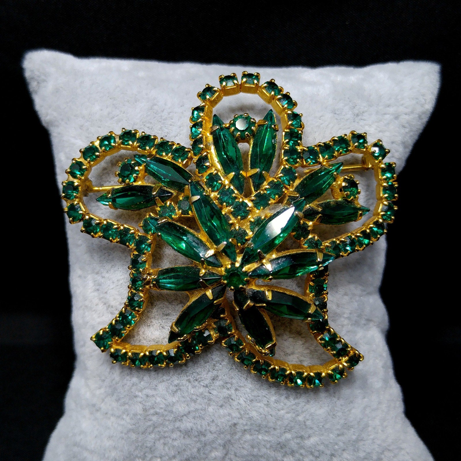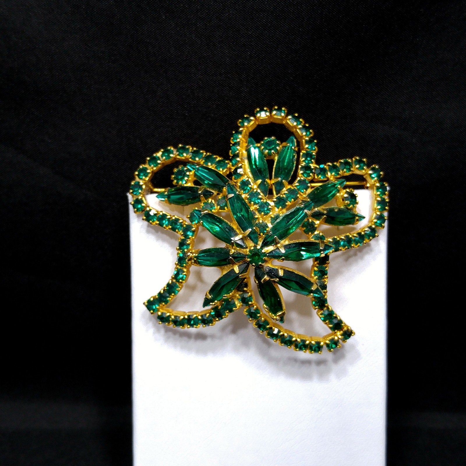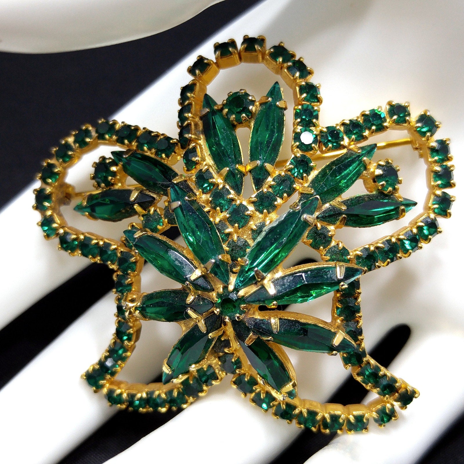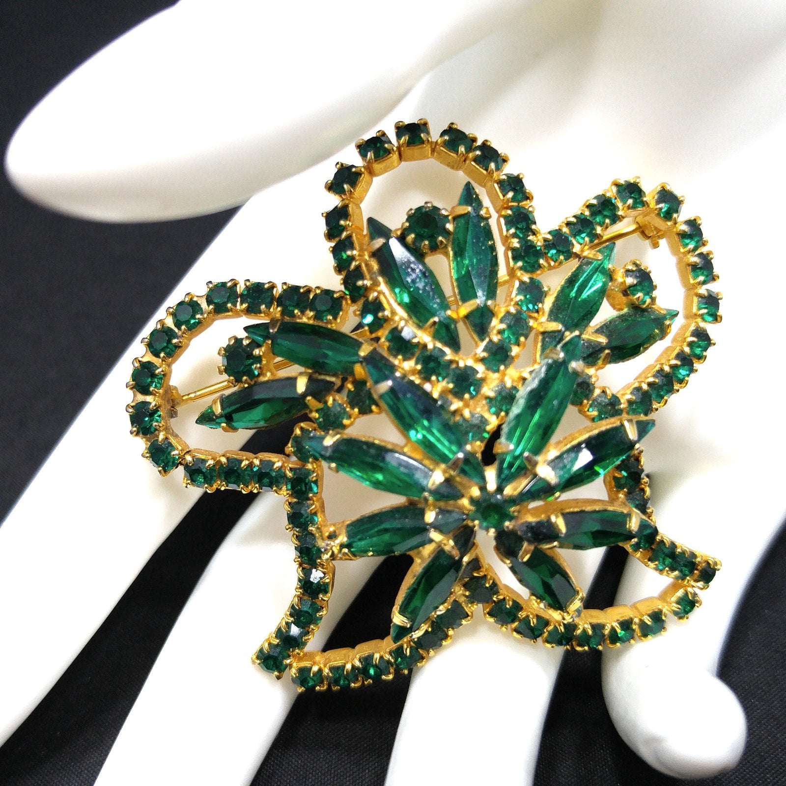 *Description: This is a beautiful emerald green rhinestone brooch on a gold plated background from the 1960s. The floral design has petals outlined in green chaton cut rhinestones and in the center and within the rounded petals are green rhinestone navettes. The center is slightly raised with its prong set navette rhinestones with a matching center chaton cut rhinestone. The swirling rhinestone brooch is very light in weight at .8 ounce. This would be a great addition to your vintage jewelry collection or make a great vintage gift!