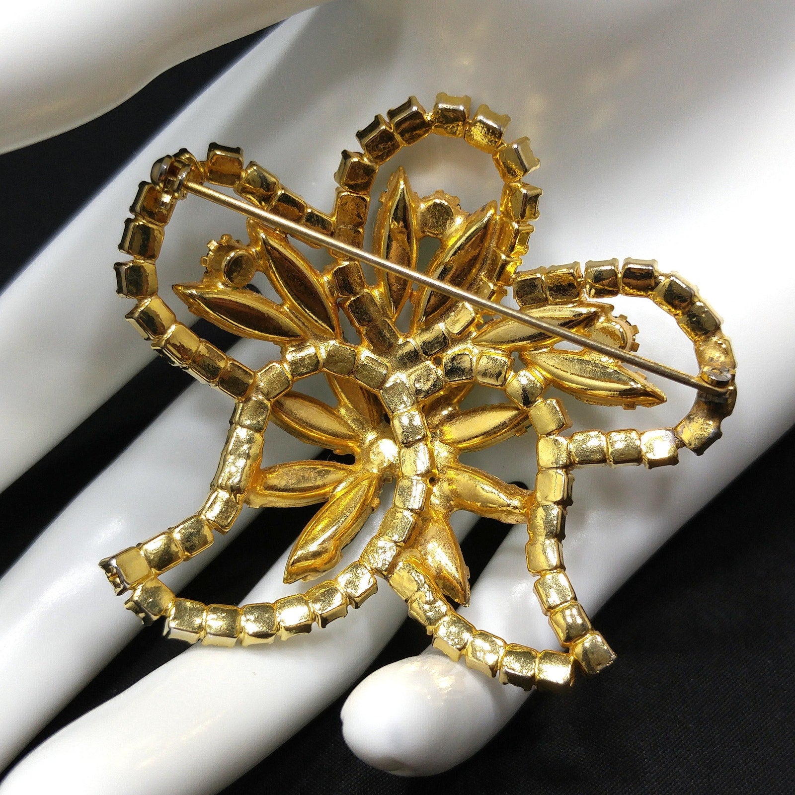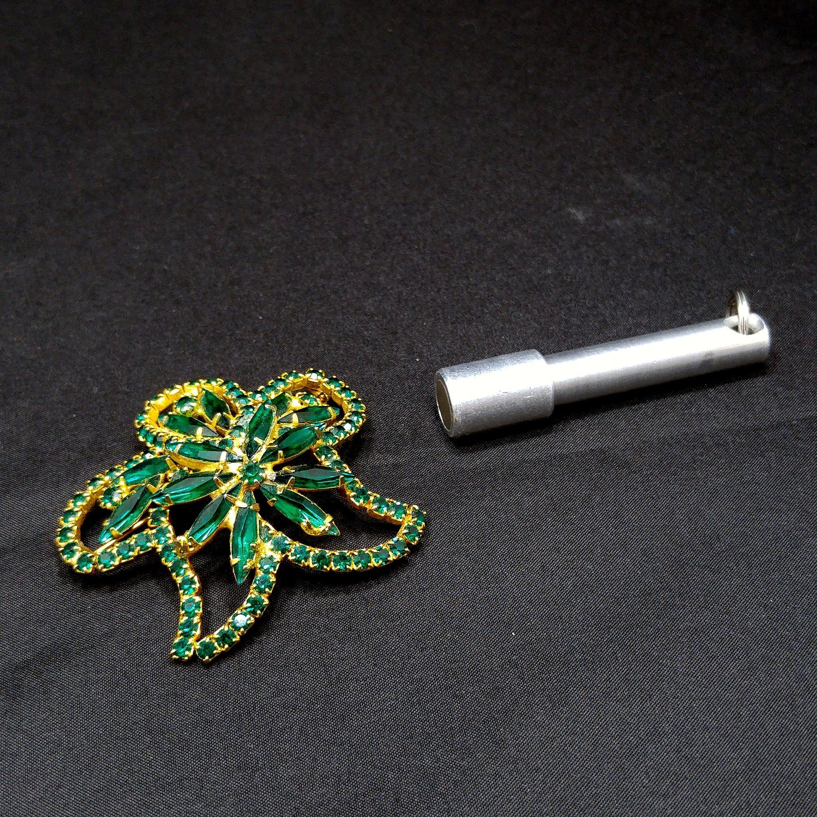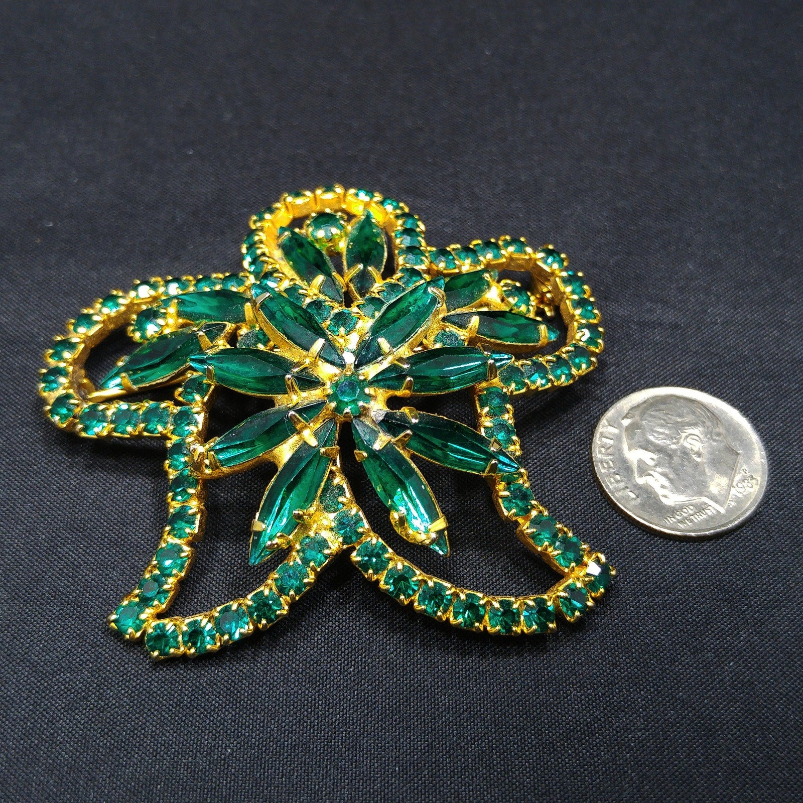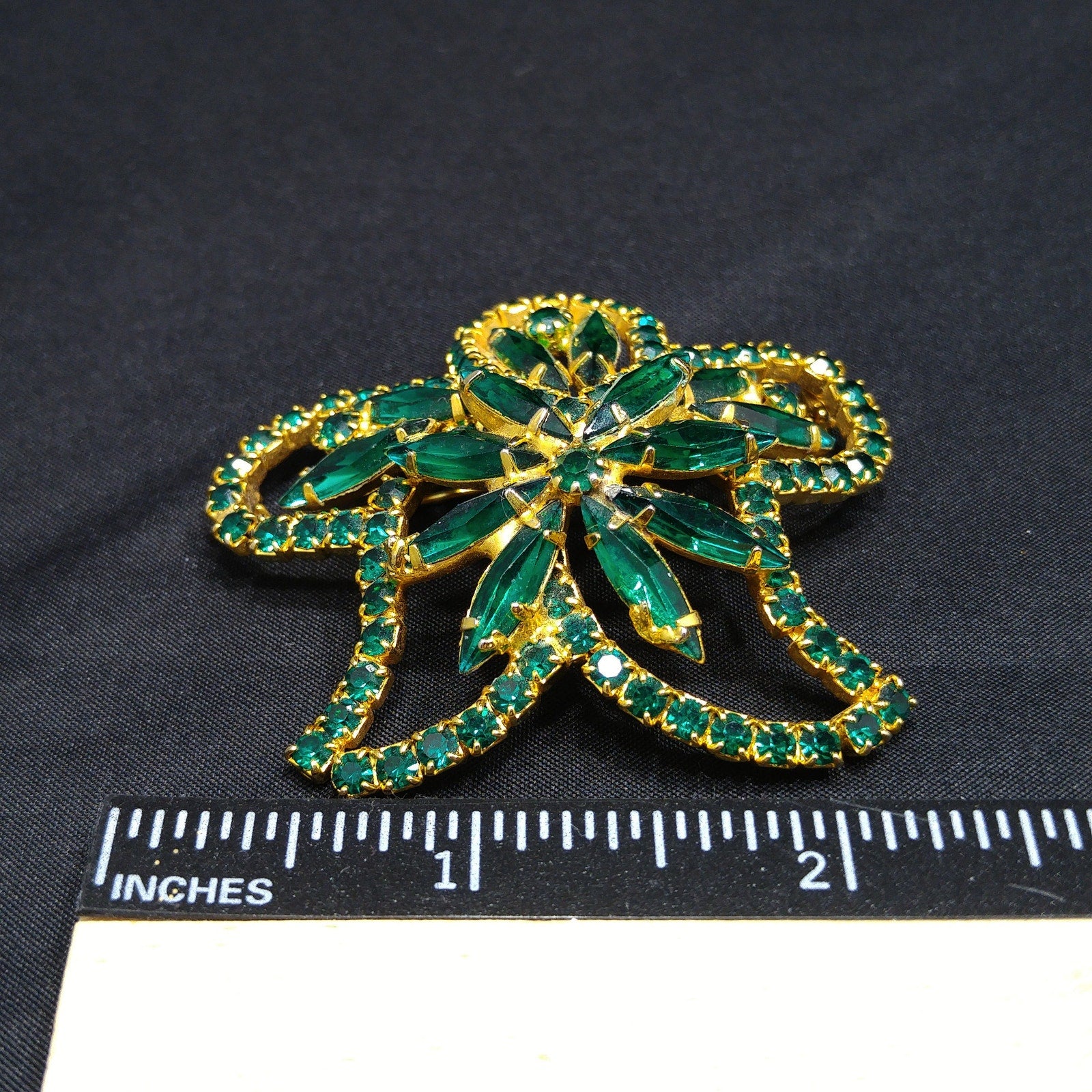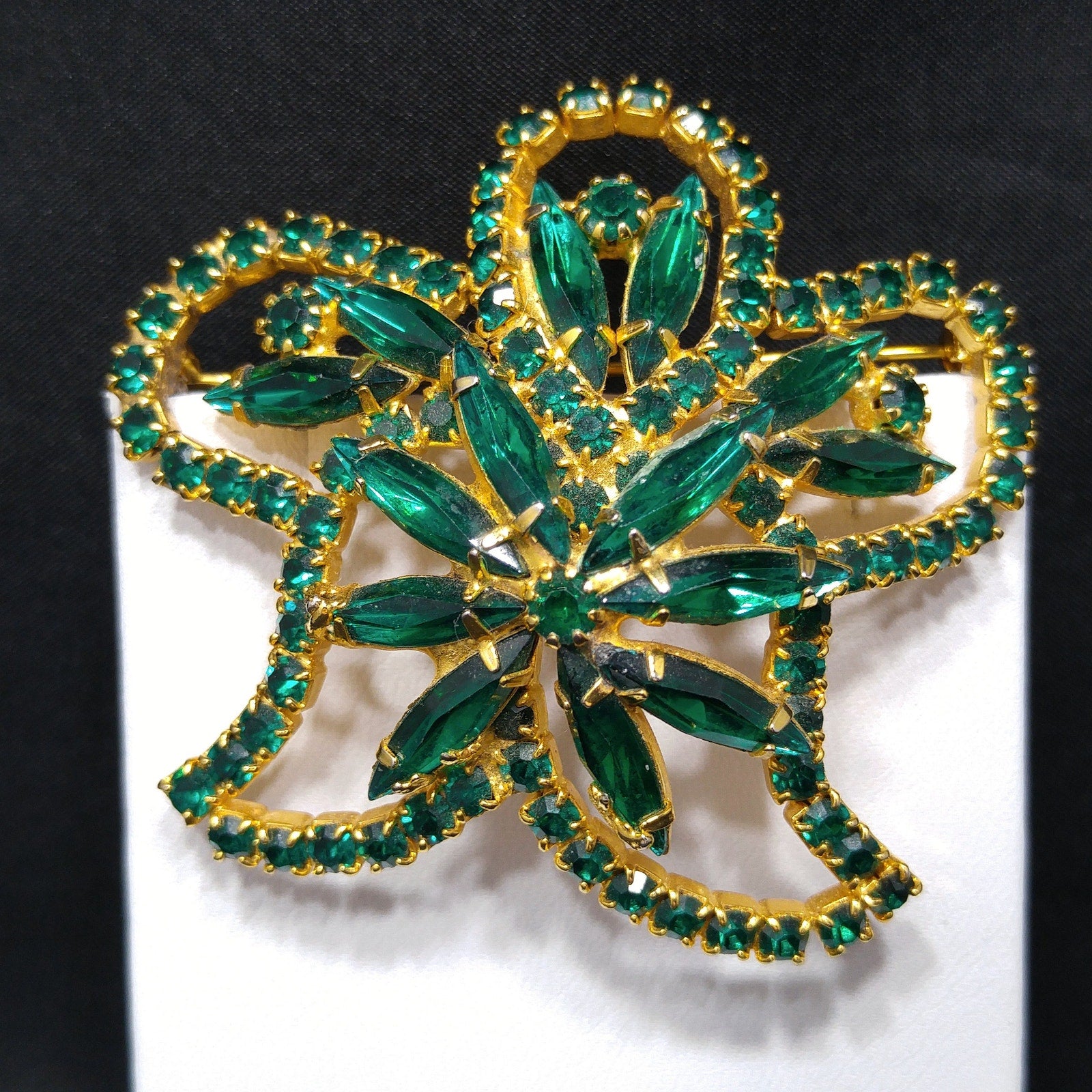 *Description: This is a beautiful emerald green rhinestone brooch on a gold plated background from the 1960s. The floral design has petals outlined in green chaton cut rhinestones and in the center and within the rounded petals are green rhinestone navettes. The center is slightly raised with its prong set navette rhinestones with a matching center chaton cut rhinestone. The swirling rhinestone brooch is very light in weight at .8 ounce. This would be a great addition to your vintage jewelry collection or make a great vintage gift!