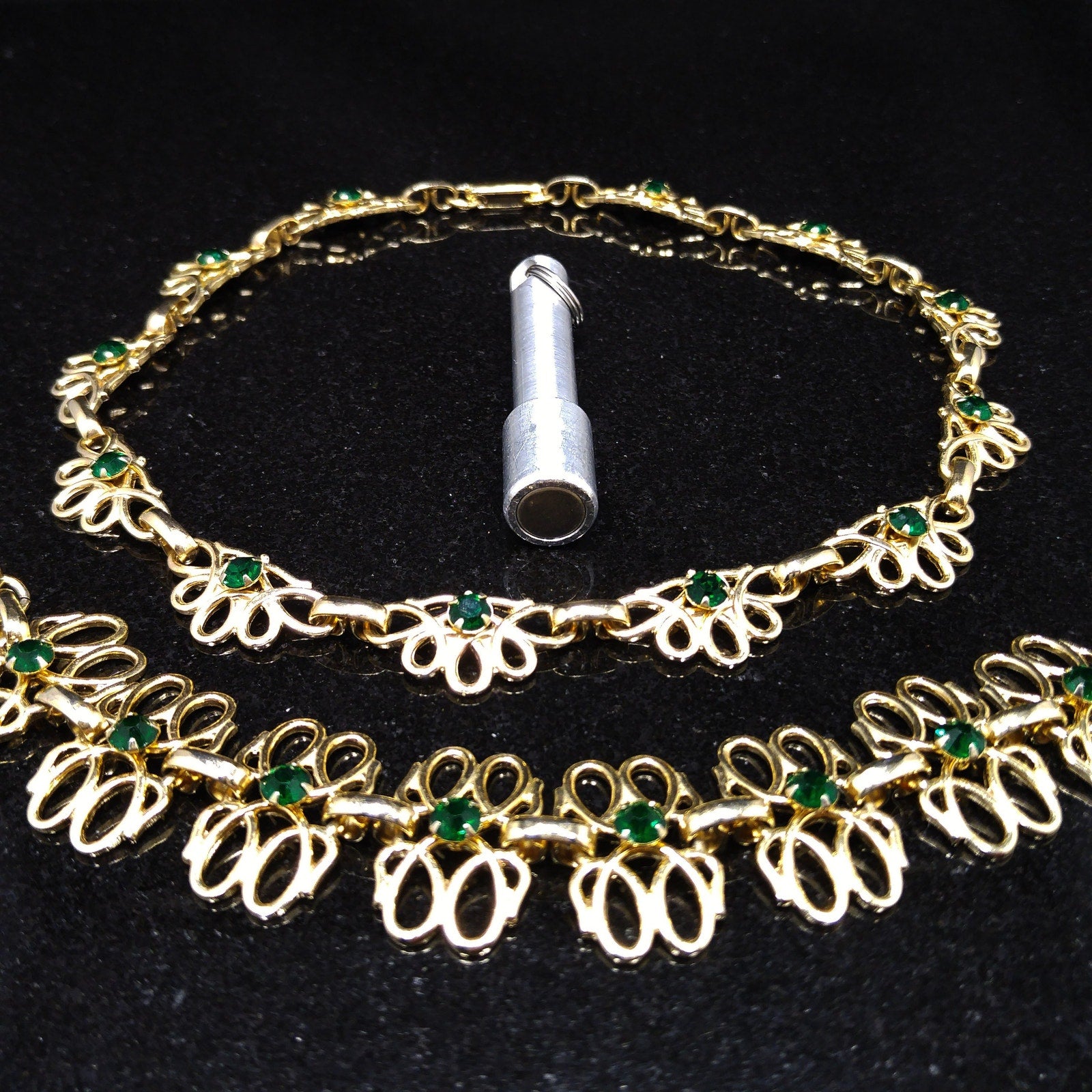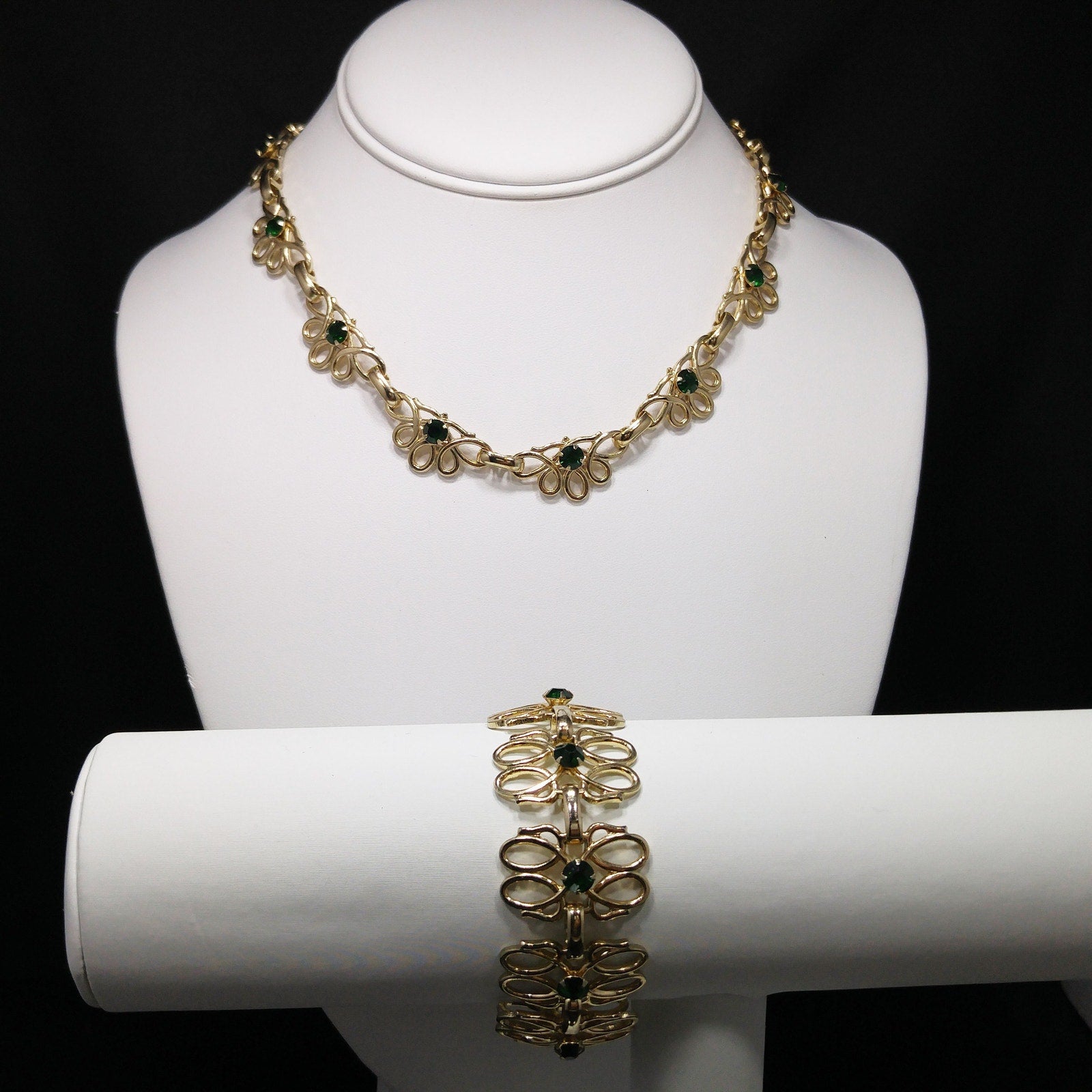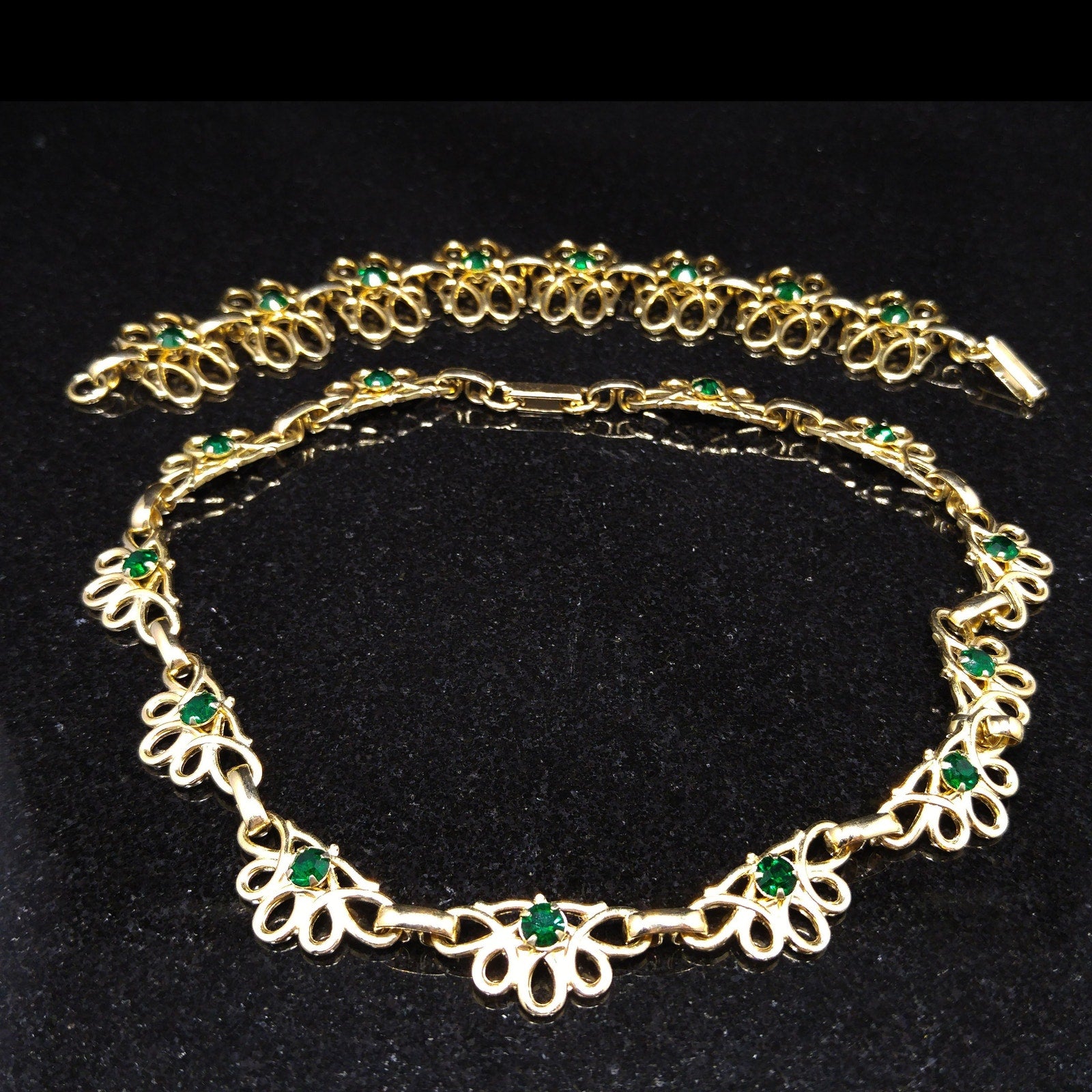 *Description: This is a beautiful gold tone linked necklace and bracelet with matching emerald green prong set rhinestones. Both pieces have fold over clasp and each link has a rivet on the back which holds the rhinestone. This is a great mid-century set which is in great condition. This would be a great addition to your vintage jewelry collection or make a great vintage gift!