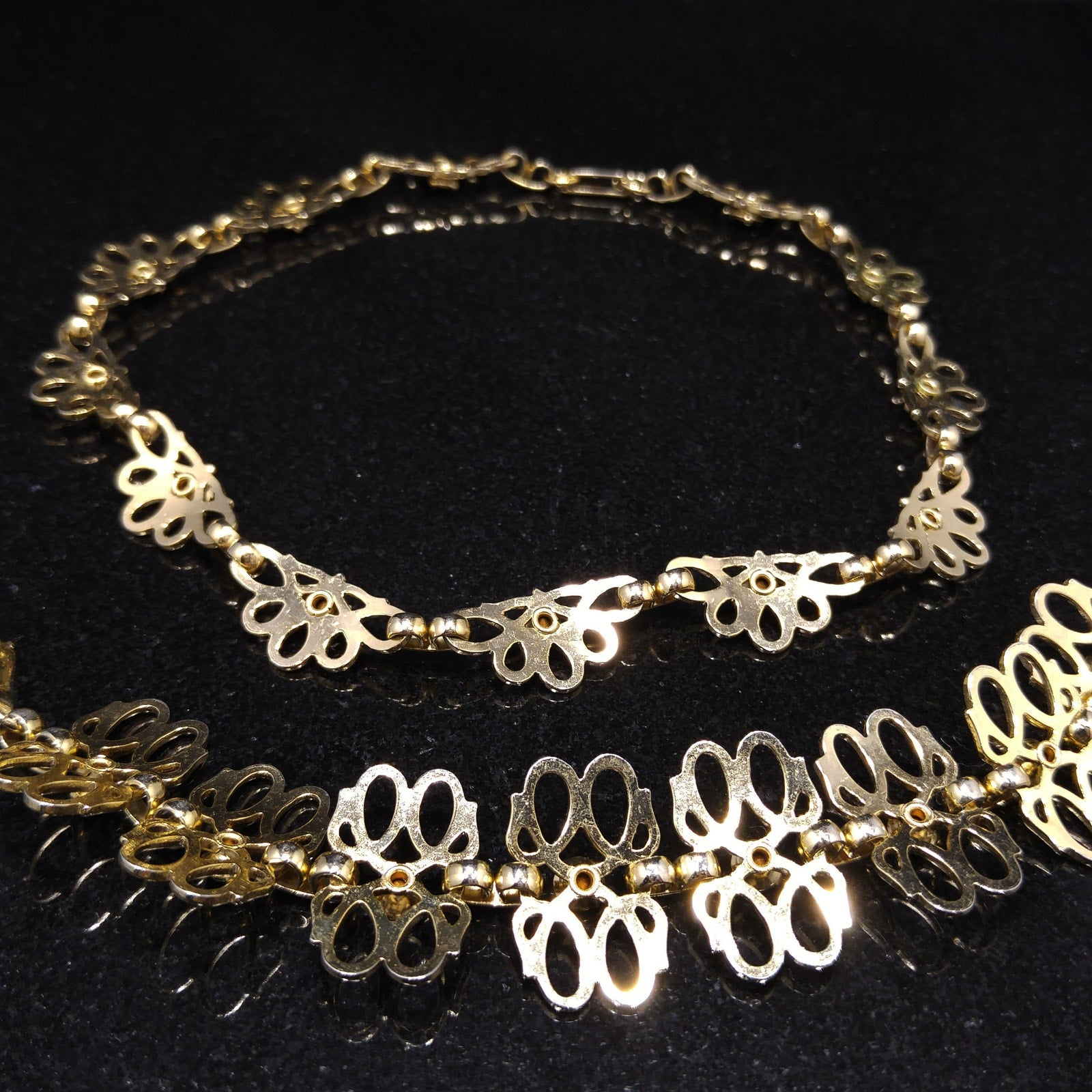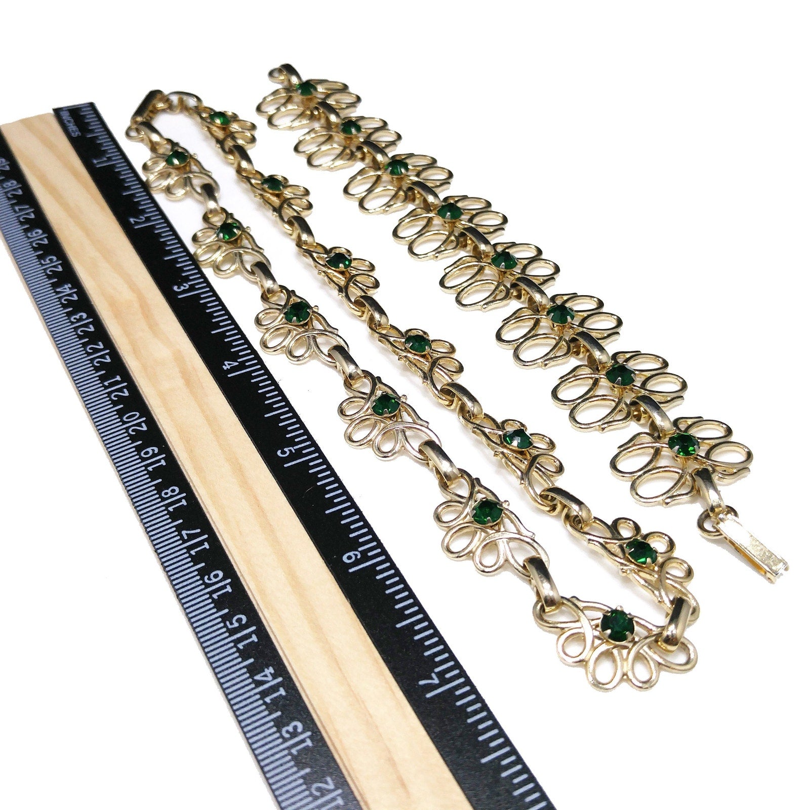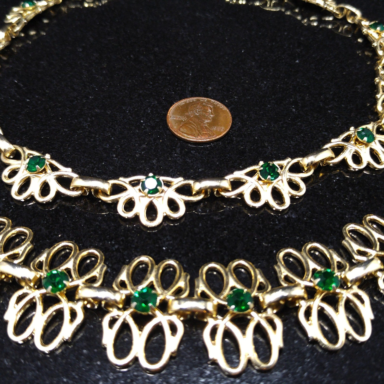 *Description: This is a beautiful gold tone linked necklace and bracelet with matching emerald green prong set rhinestones. Both pieces have fold over clasp and each link has a rivet on the back which holds the rhinestone. This is a great mid-century set which is in great condition. This would be a great addition to your vintage jewelry collection or make a great vintage gift!