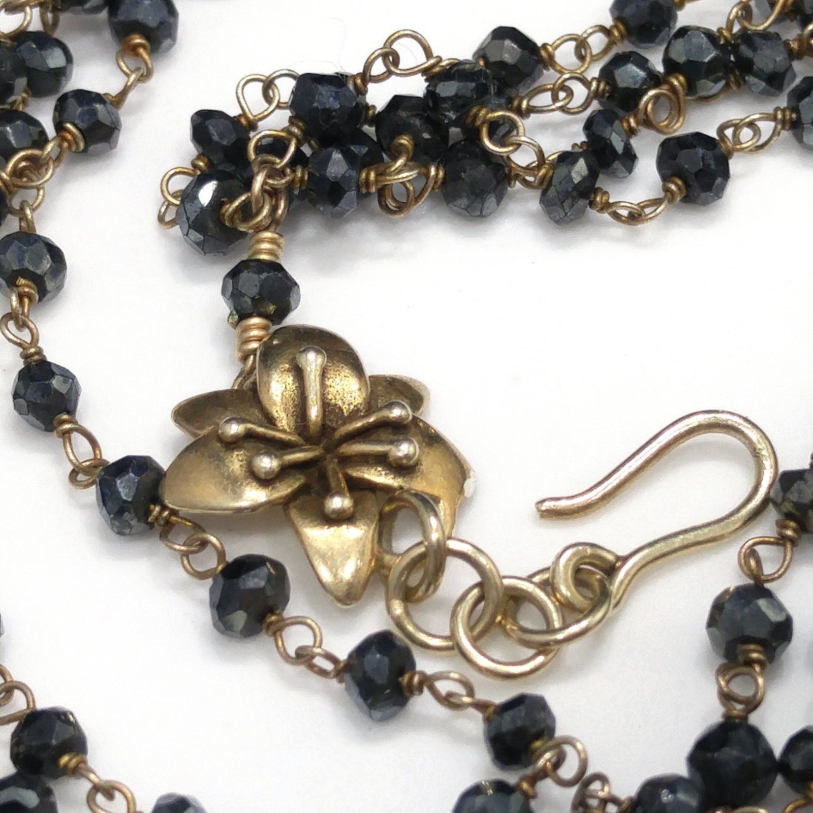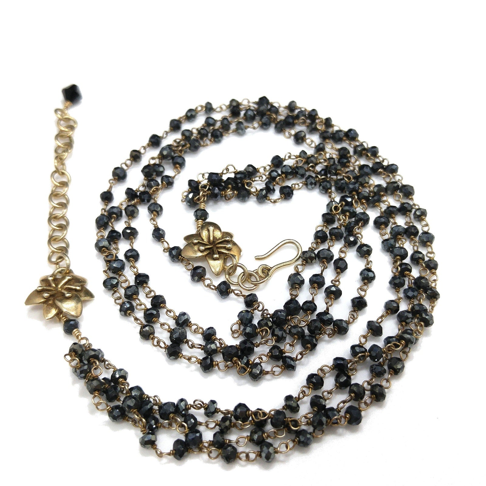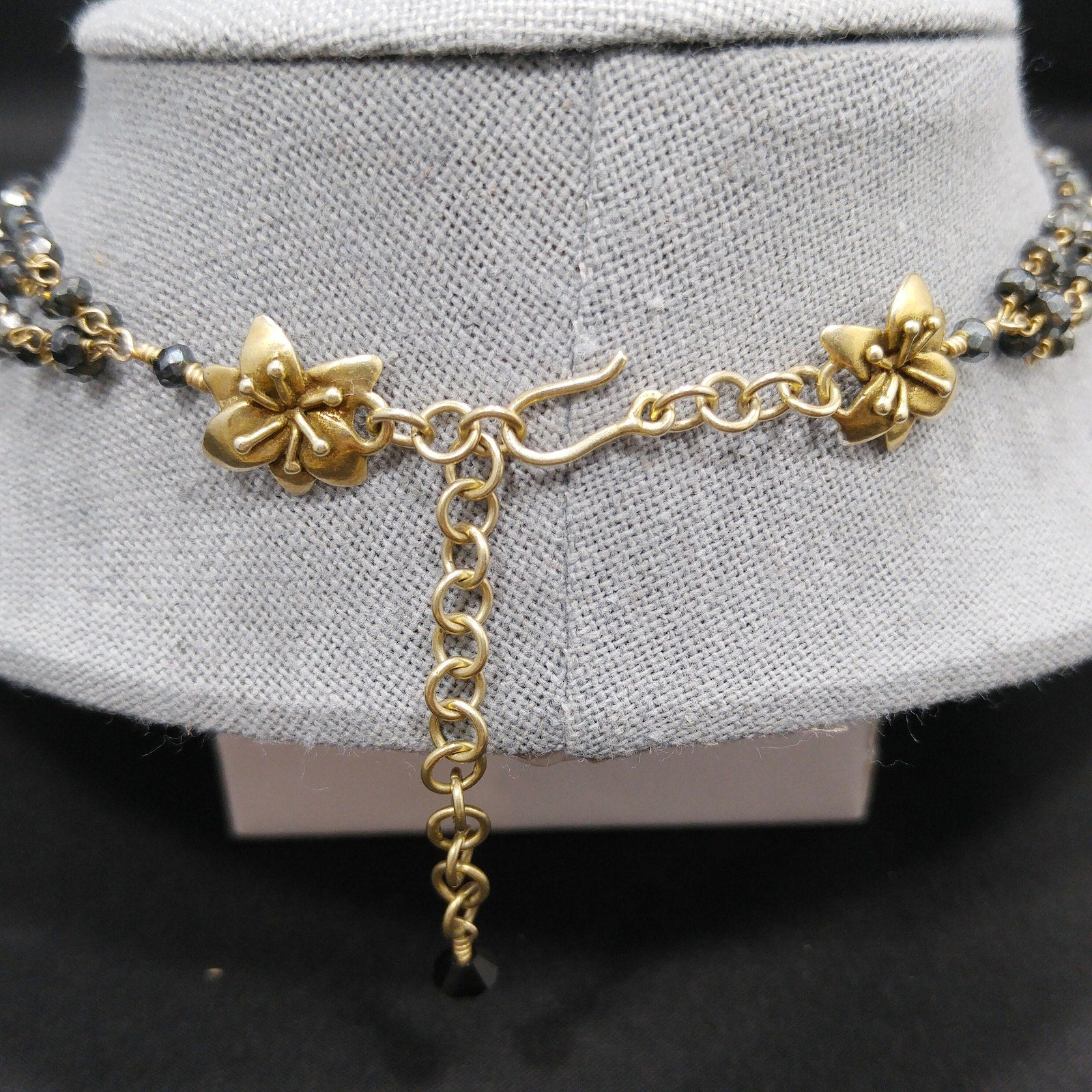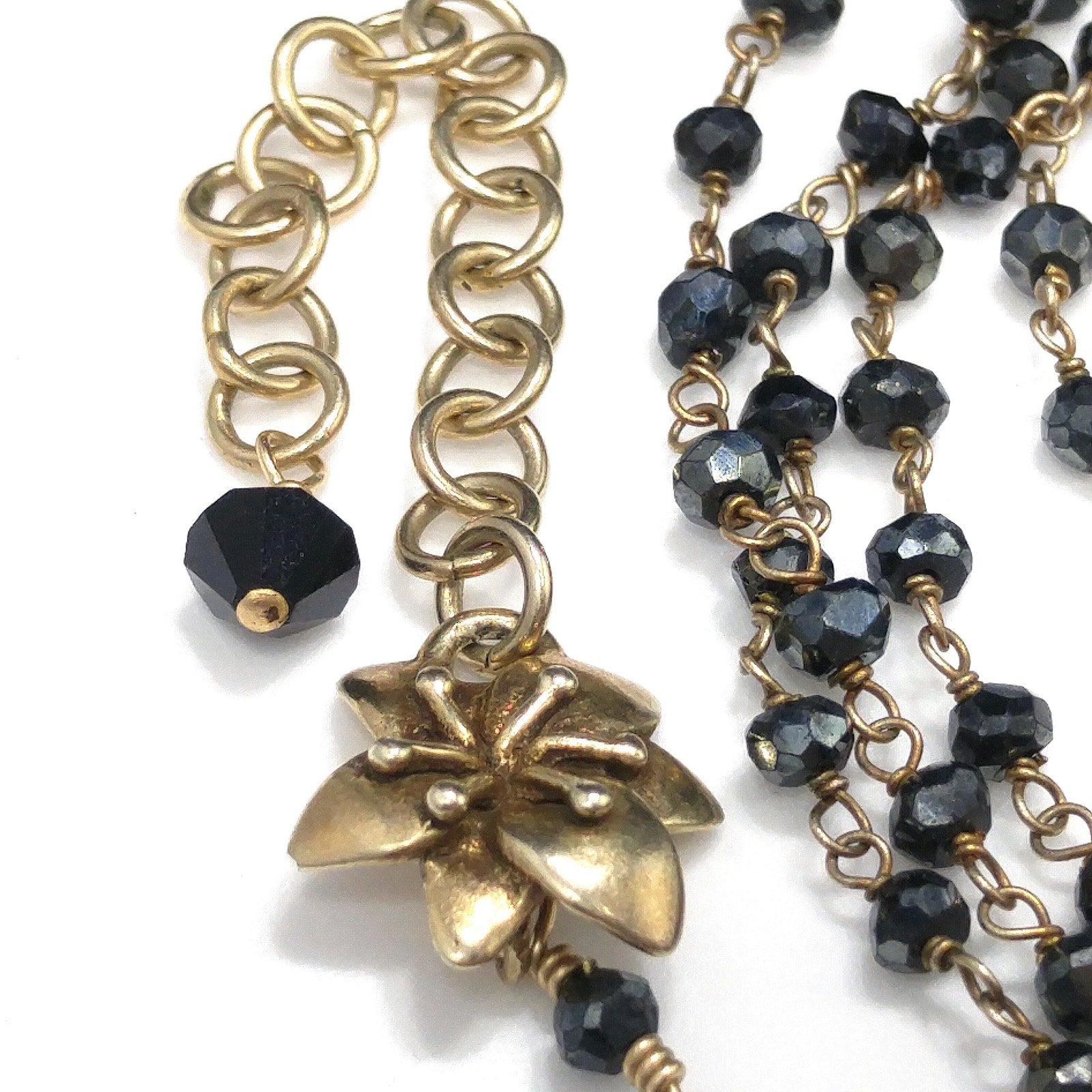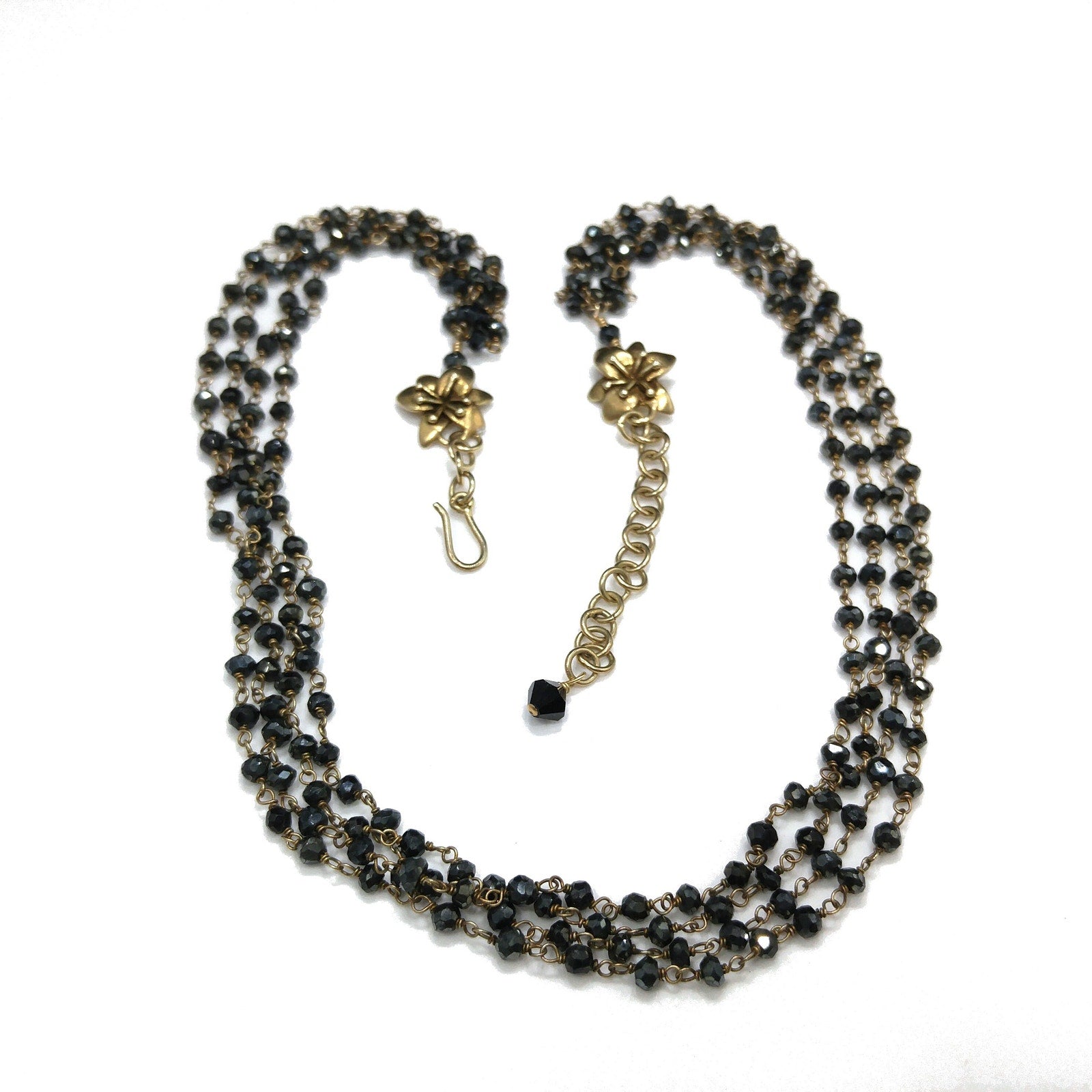 *Description: This is a very special necklace from the 1940s or before with gray hand cut crystal beads on wire which has been hand wrapped. There are two flowers which are end pieces and tested both silver and gold so I believe they are silver on the inside which has been dipped in gold, called vermeil. Each of the tiny beads are all individual sizes due to the hand cutting. They tested on my Presidium Gem Tester as quartz. There is a black bead on the end of the extension chain. It is a dainty necklace, light in weight, with a lot of hand work. This would be a great addition to your vintage jewelry collection or make a great vintage gift!