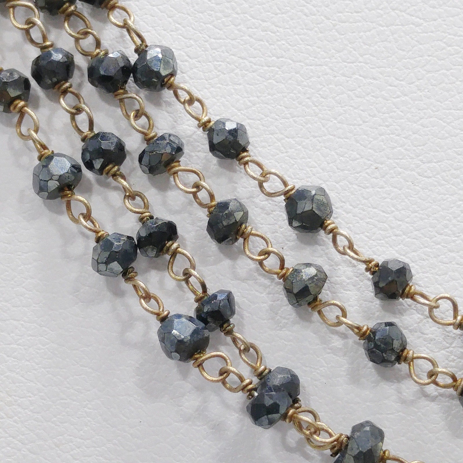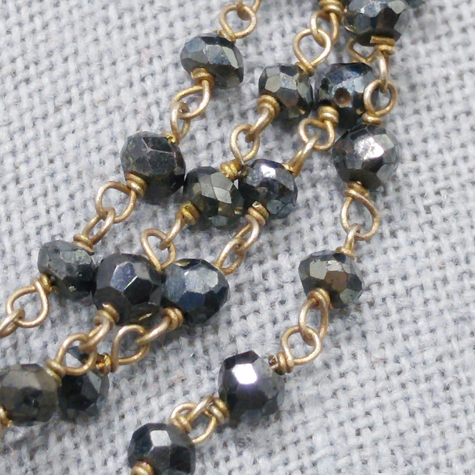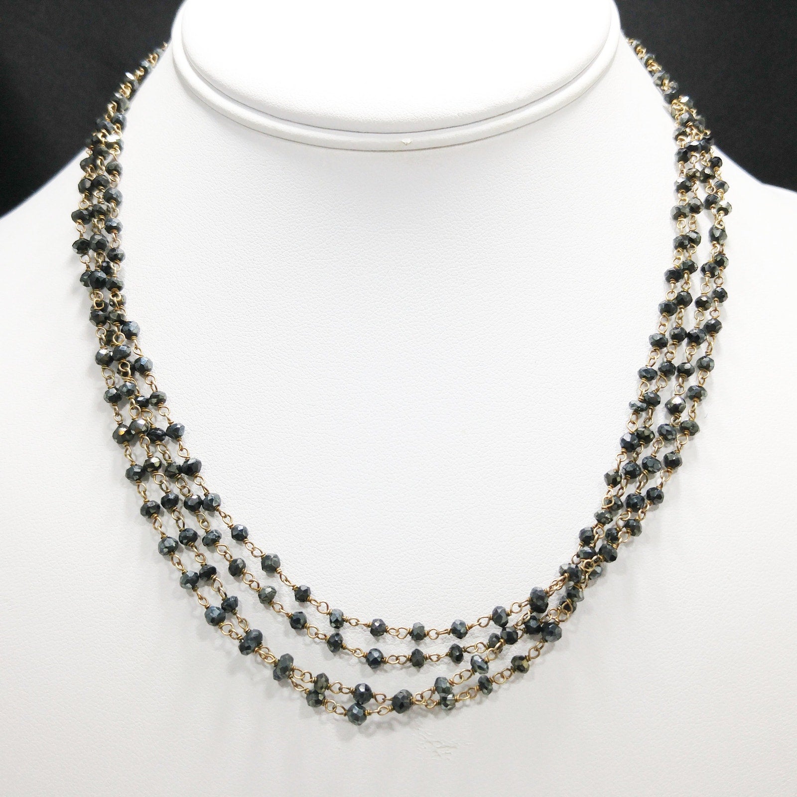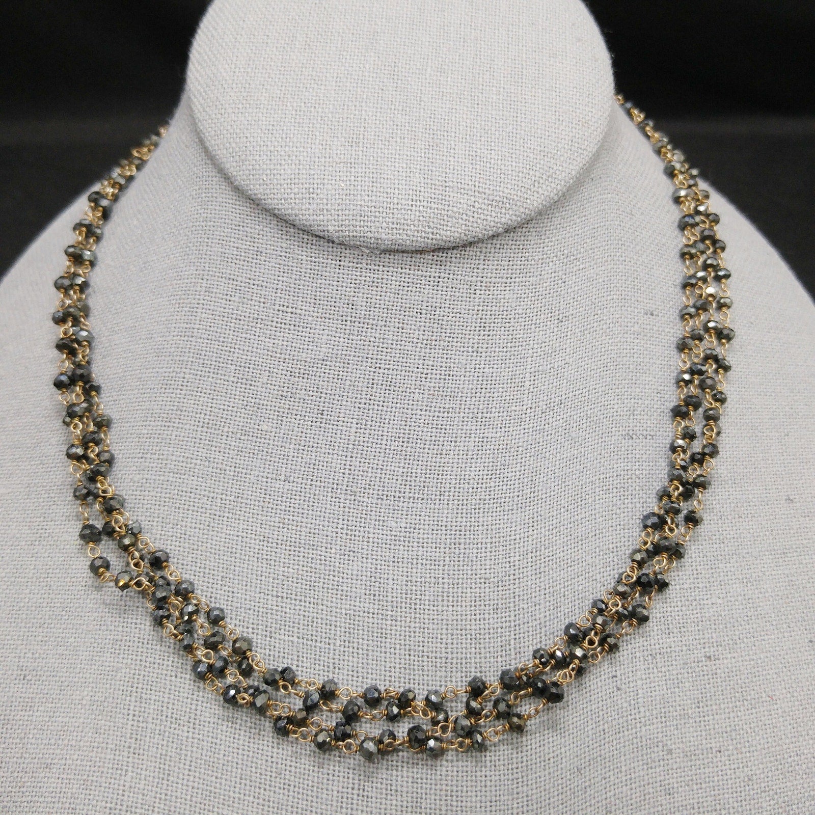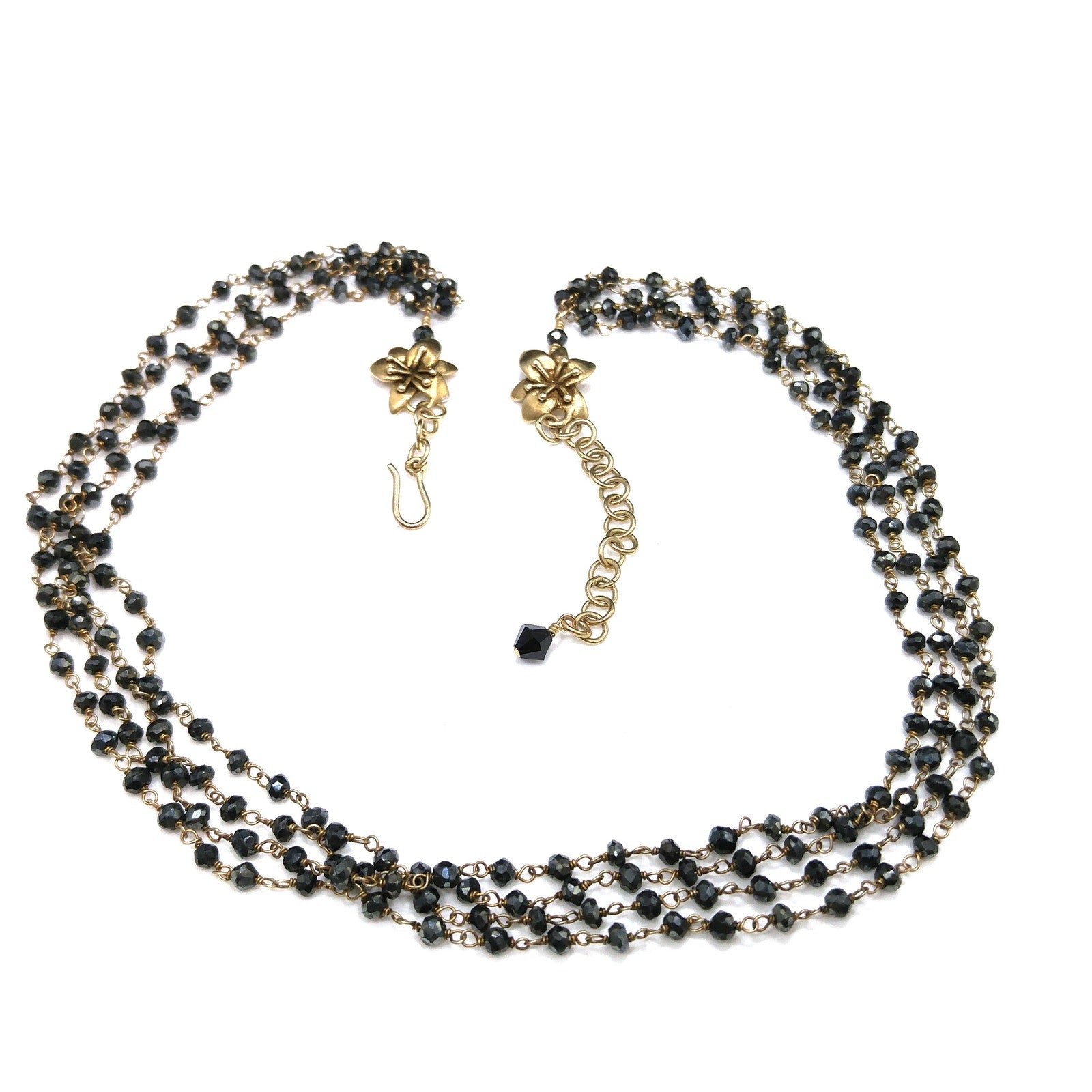 *Description: This is a very special necklace from the 1940s or before with gray hand cut crystal beads on wire which has been hand wrapped. There are two flowers which are end pieces and tested both silver and gold so I believe they are silver on the inside which has been dipped in gold, called vermeil. Each of the tiny beads are all individual sizes due to the hand cutting. They tested on my Presidium Gem Tester as quartz. There is a black bead on the end of the extension chain. It is a dainty necklace, light in weight, with a lot of hand work. This would be a great addition to your vintage jewelry collection or make a great vintage gift!