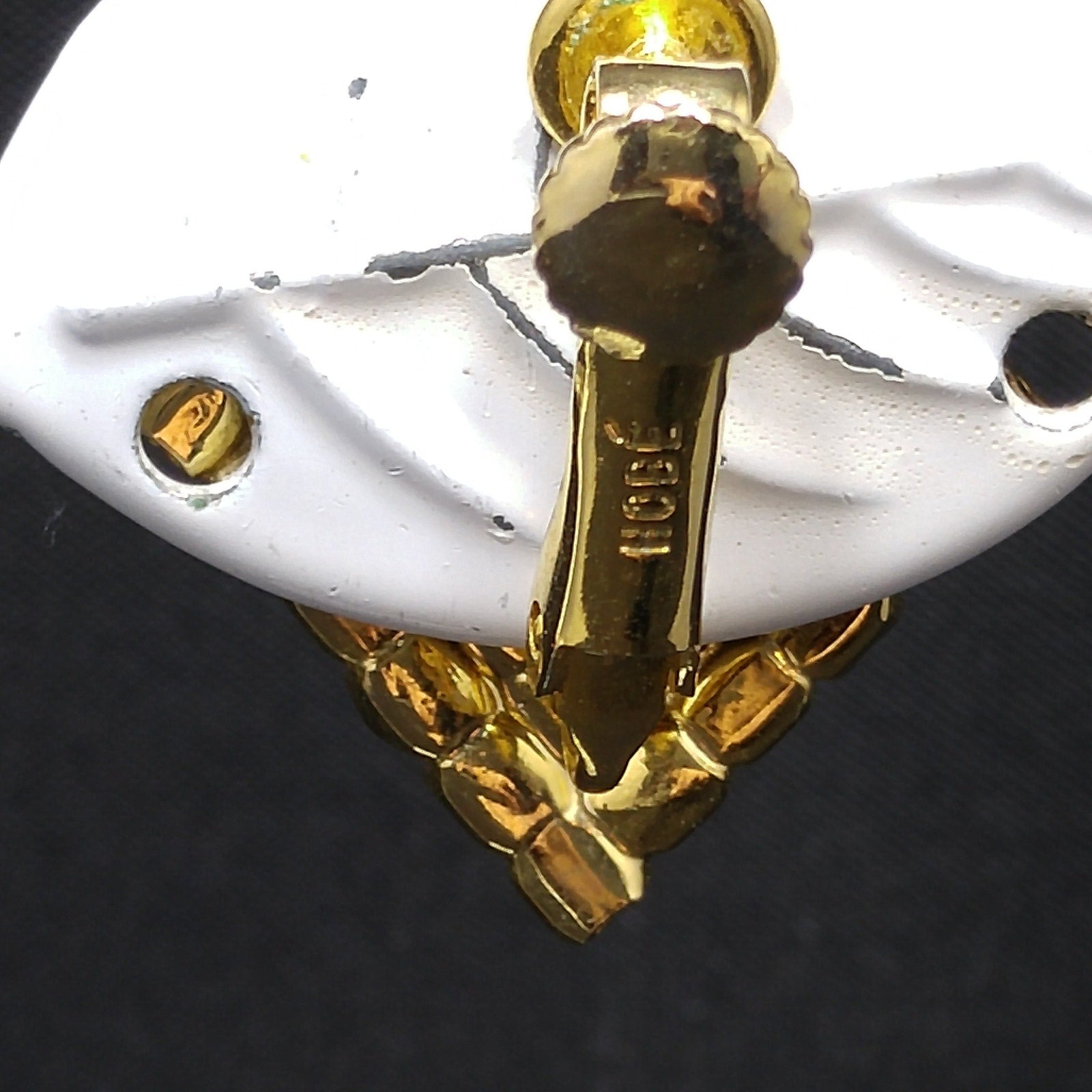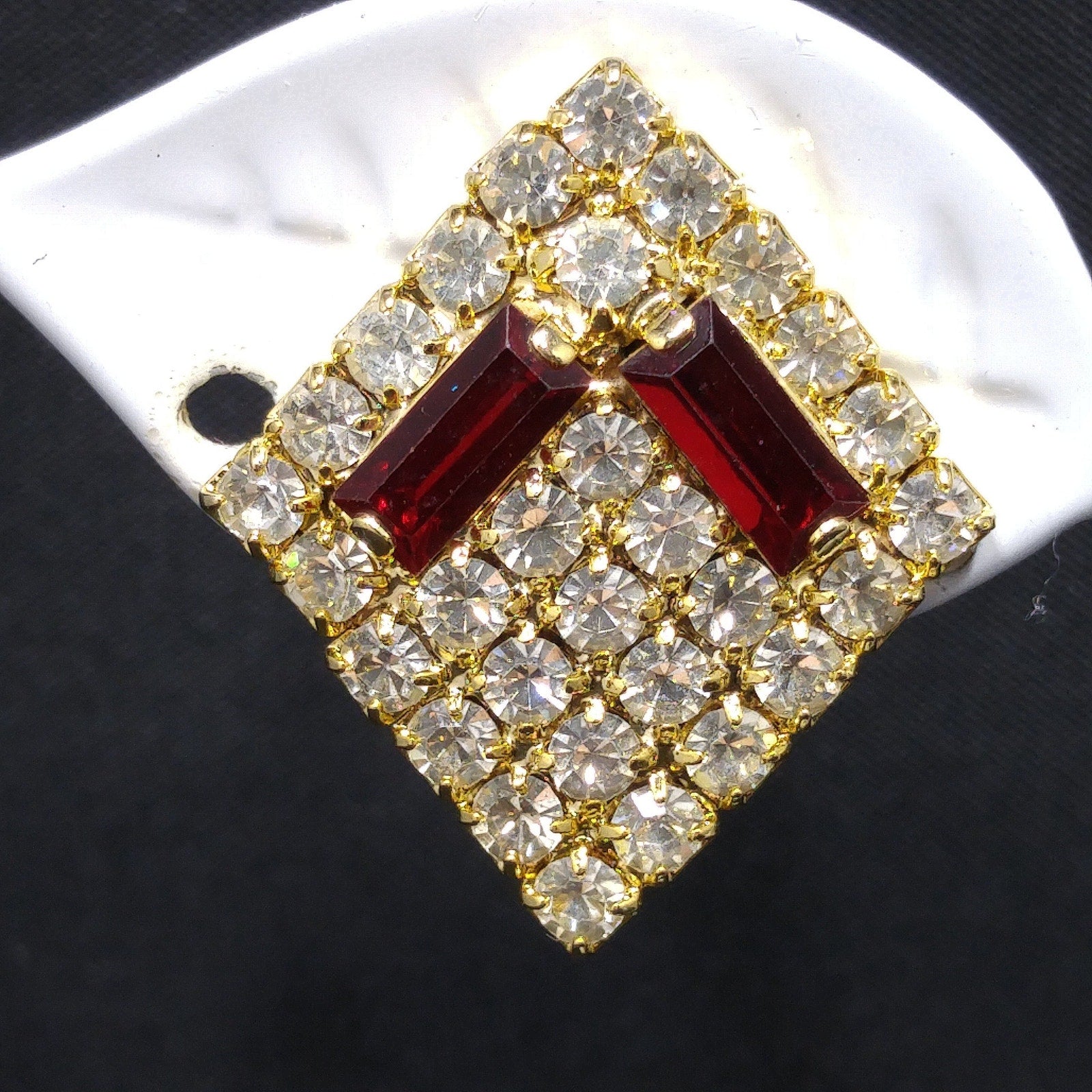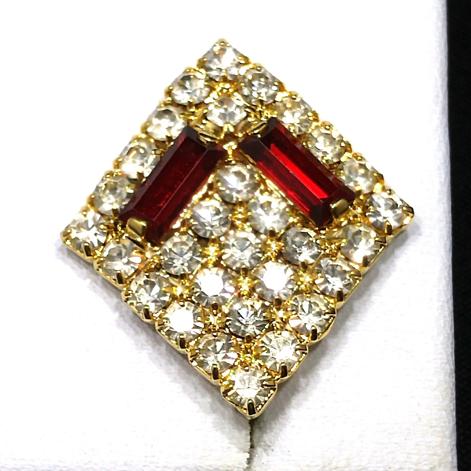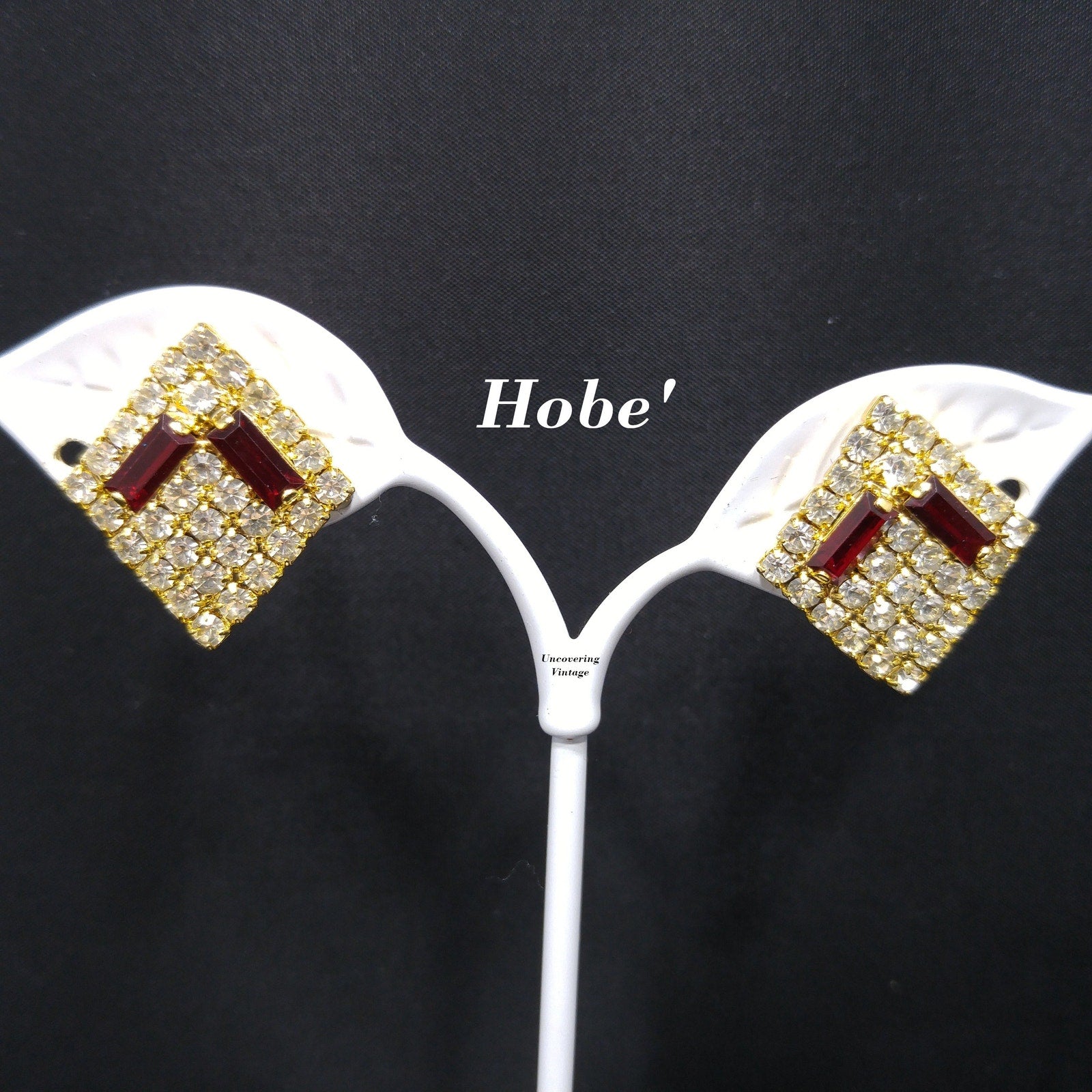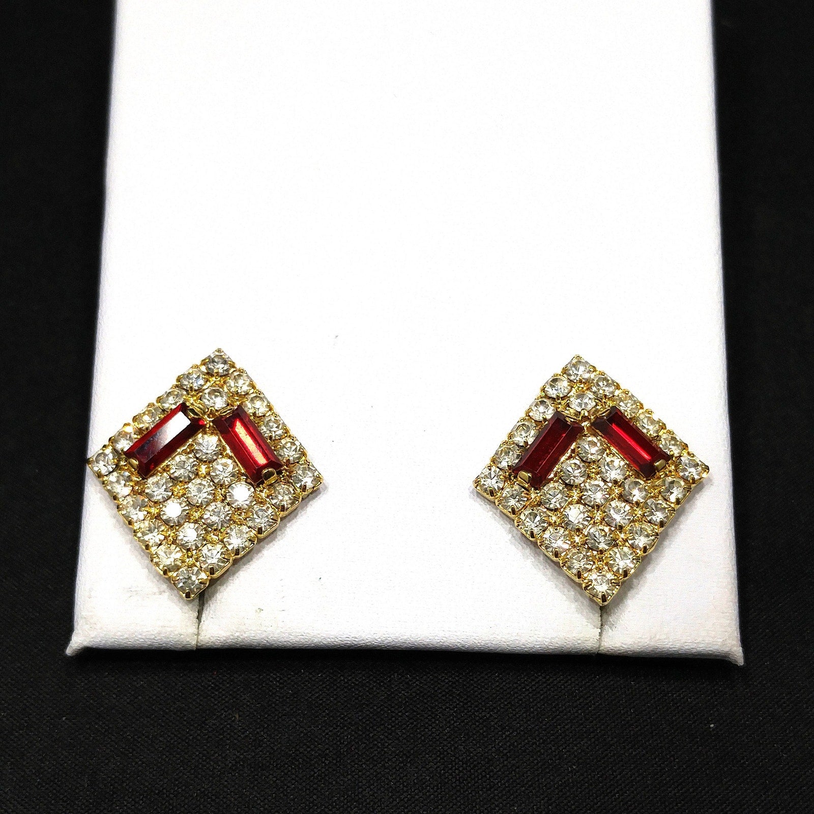 *Description: This is a beautiful designer pair of Hobe' clear and red rhinestone, diamond shaped clip on earrings from the 1960s. The red rhinestones are baguettes and prong set and surrounded by clear chaton cut rhinestones, also prong set. The earrings are gold plated. The earring clasp was the new design, at that time, with the screw on back which pulled out to form an adjustable clip on clasp. The earrings are light in weight and comfortable to wear. They are in great condition and would be a great addition to your vintage jewelry collection or make a great vintage gift!