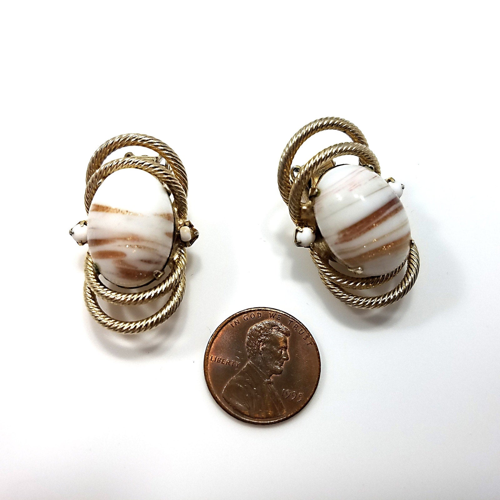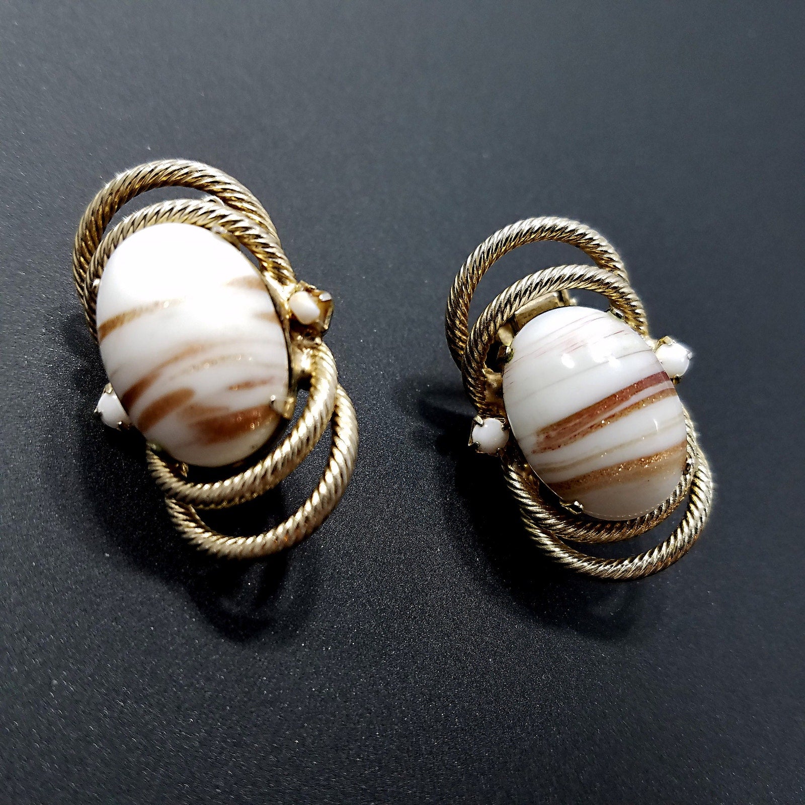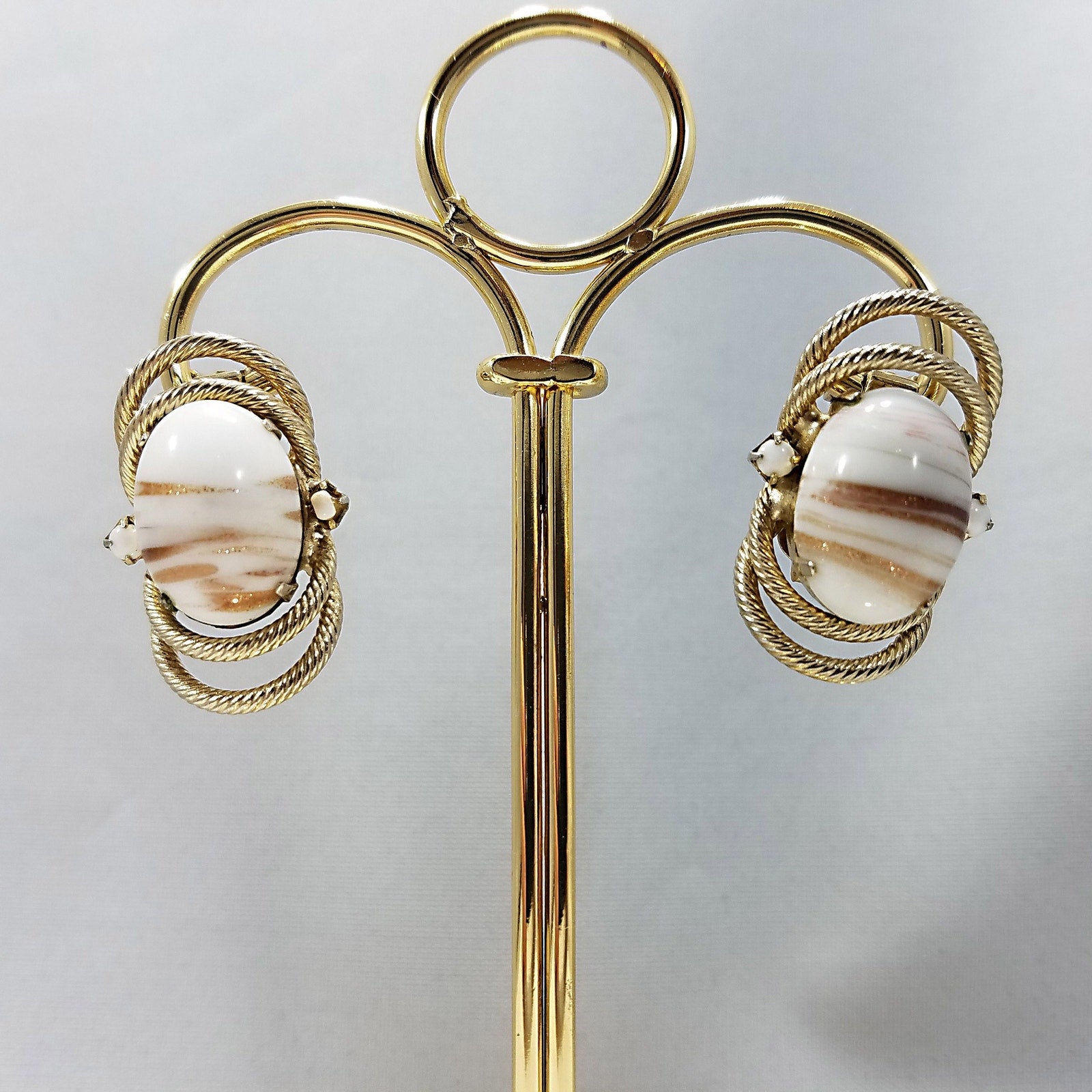 *Description: Beautiful vintage HOBE' clip earrings from the 1950s. The oval cabochon is white glass with gold sparkling swirls across the width of the glass. The cabochon is prong set with two small white beads prong set on each side. The art glass is framed with two gold plated twisted ropes on the top and bottom of each length of each earring. This is a classic Hobe' set of earrings and would make an excellent gift or a wonderful addition to your vintage jewelry collection.