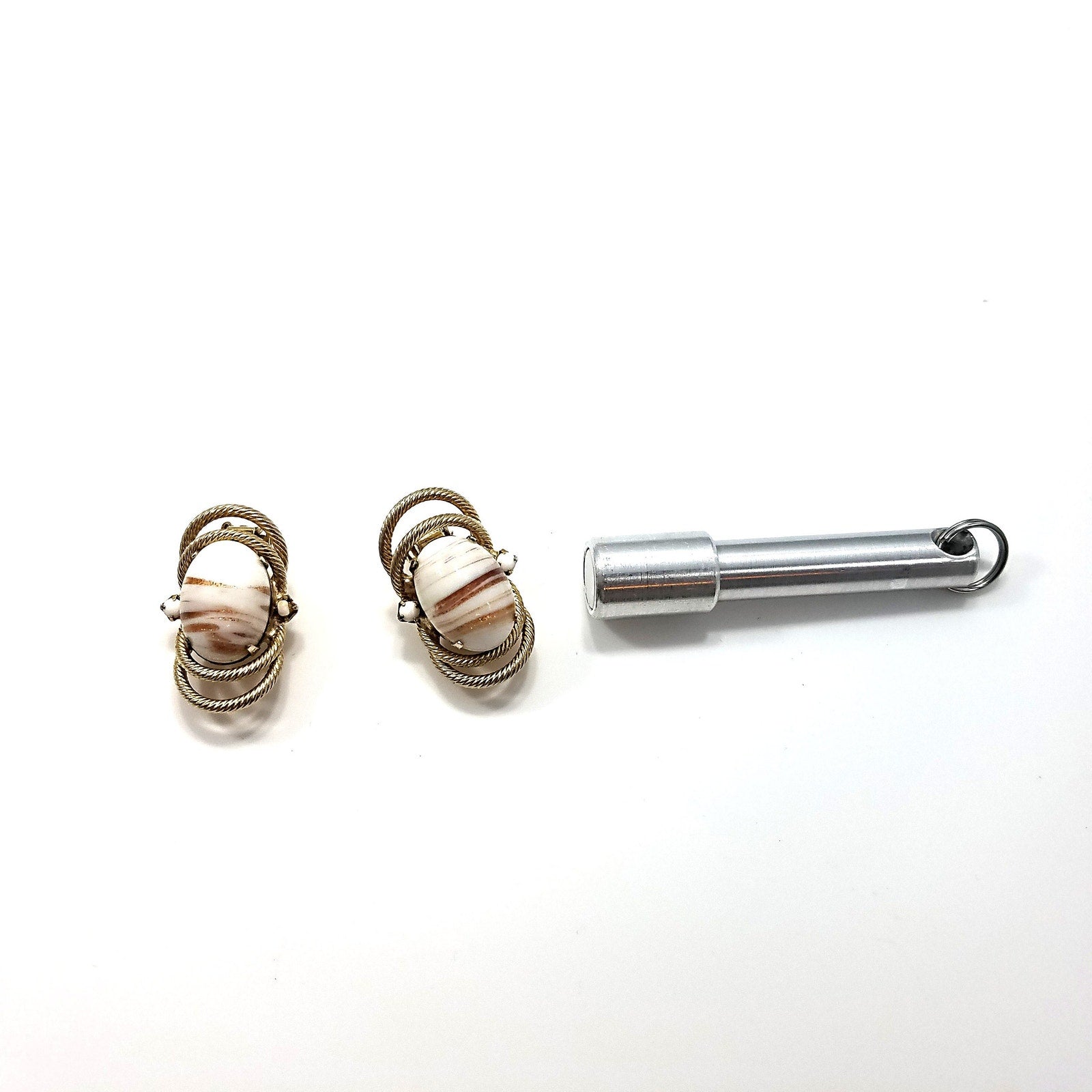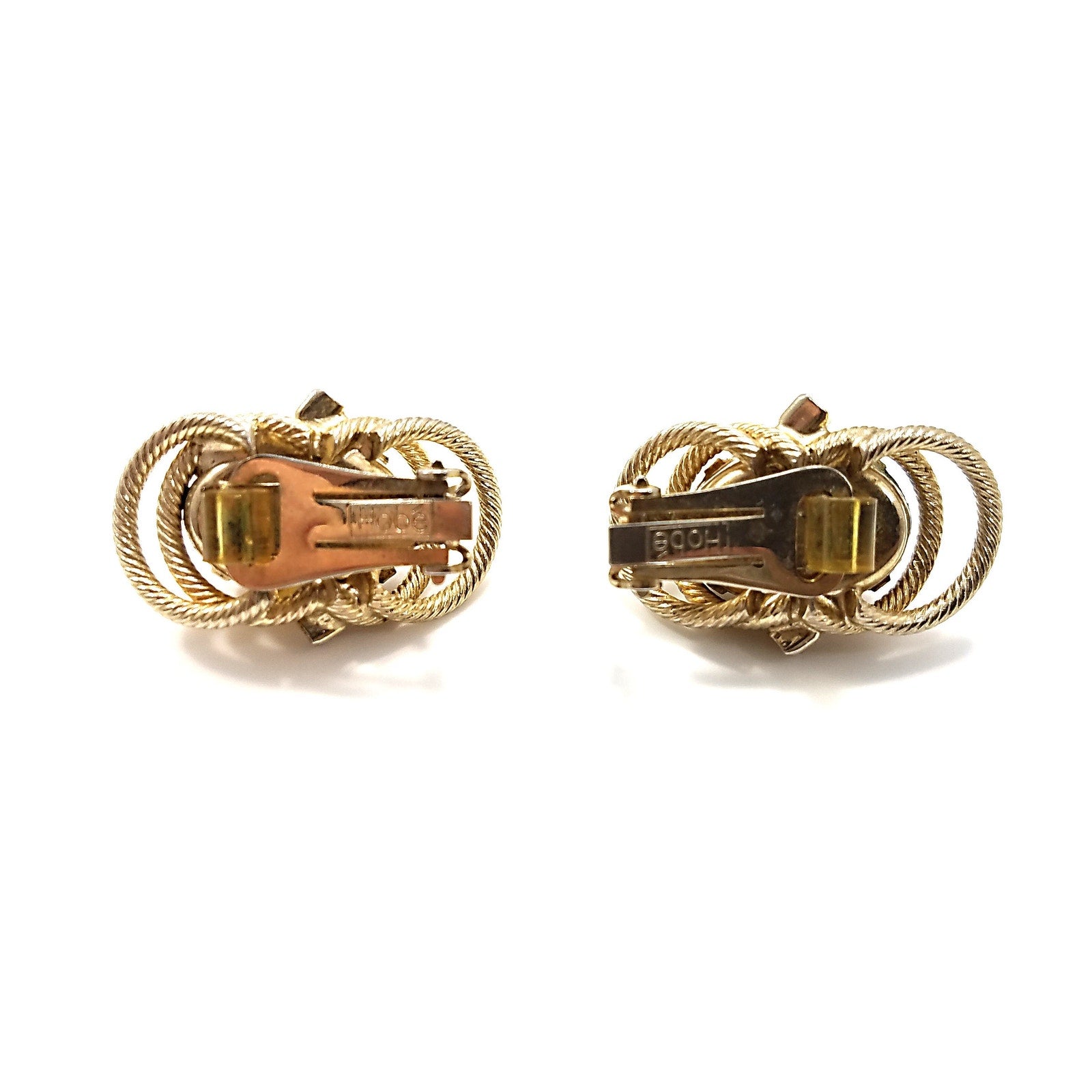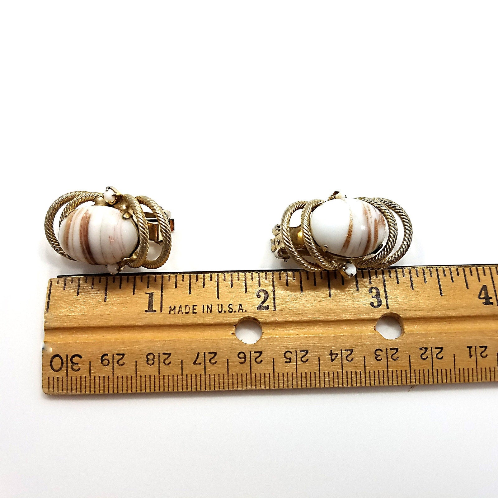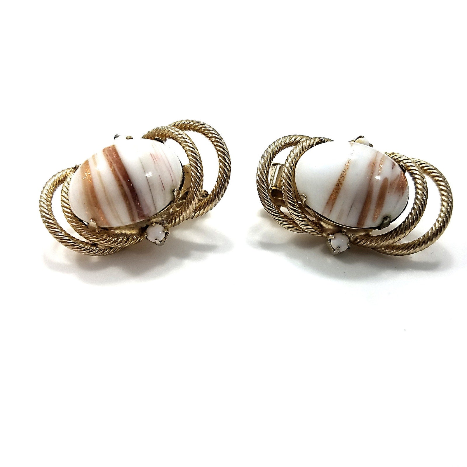*Description: Beautiful vintage HOBE' clip earrings from the 1950s. The oval cabochon is white glass with gold sparkling swirls across the width of the glass. The cabochon is prong set with two small white beads prong set on each side. The art glass is framed with two gold plated twisted ropes on the top and bottom of each length of each earring. This is a classic Hobe' set of earrings and would make an excellent gift or a wonderful addition to your vintage jewelry collection.