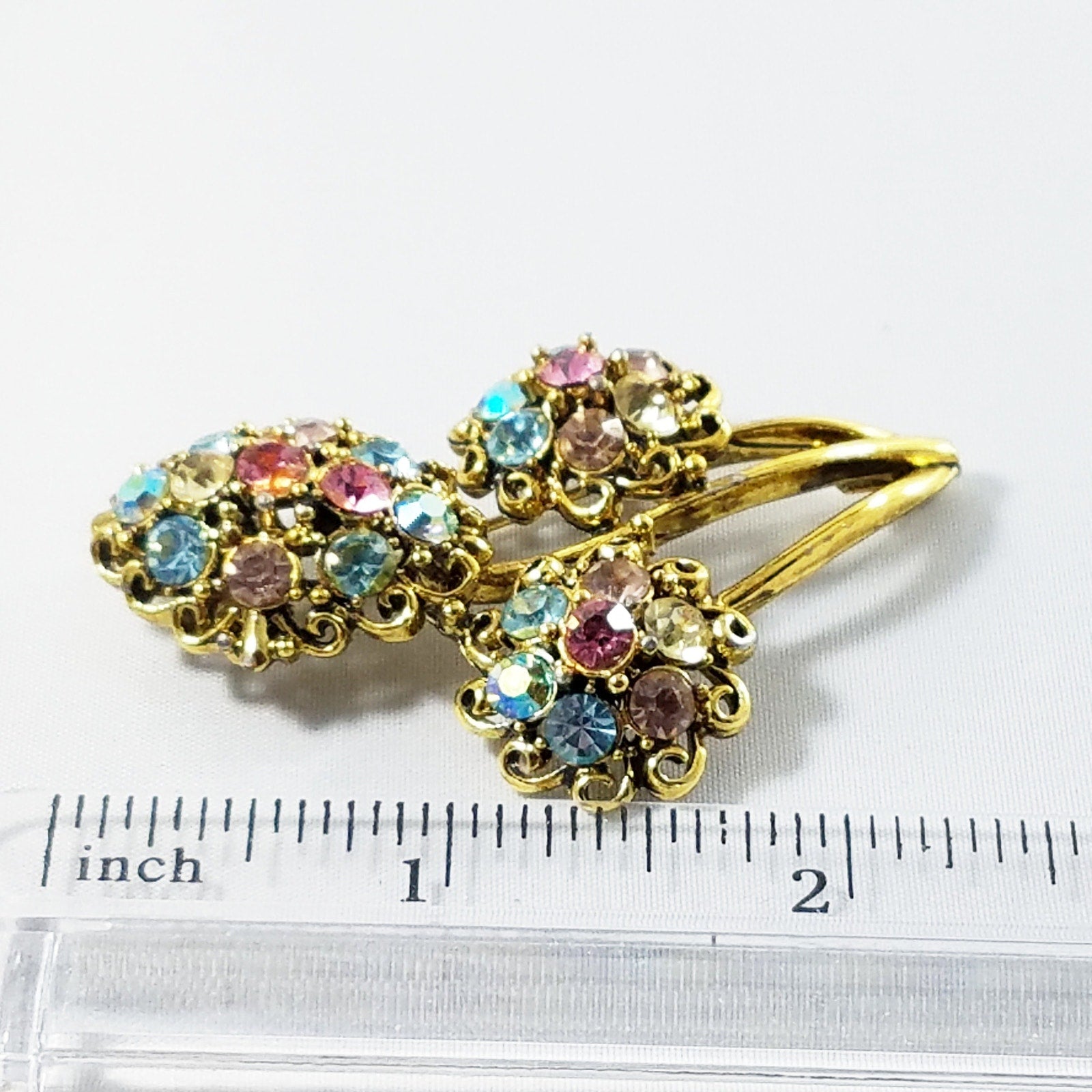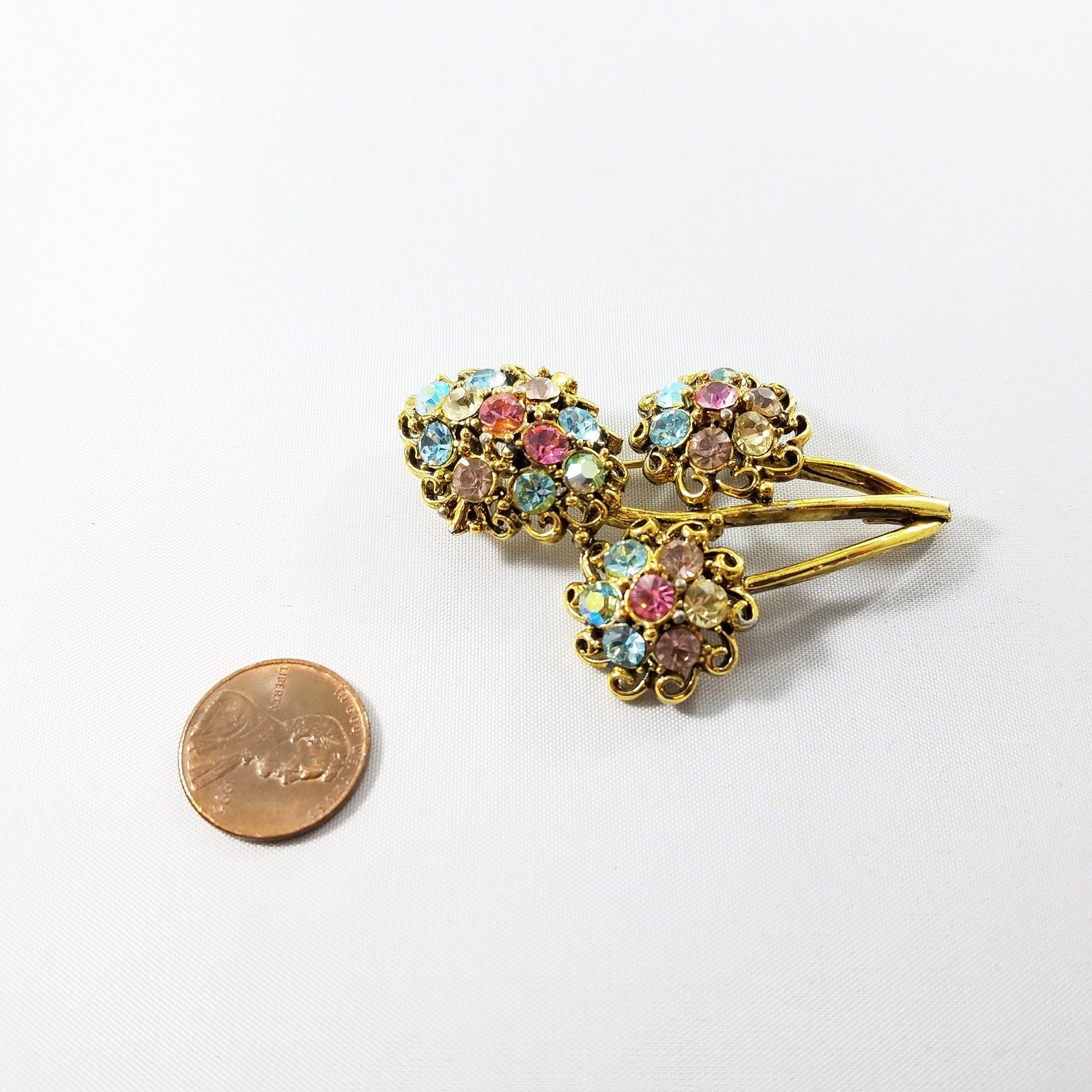 Add a touch of vintage elegance to your collection with this stunning Hollycraft brooch from the 1960s. This beautiful floral brooch features a lovely array of pastel rhinestones in pink, blue, lavender, yellow, and aurora borealis clear. Each stone is prong set in a gold tone filigree setting, designed in Hollycraft’s signature style.