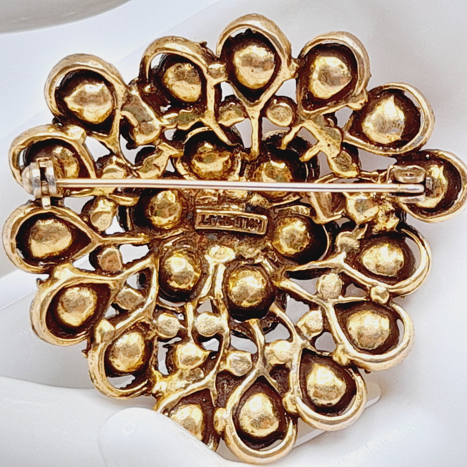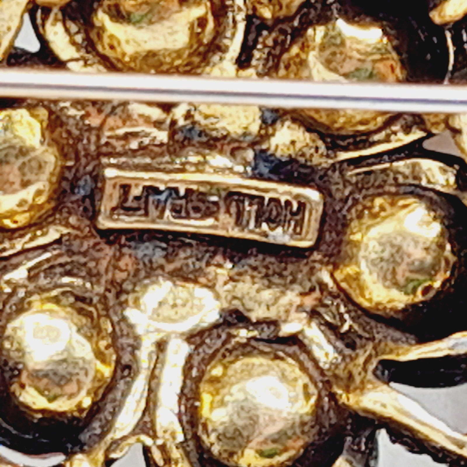 Hollycraft jewelry is highly collectible and admired for its distinctive use of color, texture, and layered construction. This brooch is a beautiful statement piece that would look stunning on a coat, dress, or even displayed in a jewelry collection.