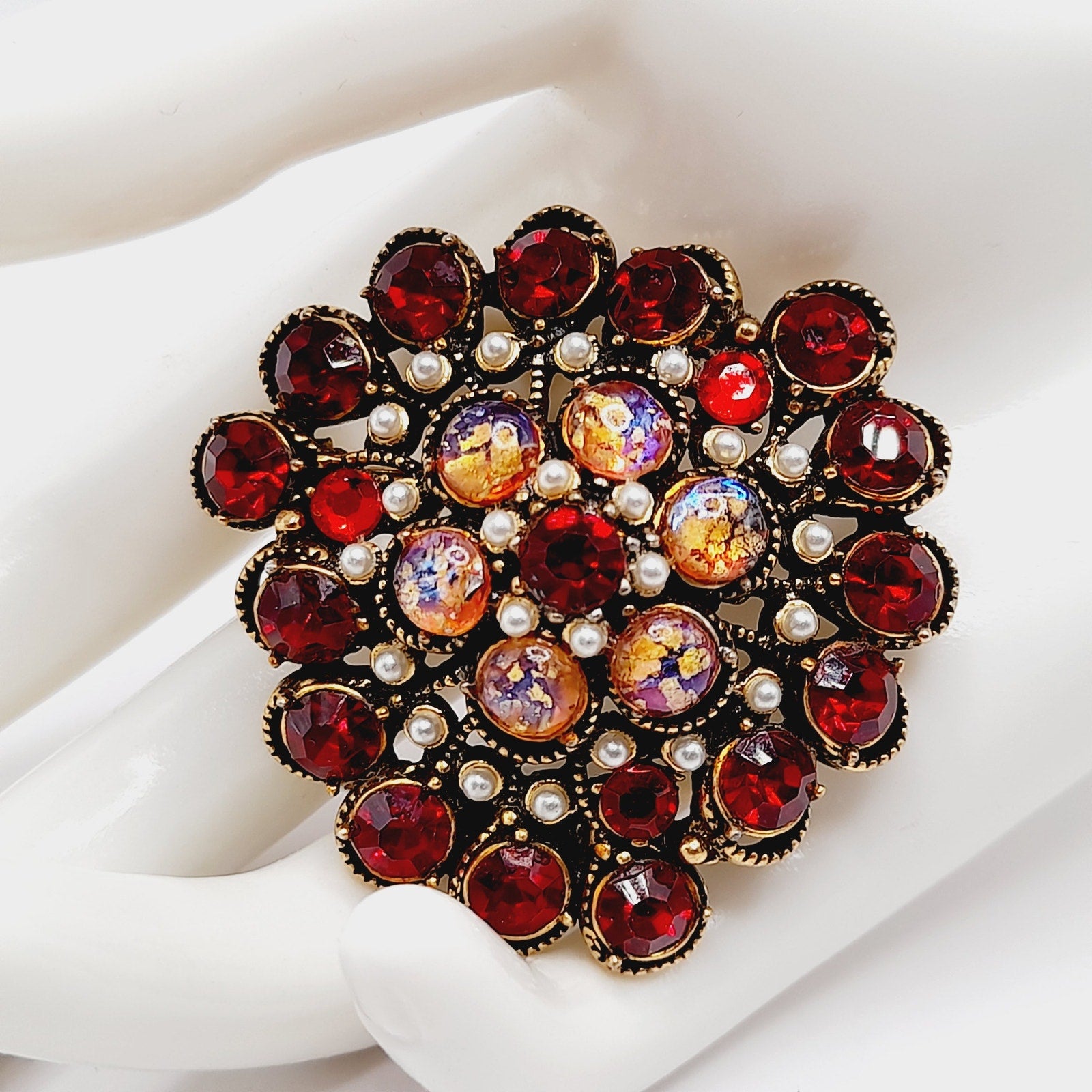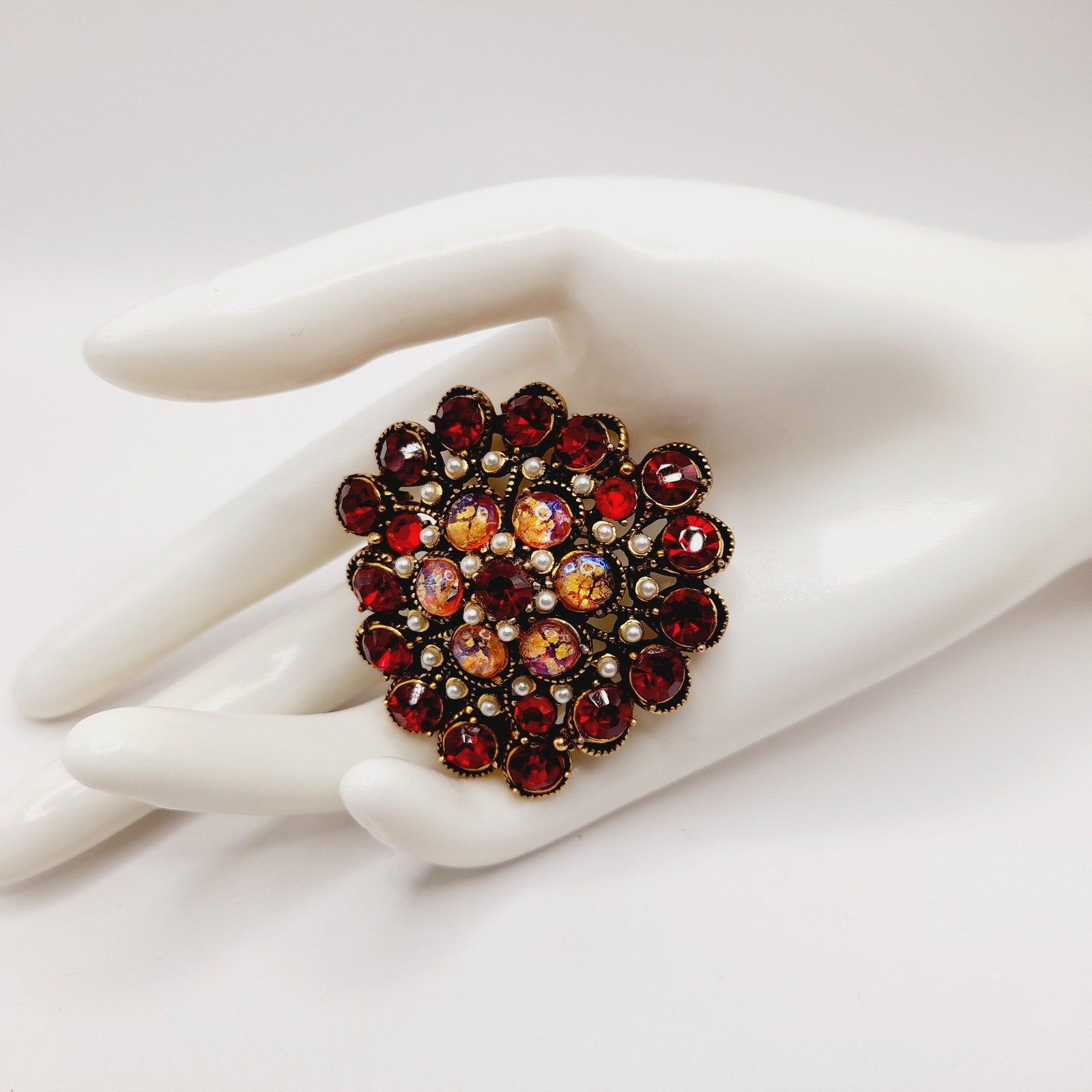 This is a striking vintage brooch by Hollycraft, dating from the 1950s. The brooch features a bold layered floral design with rich ruby red rhinestones, iridescent cabochons with gold flecks, and delicate faux pearl accents, all set in a warm gold tone setting. The design is intricate and dimensional, a hallmark of Hollycraft’s artistry.
