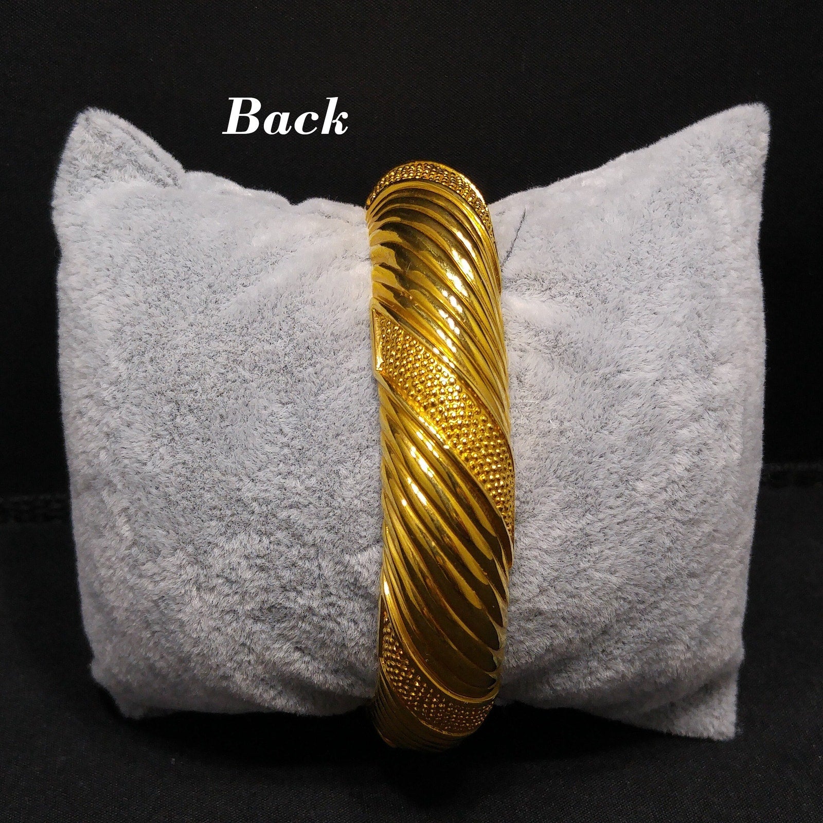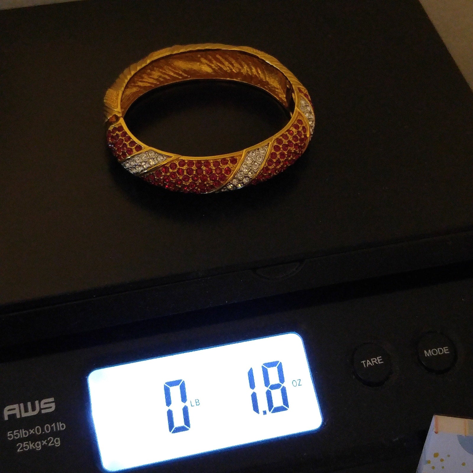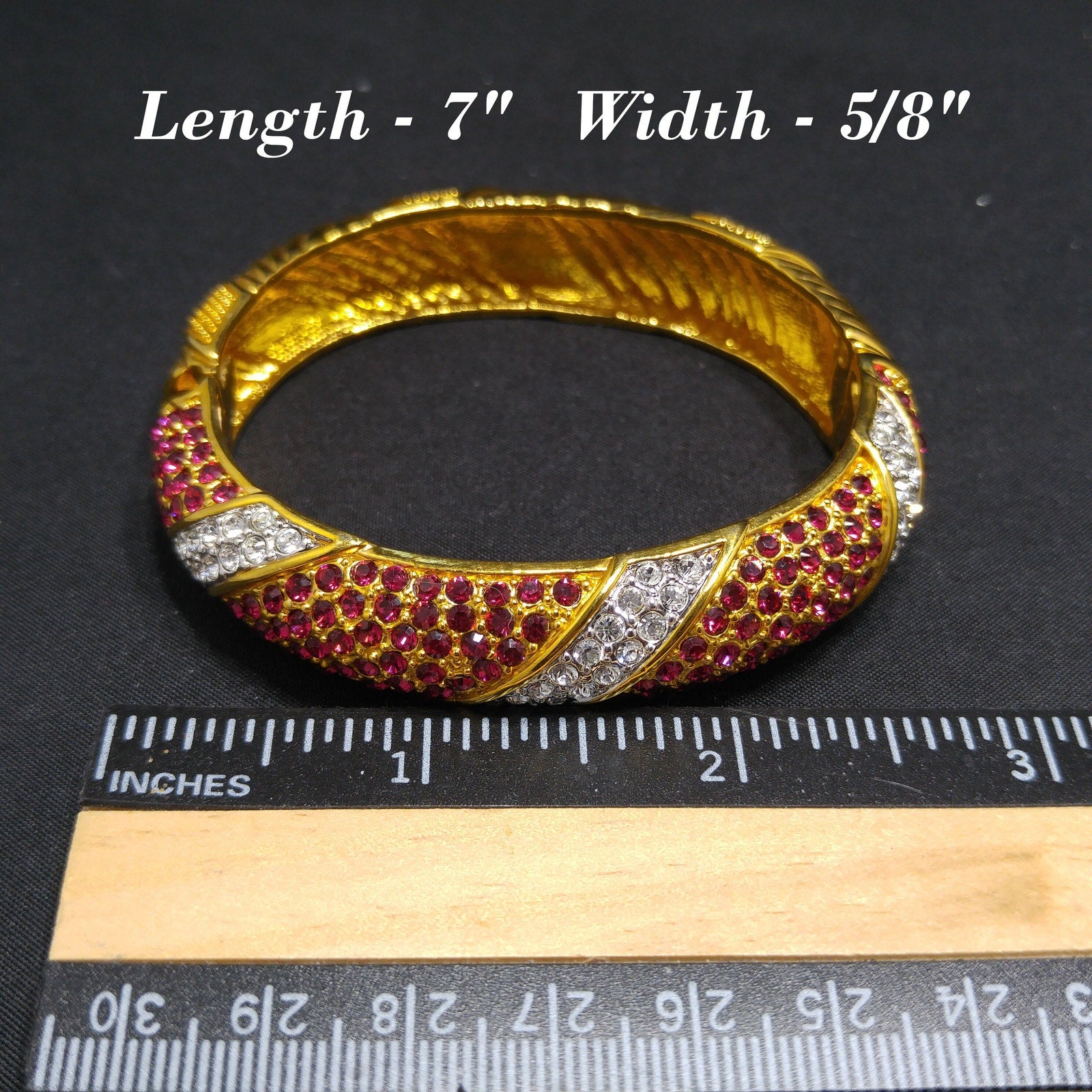 The bracelet features a bold diagonal swirl design, with sparkling red and clear rhinestones set into a richly gold-plated frame. The back is polished gold-tone with a hinged clasp for secure wear. This piece is both a collectible replica and a timeless statement bracelet, perfect for evening wear, special occasions, or any vintage jewelry collection.