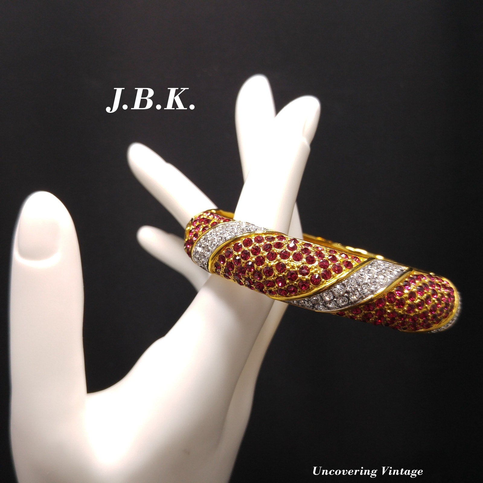 Jackie Kennedy Replica Hinged Bracelet, Camrose & Kross JBK, Red & Clear Rhinestones, 1990s Vintage Jewelry