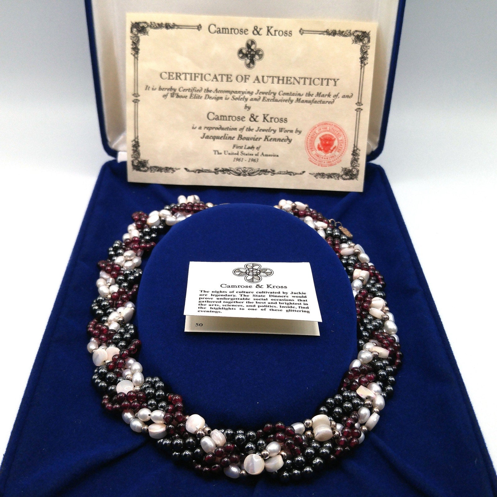 Step into timeless elegance with this Jackie Kennedy replica necklace by Camrose & Kross. Part of the JBK line introduced in the 1980s, this necklace is a faithful reproduction of a 1960s design worn by First Lady Jacqueline Bouvier Kennedy.