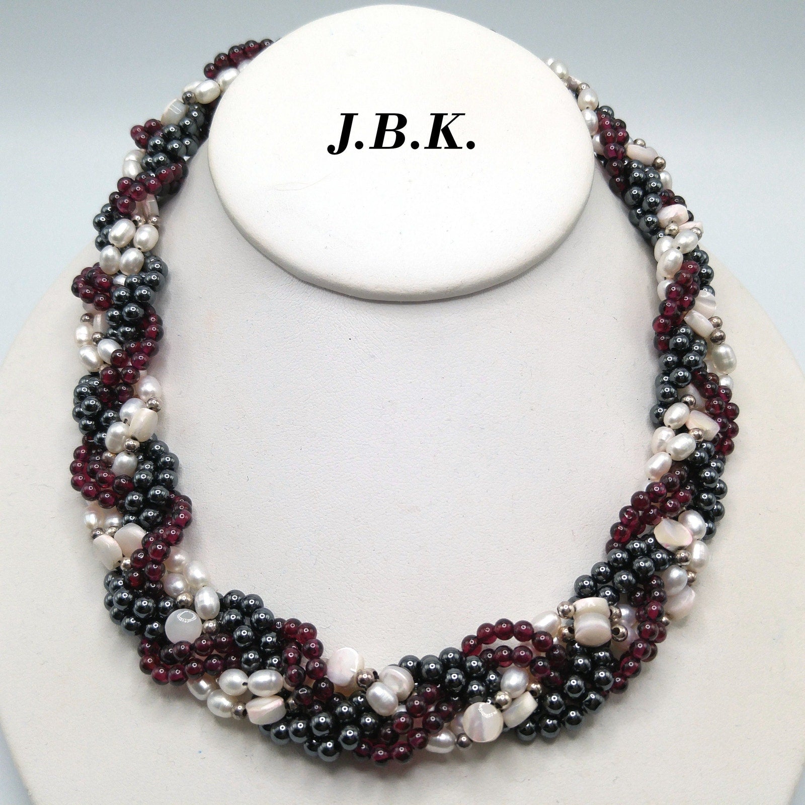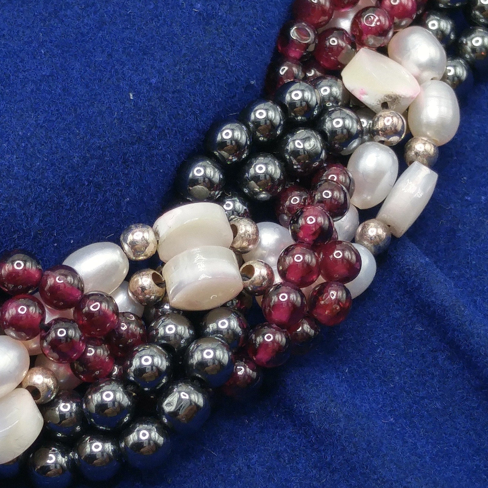 Materials: Garnet beads, hematite beads, faux pearls, mother of pearl accents