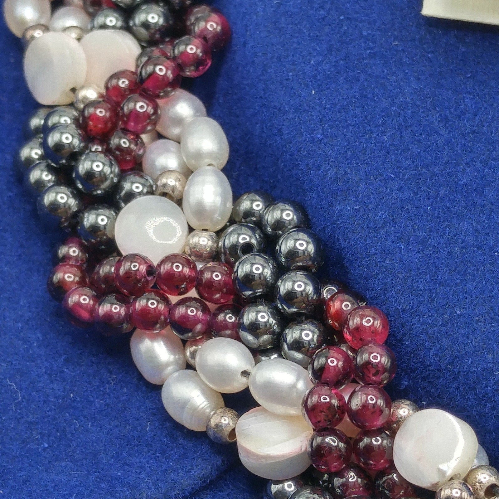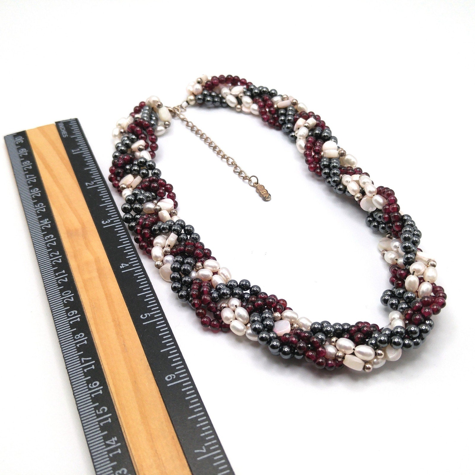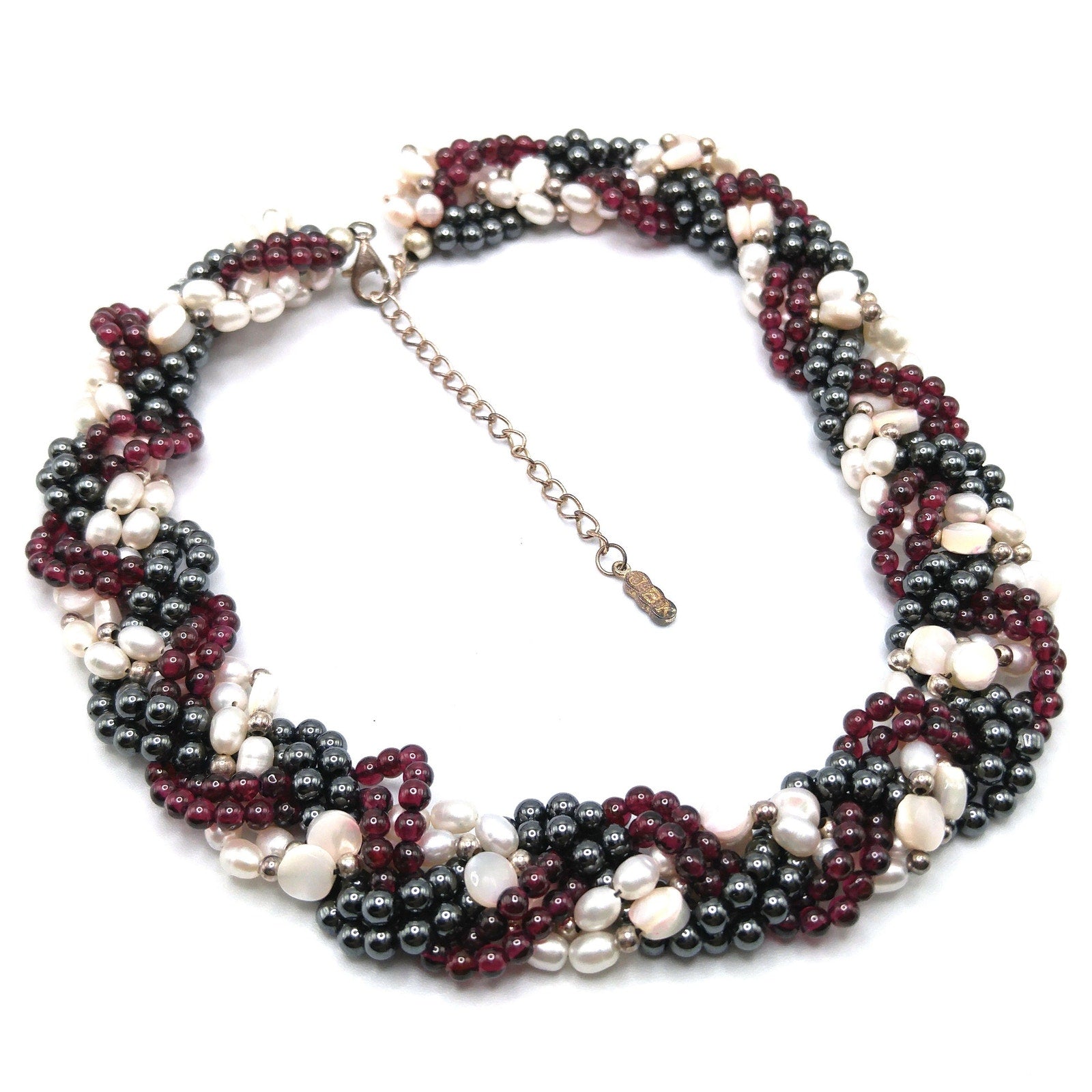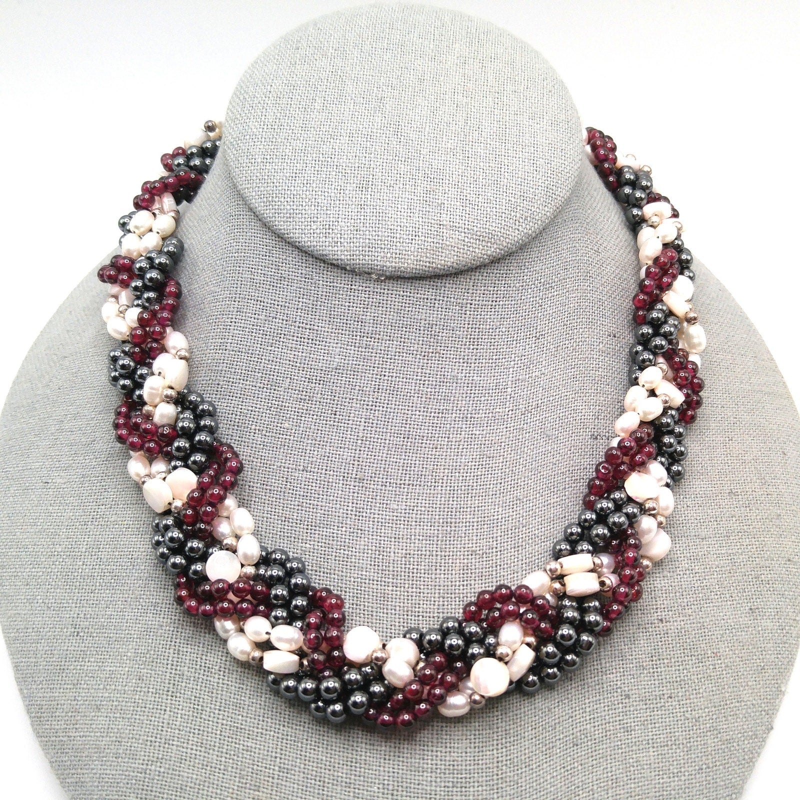 The necklace features a braided strand of garnet beads, hematite beads, and luminous faux pearls, woven together into a striking wide collar design. Measuring 19 inches long and 7/8 inch wide, it rests beautifully at the neckline. While there is minor wear on the clasp (at the back of the neck), the beads remain brilliant and eye-catching.