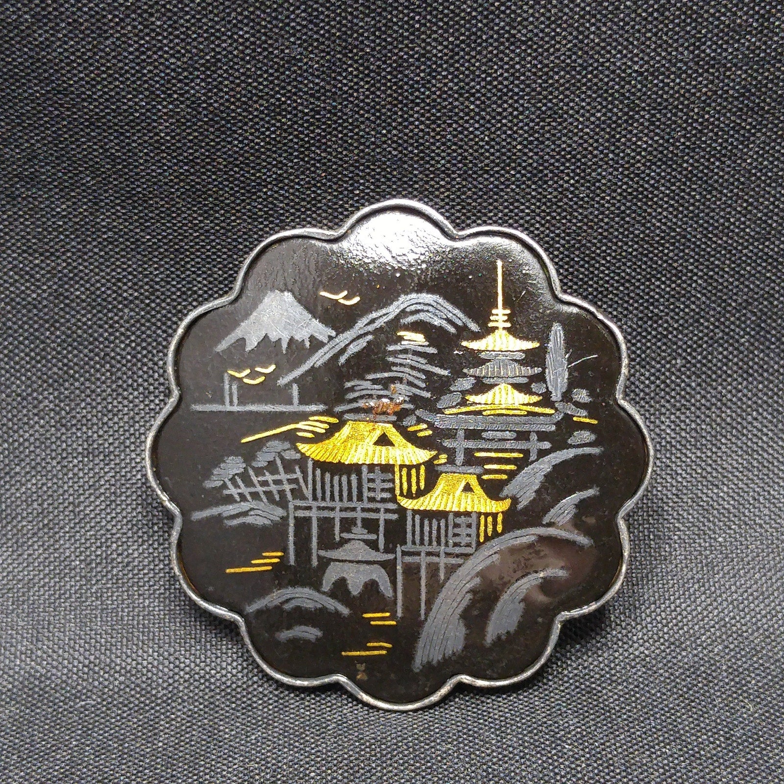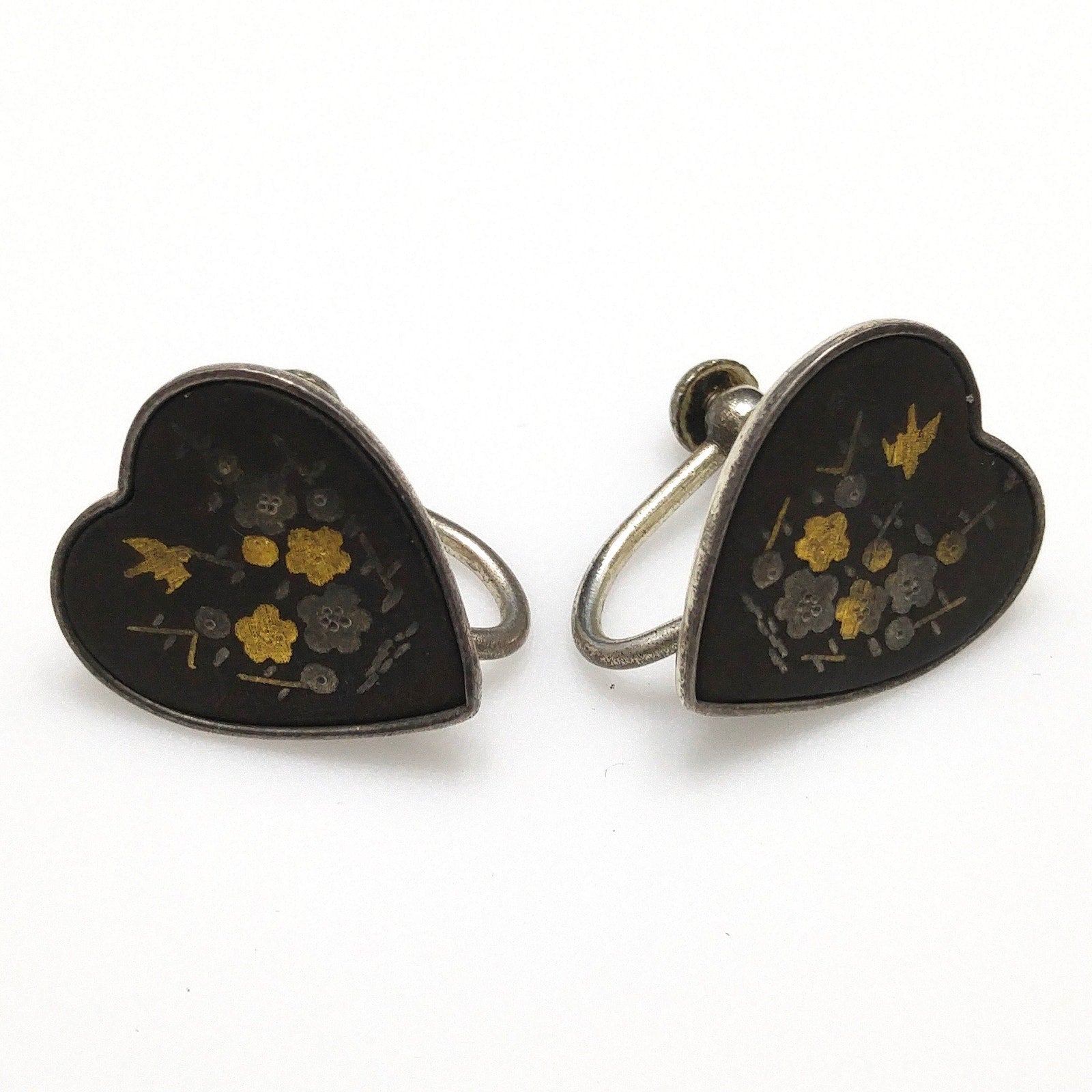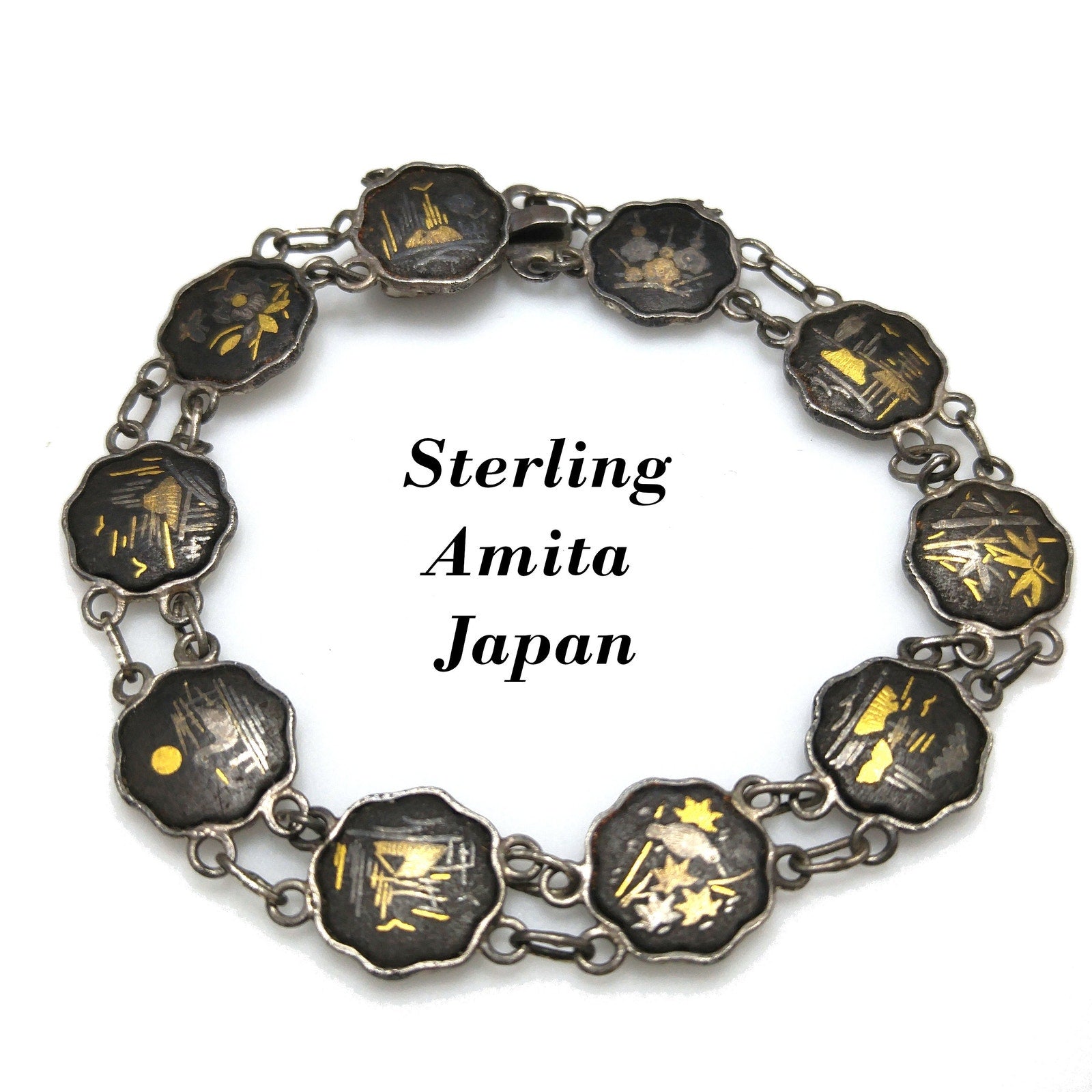 *Description: This is a beautiful example of Japanese Damascene Jewelry from the 1940s. On the bracelet, there are 10 storytelling panels with many landscapes, flowers, and animals in Japan. The back of each storytelling panel is signed by the designer. The sterling had a plating over the top which is showing wear, only on the back of the bracelet. The bracelet is stamped STERLING AMITA JAPAN on the clasp. The next item is a brooch which is stamped SILVER JAPAN and has pagodas with Mount Fuji in the background. The screw back earrings are floral with a bird flying overhead and they are also stamped SILVER JAPAN. Damascene jewelry uses a gorgeous technique in which precious metals are folded together to create tiny images against a background of blackened metal; niello. The technique used in Japan to decorate accessories for Japanese swords, but later was used for jewelry and small boxes. This would be a great addition to your vintage jewelry collection or make a great vintage gift!