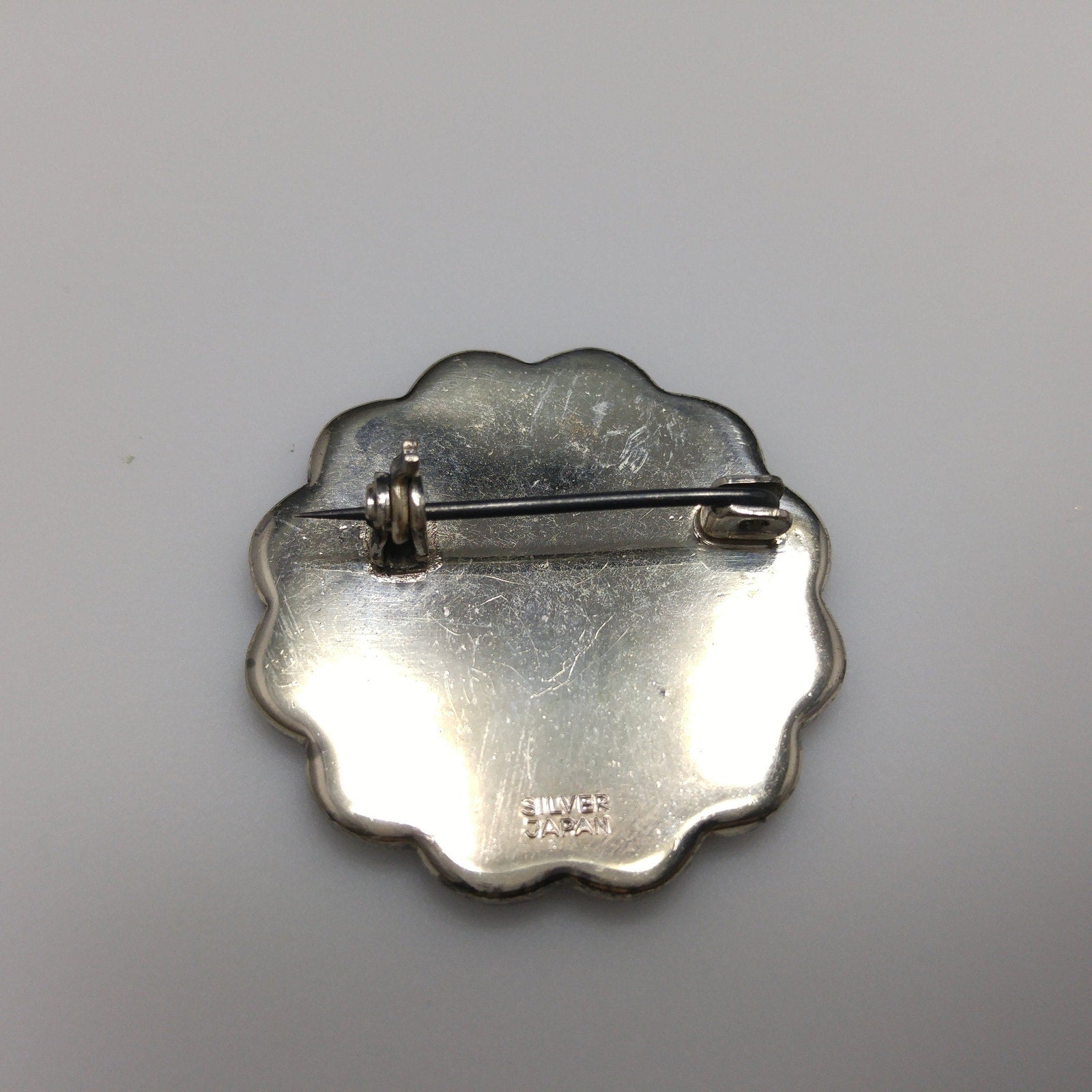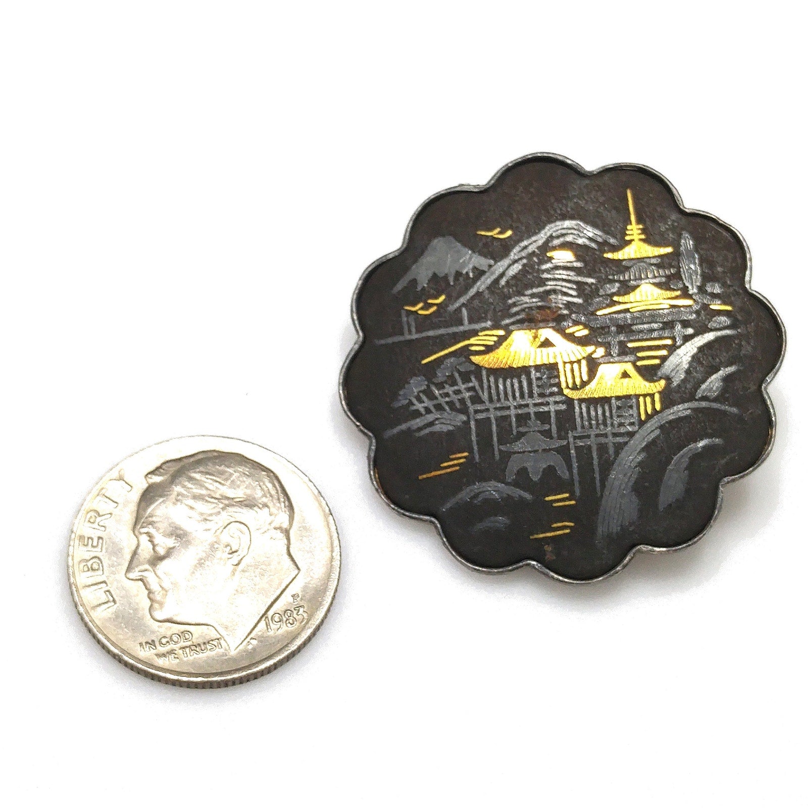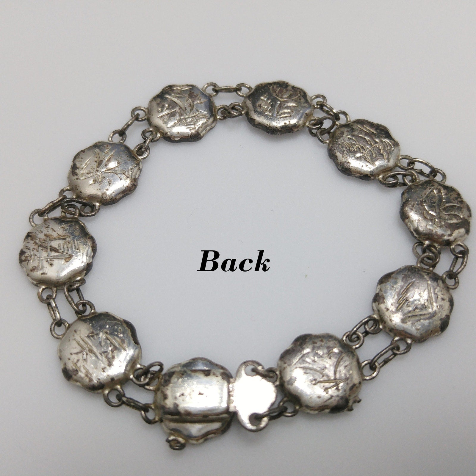 *Description: This is a beautiful example of Japanese Damascene Jewelry from the 1940s. On the bracelet, there are 10 storytelling panels with many landscapes, flowers, and animals in Japan. The back of each storytelling panel is signed by the designer. The sterling had a plating over the top which is showing wear, only on the back of the bracelet. The bracelet is stamped STERLING AMITA JAPAN on the clasp. The next item is a brooch which is stamped SILVER JAPAN and has pagodas with Mount Fuji in the background. The screw back earrings are floral with a bird flying overhead and they are also stamped SILVER JAPAN. Damascene jewelry uses a gorgeous technique in which precious metals are folded together to create tiny images against a background of blackened metal; niello. The technique used in Japan to decorate accessories for Japanese swords, but later was used for jewelry and small boxes. This would be a great addition to your vintage jewelry collection or make a great vintage gift!