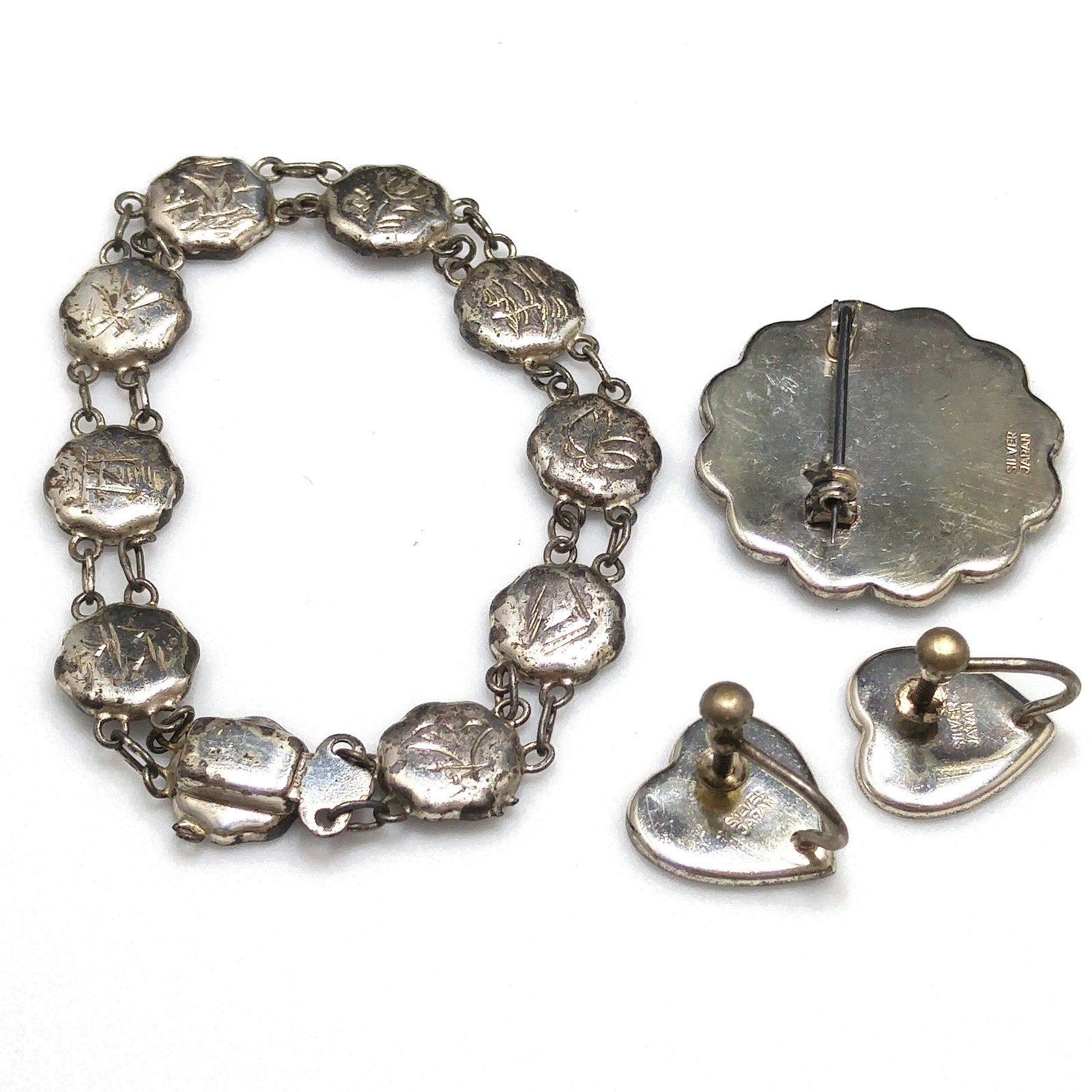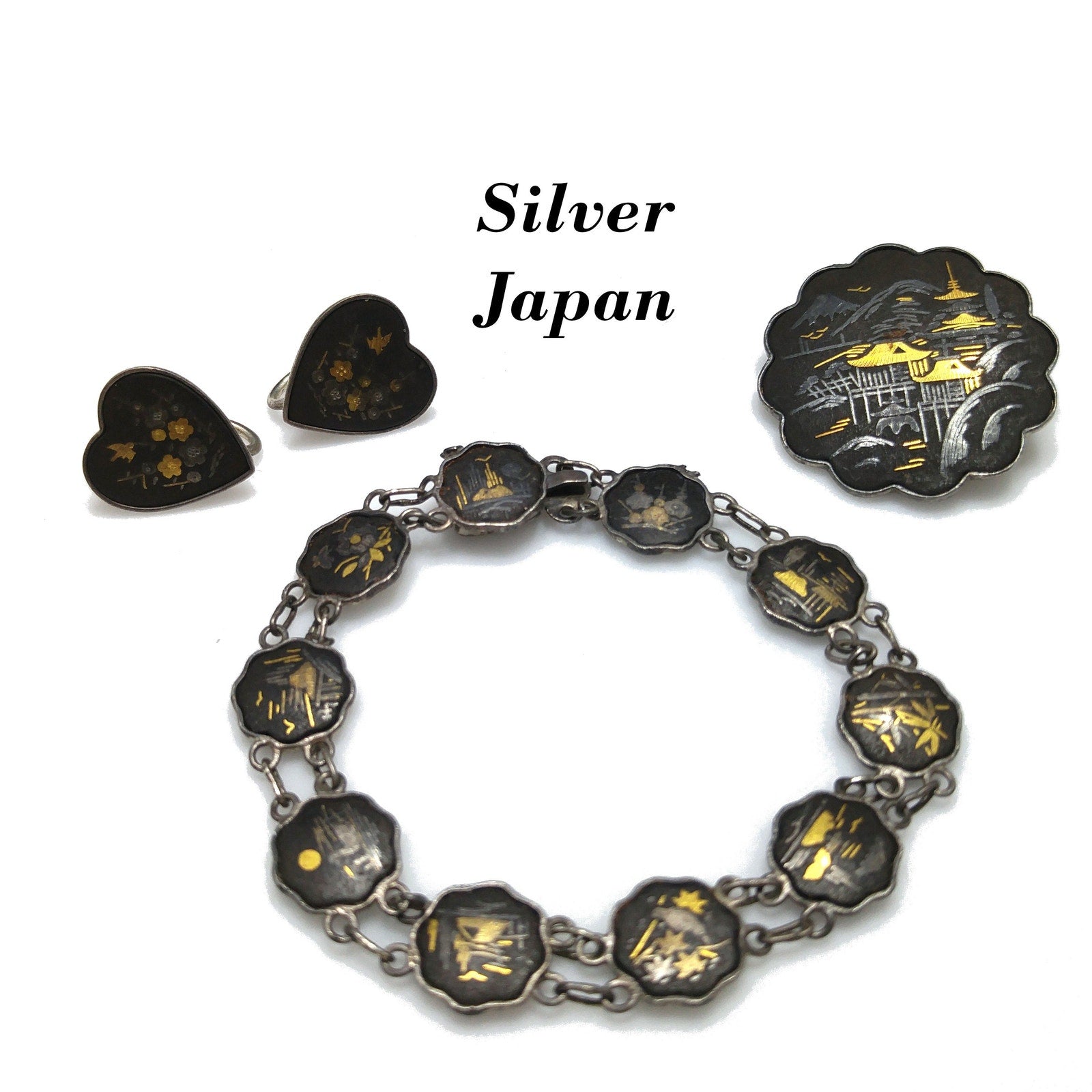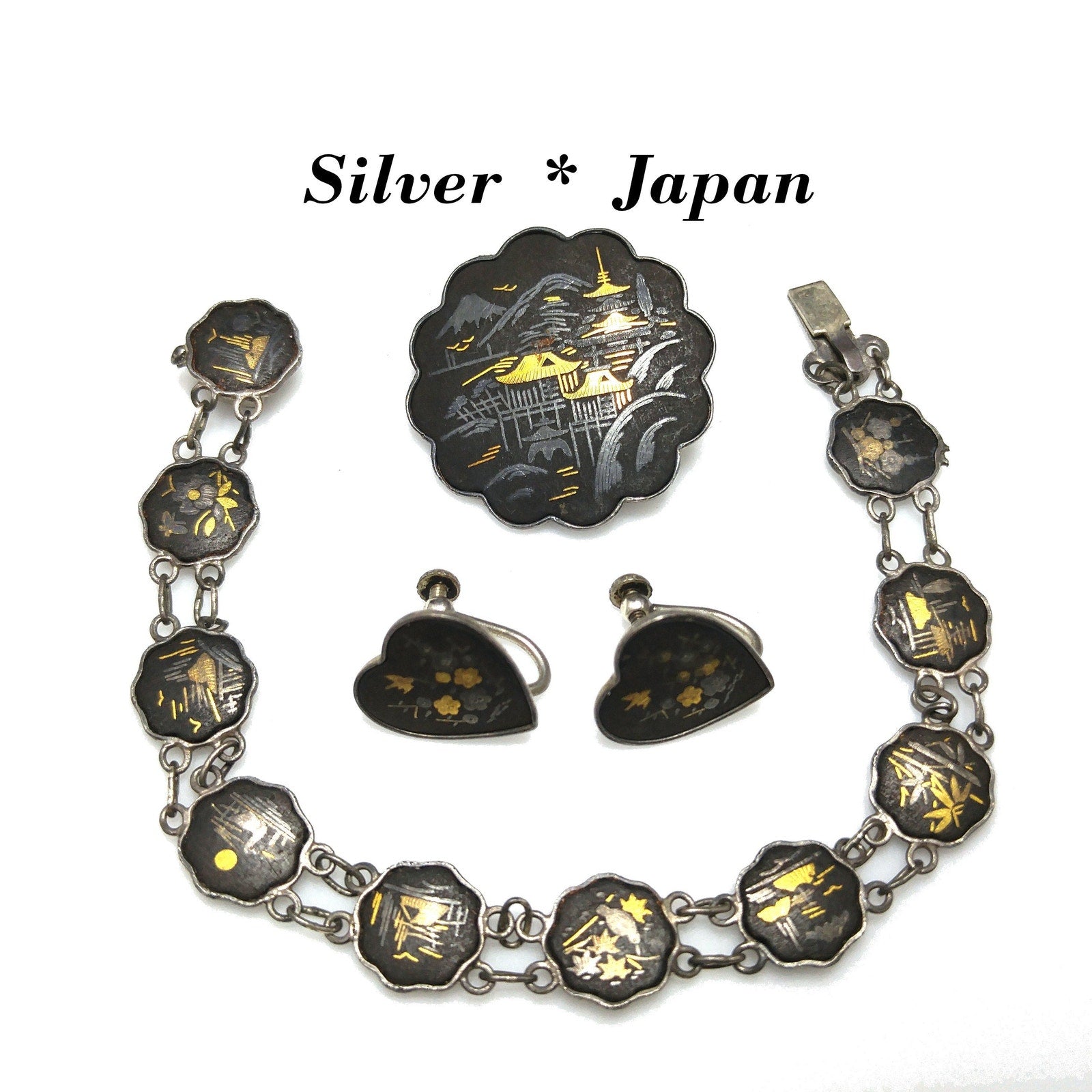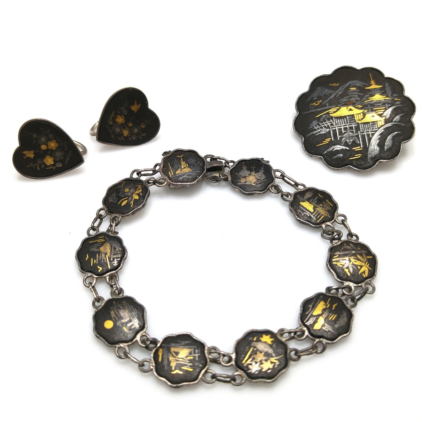 Japanese Damascene Silver Jewelry, Bracelet Brooch Earrings, 1940s Vintage Jewelry