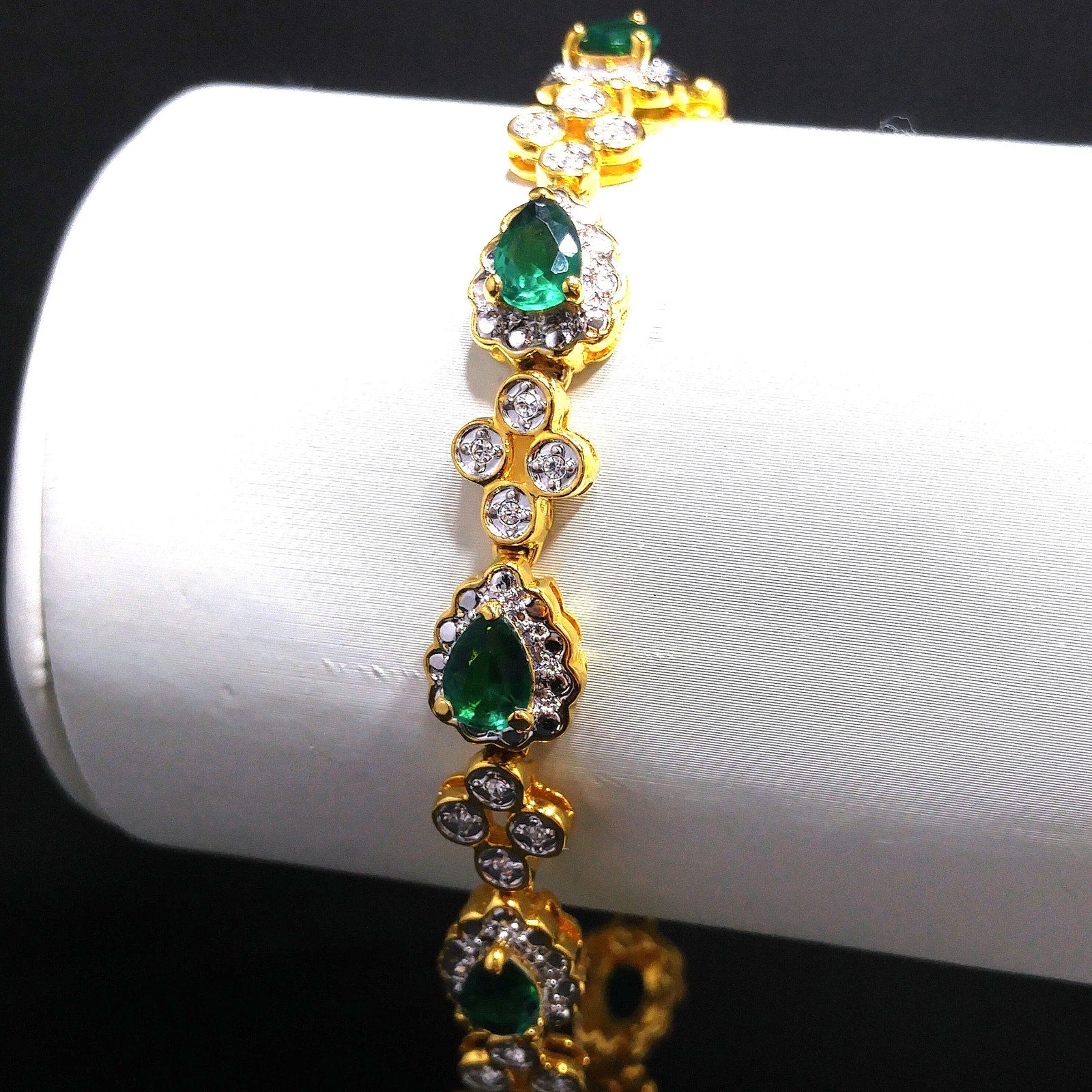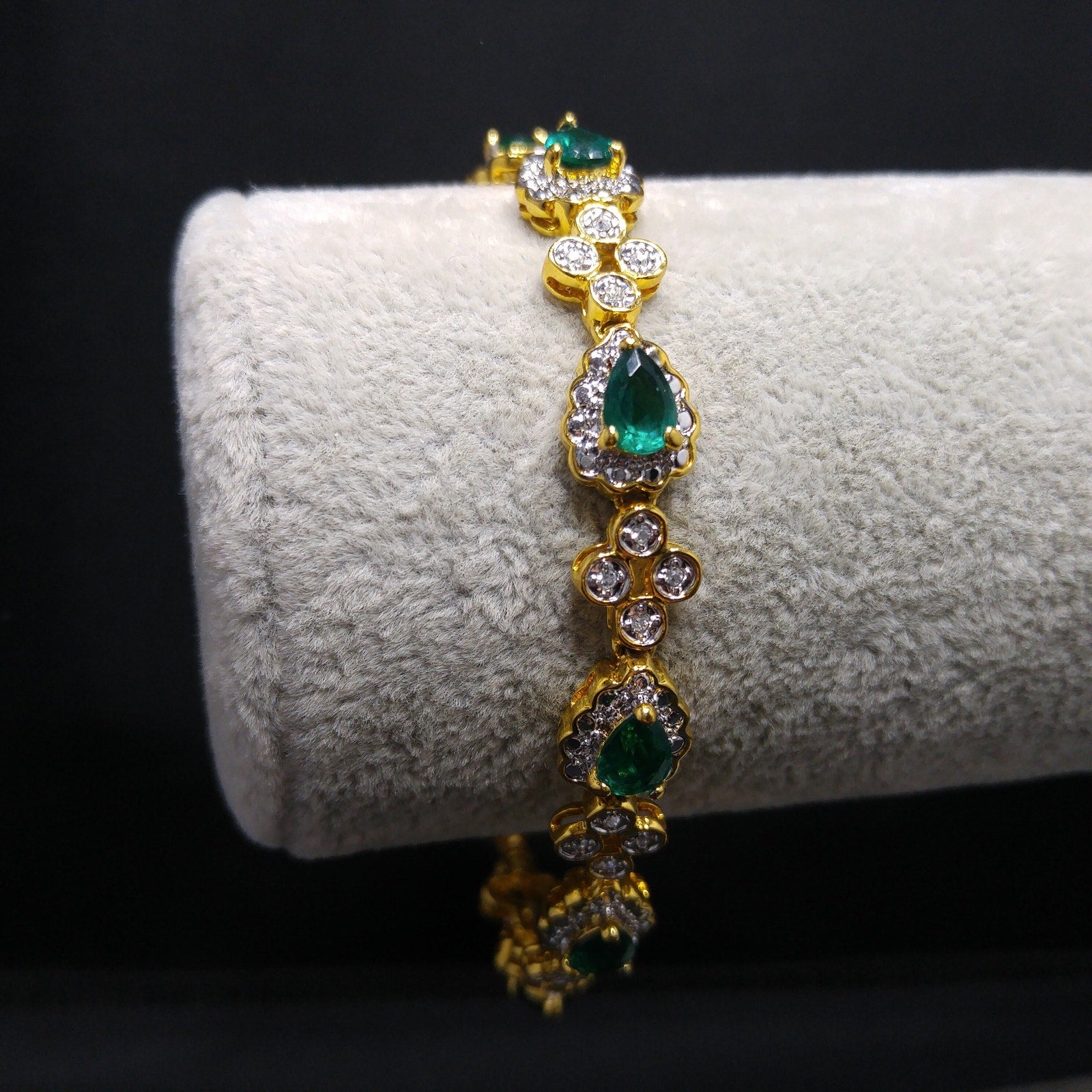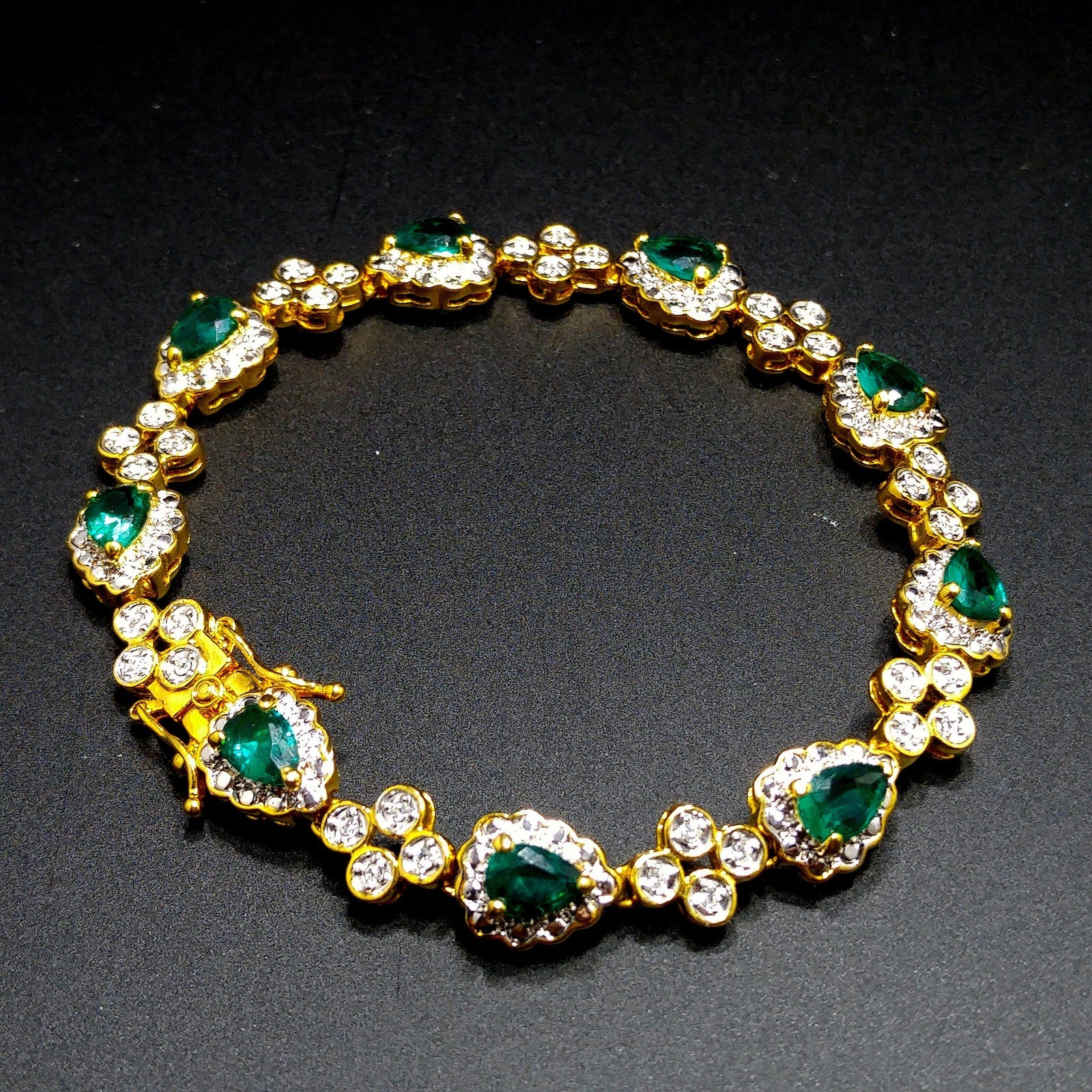 The design features teardrop-shaped emerald green rhinestones surrounded by sparkling clear rhinestones, set in gold-tone metal. The original bracelet worn by Jackie featured diamonds and emeralds; this replica captures the same timeless elegance in high-quality costume materials.