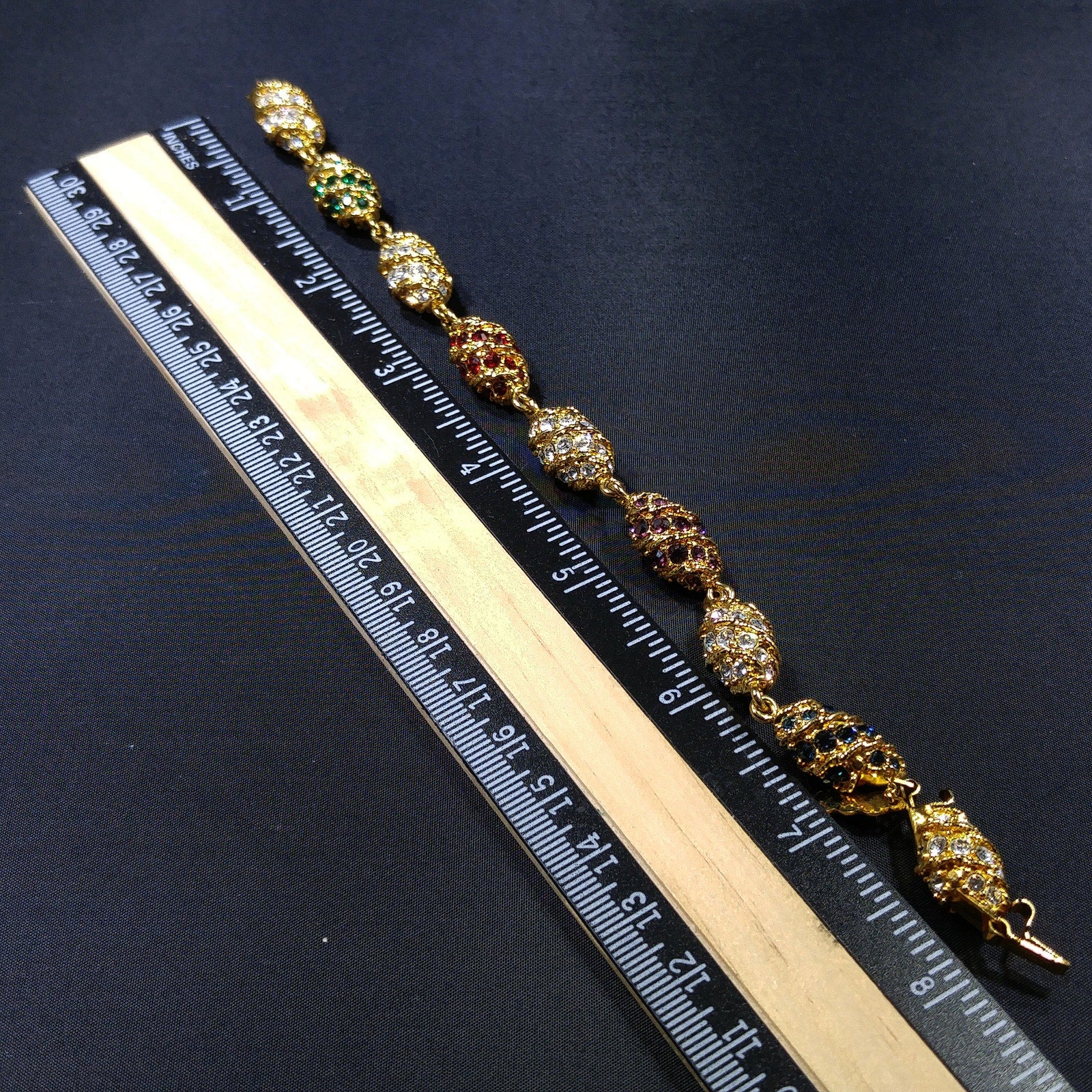 This is a stunning Jackie B. Kennedy (JBK) rhinestone bracelet, a faithful replica of the “Royal Color Egg Bracelet” gifted to Jackie by Aristotle Onassis for Easter in 1969. The bracelet features richly detailed egg-shaped links, each set with sparkling rhinestones designed to resemble precious gems—faux sapphires, emeralds, rubies, amethysts, and diamonds.