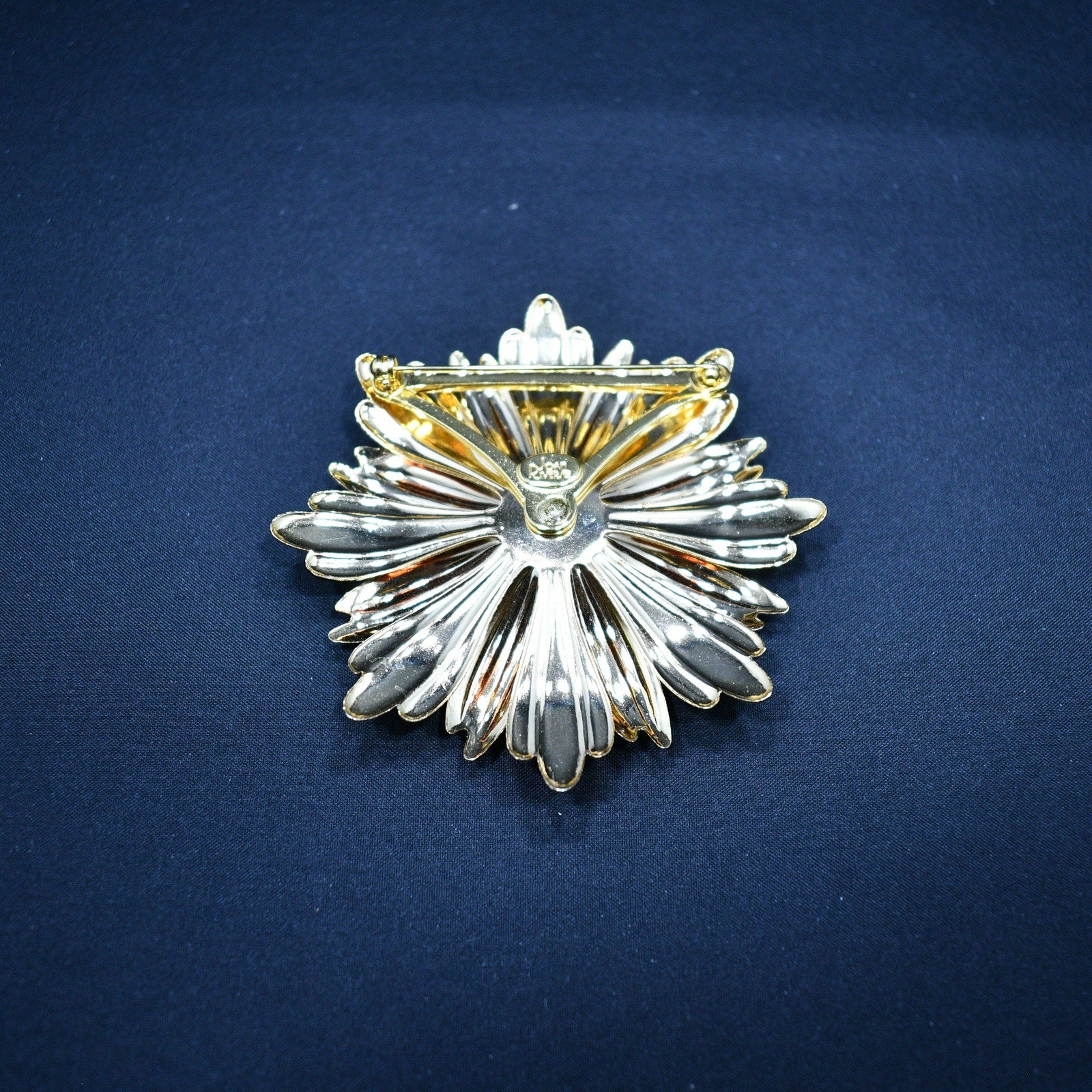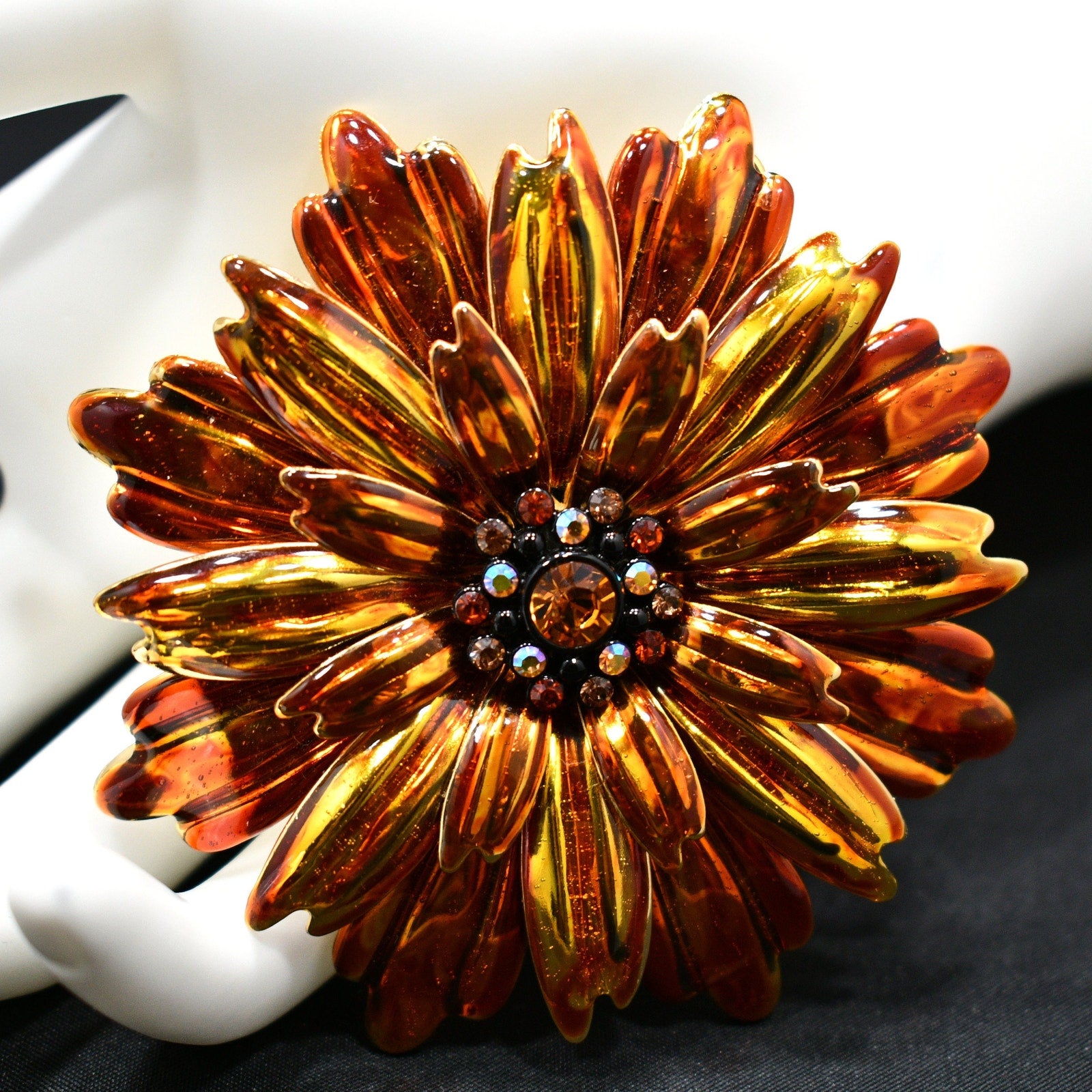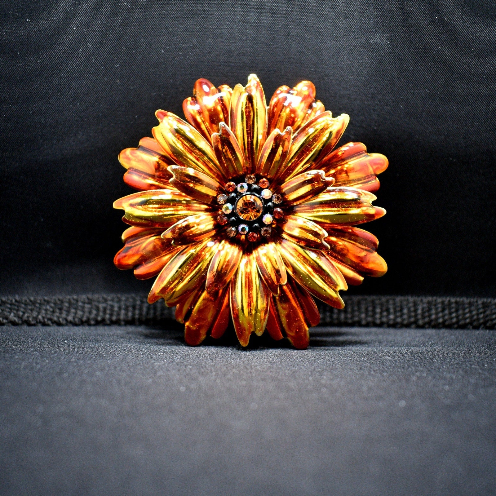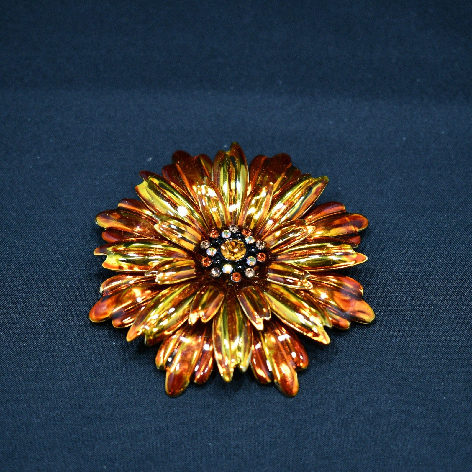 *Description: This is a beautiful Joan Rivers chrysanthemum flower brooch on gold plated metal with orange enamel and rhinestones in the center from the 1990s. This large brooch is 3 1/8 Inches in length and width and is light in weight at 1.3 ounces. This brooch would be a lovely addition to a jacket, hat, or bag and would be a great addition to your vintage jewelry collection or make a great vintage gift!