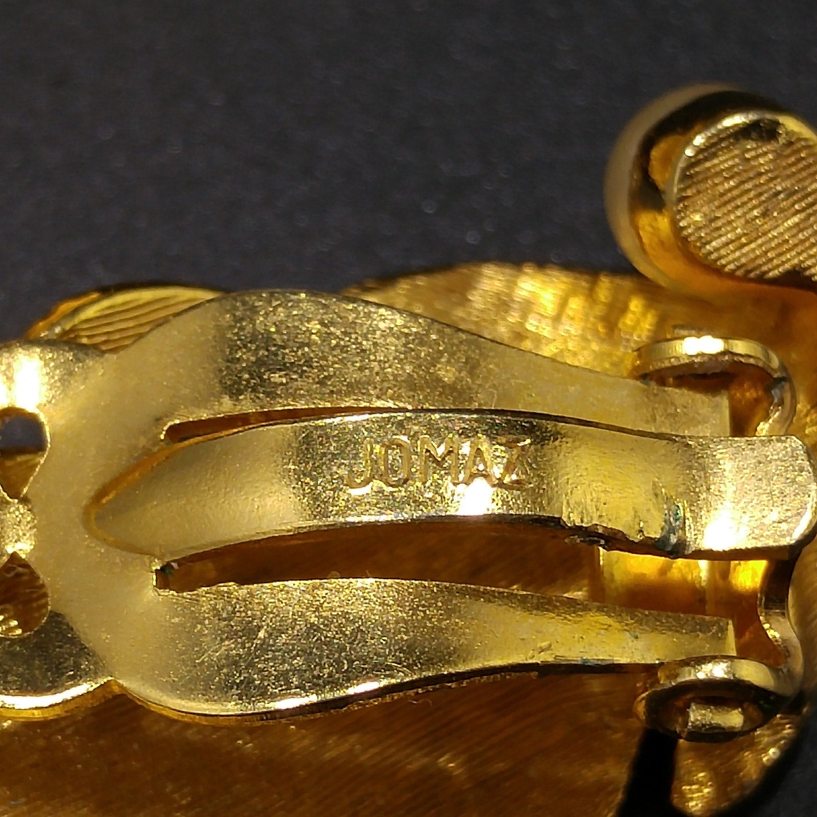 Step into the glamour of the late 1940s to early 1950s with this exquisite Jomaz leaf jewelry set, beautifully preserved and richly detailed. This elegant demi-parure features a sweeping leaf brooch and matching clip-on earrings, each designed with textured gold-tone leaves that seem to flutter in a gentle breeze. The opposite side of each leaf glitters with clear pavé rhinestones, creating the perfect contrast between matte brilliance and sparkling fire.