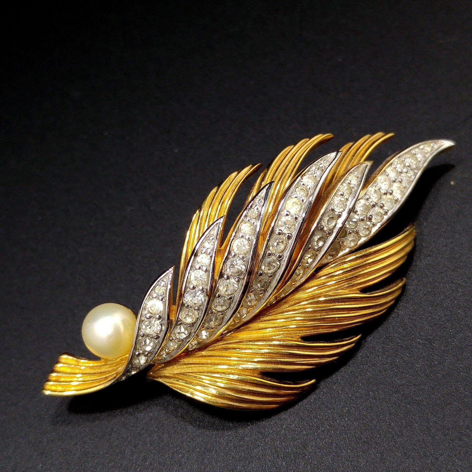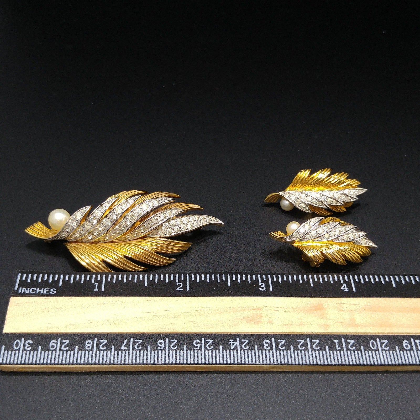 Jomaz Leaf Brooch Earrings Set 1940s 50s Gold Pave Rhinestones Pearl Vintage
