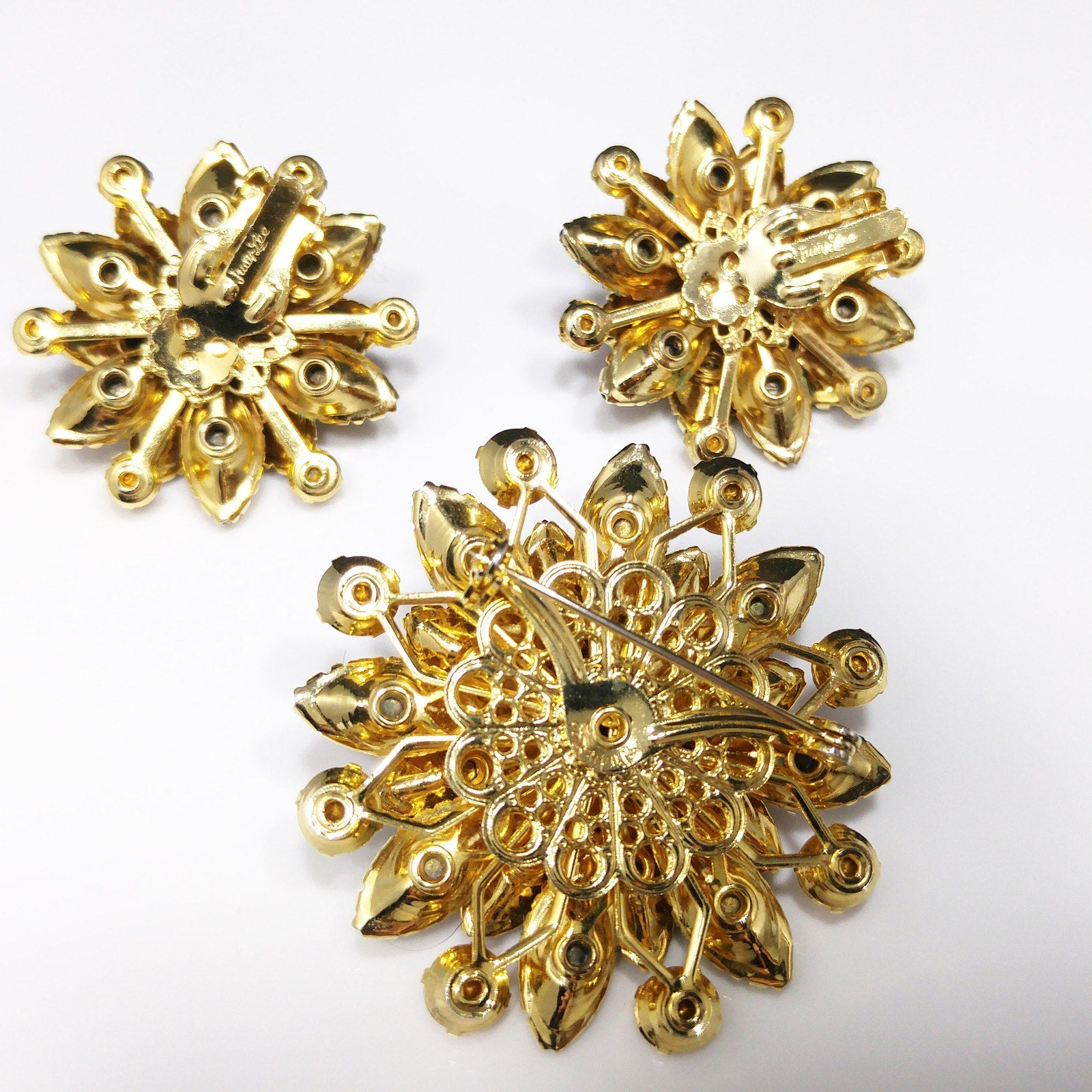 Judy Lee Topaz Rhinestone Brooch & Earrings Set, Gold Plated, Aurora Borealis, 1960s